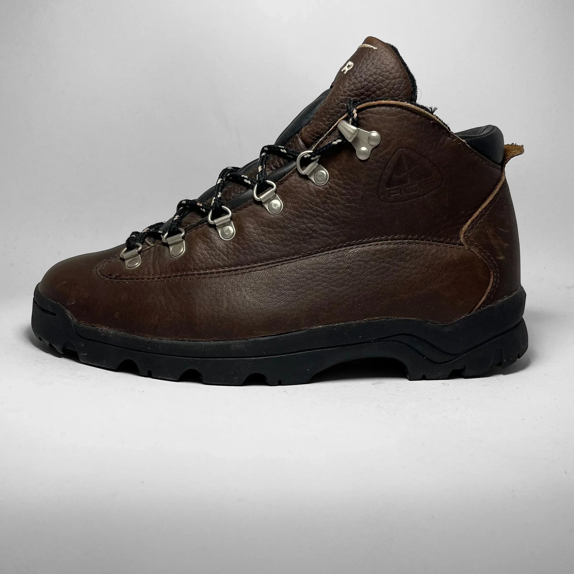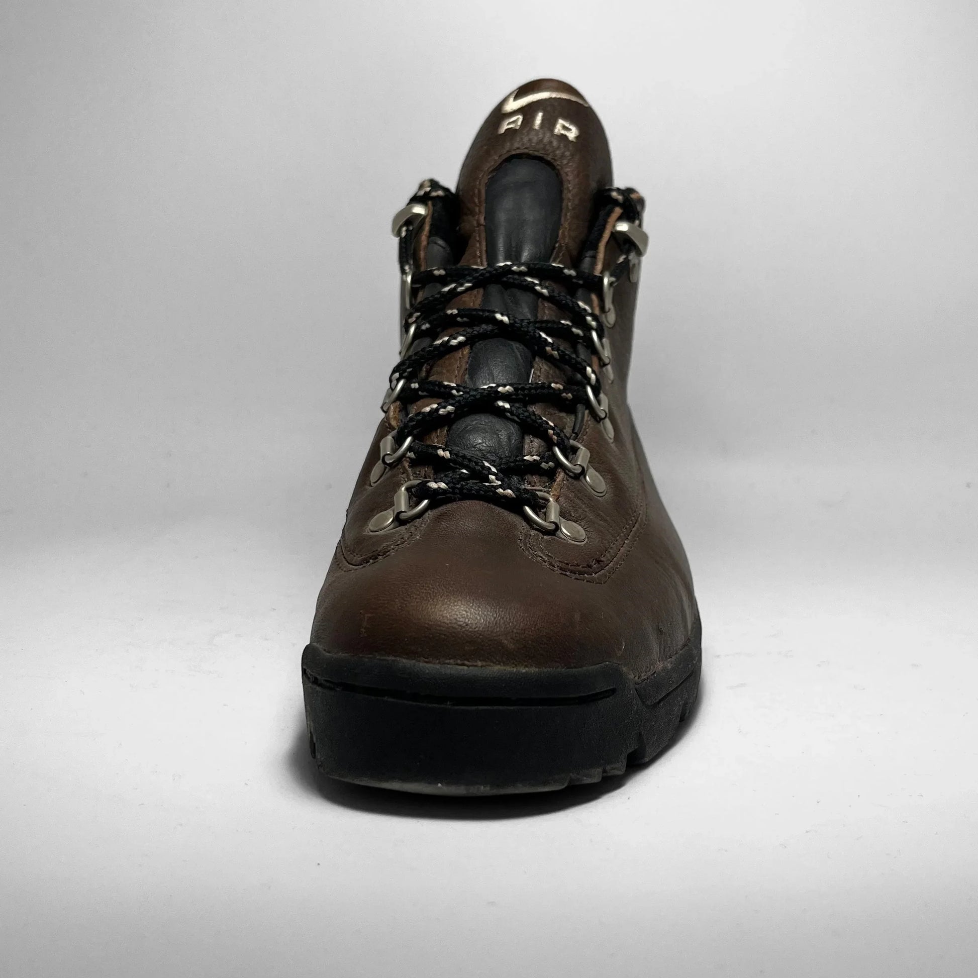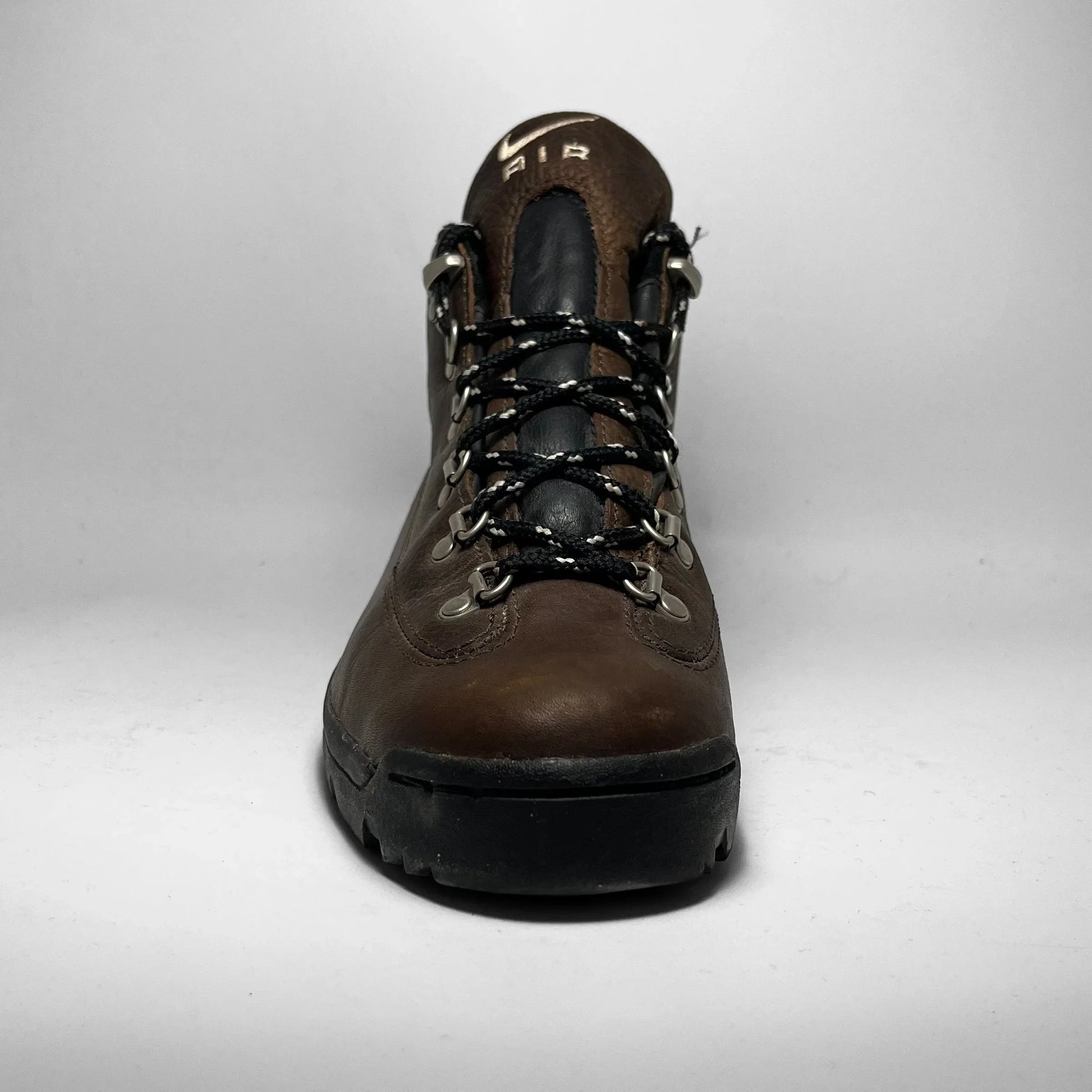 A rugged hiking boot built for durability and comfort. It features a premium brown leather upper with metal D-ring eyelets for secure lacing, a padded black collar, and a reinforced toe for protection. The black rubber outsole has deep, aggressive treads with an ACG-branded orange insert, ensuring solid traction on rough terrain. The iconic Nike ACG logo is subtly embossed on the side, and the tongue sports a small Swoosh with “AIR” branding. A rare and functional gem from Nike’s All Conditions Gear line.