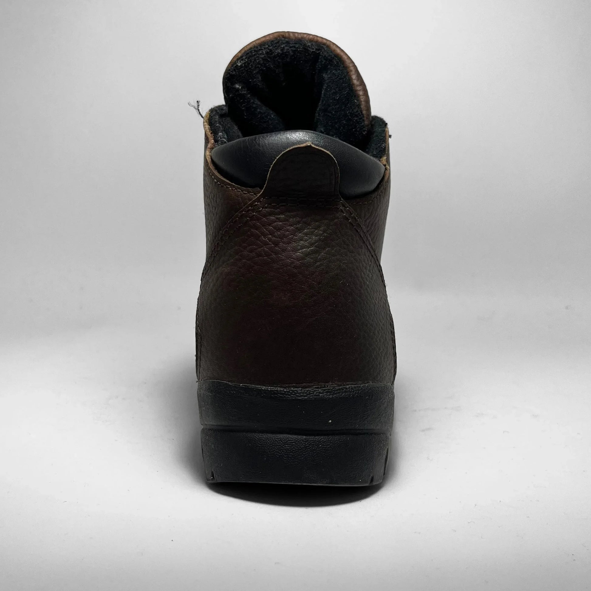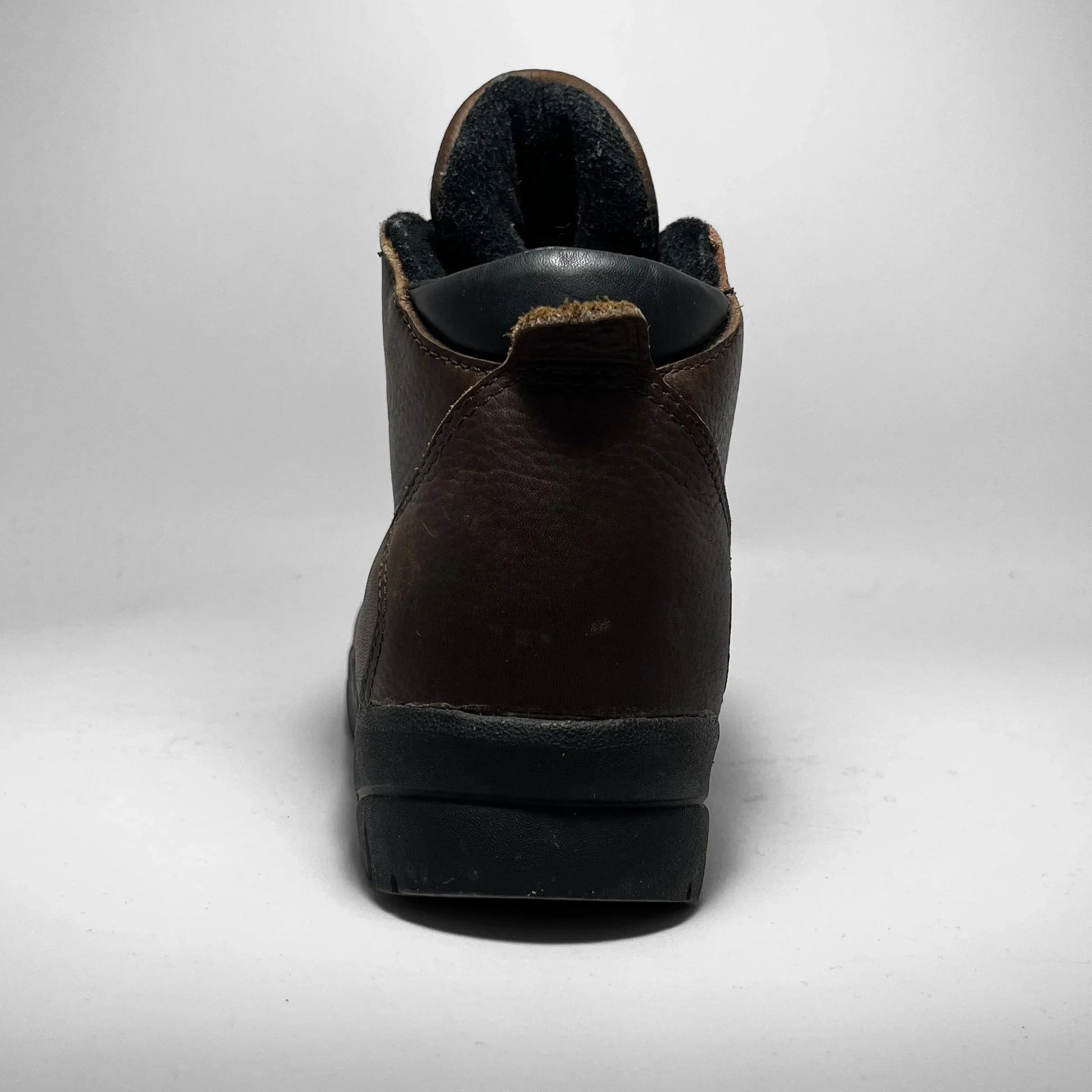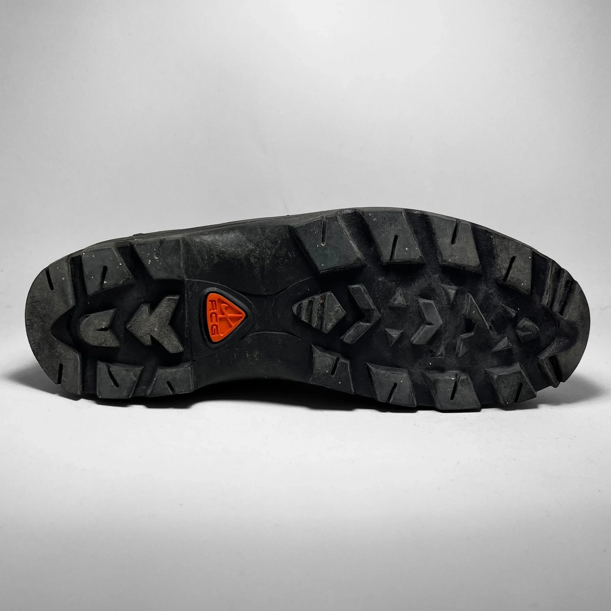 A rugged hiking boot built for durability and comfort. It features a premium brown leather upper with metal D-ring eyelets for secure lacing, a padded black collar, and a reinforced toe for protection. The black rubber outsole has deep, aggressive treads with an ACG-branded orange insert, ensuring solid traction on rough terrain. The iconic Nike ACG logo is subtly embossed on the side, and the tongue sports a small Swoosh with “AIR” branding. A rare and functional gem from Nike’s All Conditions Gear line.