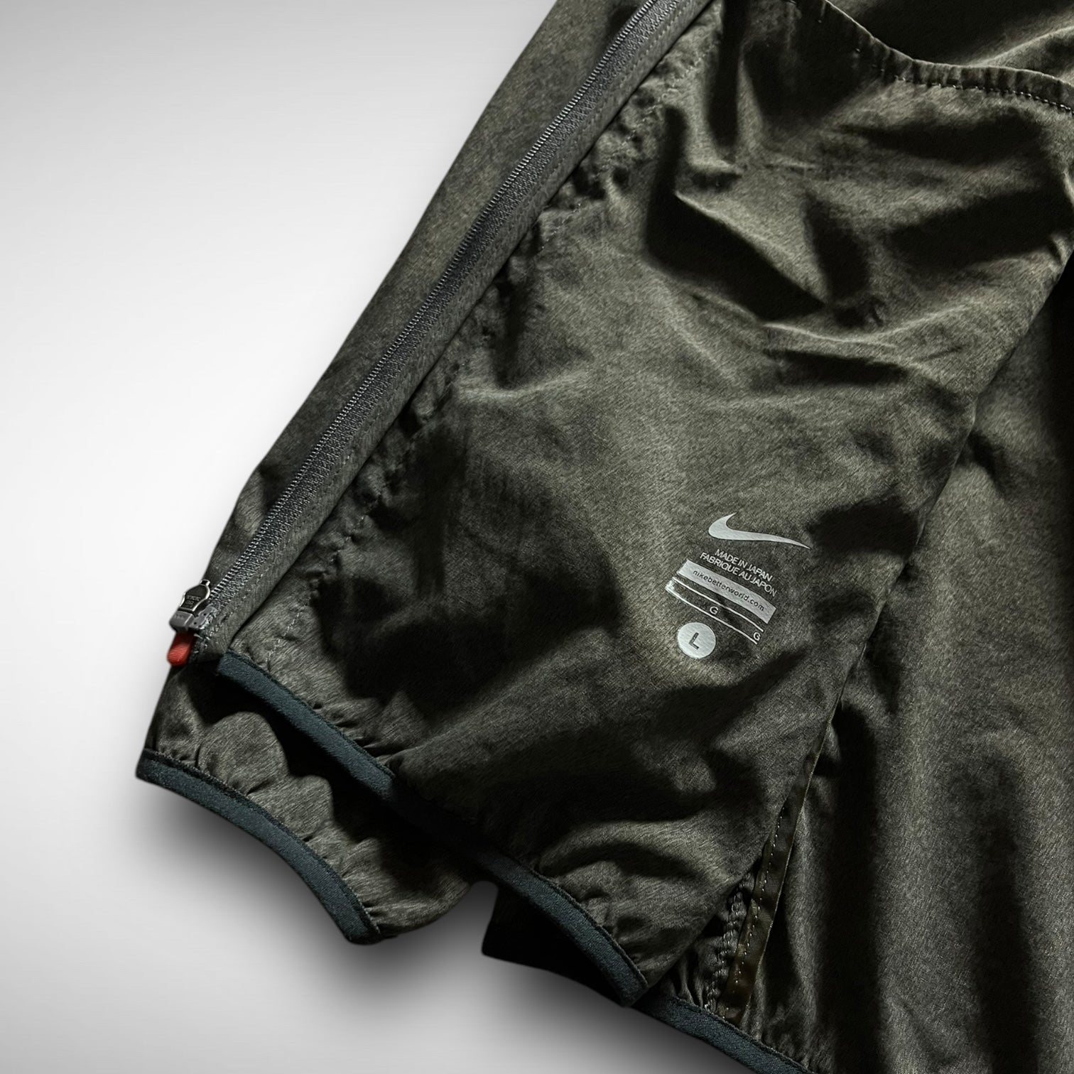 Finished in deep olive tones with black contrast detailing, the design includes zip-off sleeves that convert the jacket into a vest. Dual front zip pockets, laser-cut ventilation, and ergonomic seams complete this versatile running piece, embodying Gyakusou’s balance of function and minimalist style. 3M reflective minimal branding throughout.