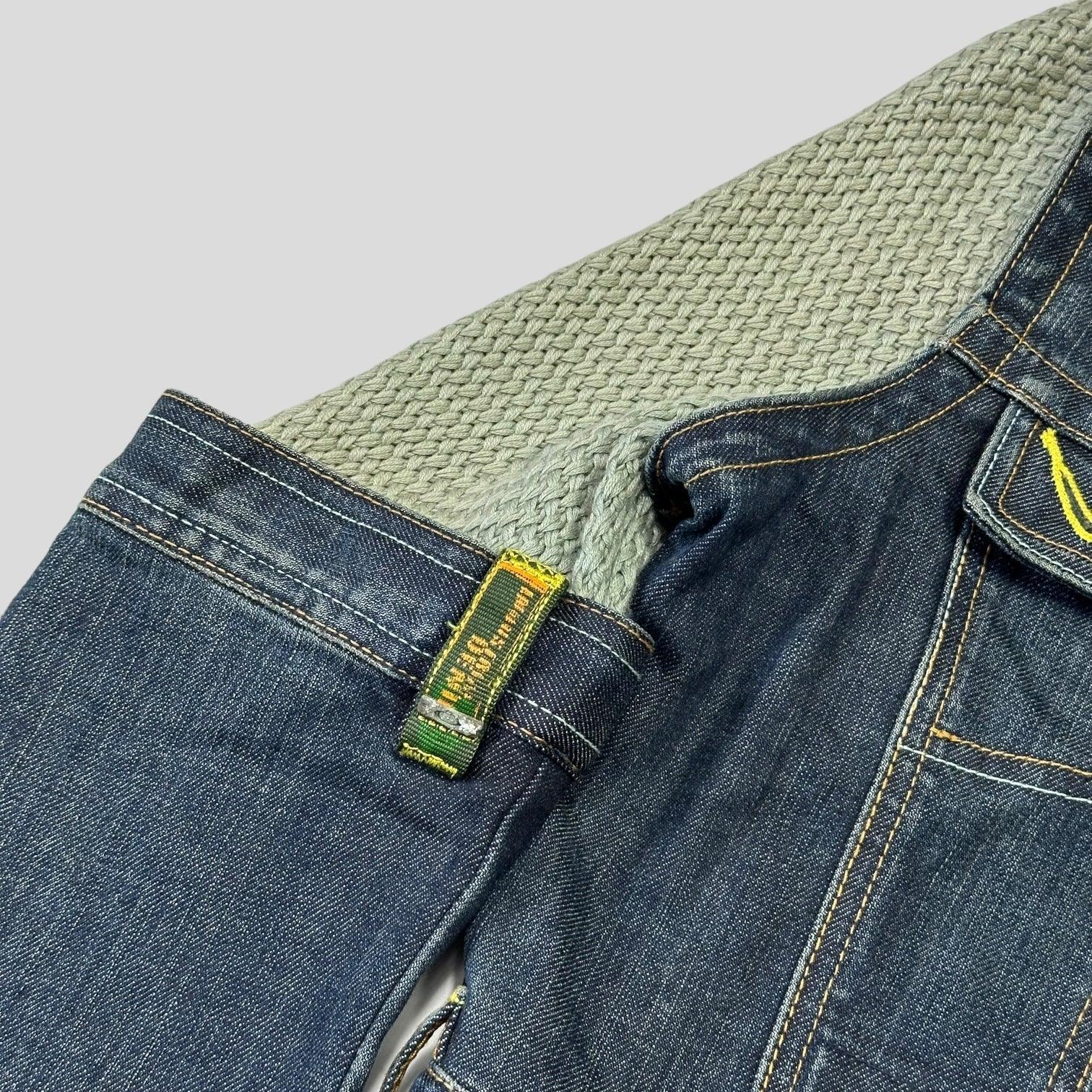 Rare 2000’s Oakley Metal Industries Denim and Knit construction cropped jacket, sample piece which features no buttons, Oakley brand tab to arm.