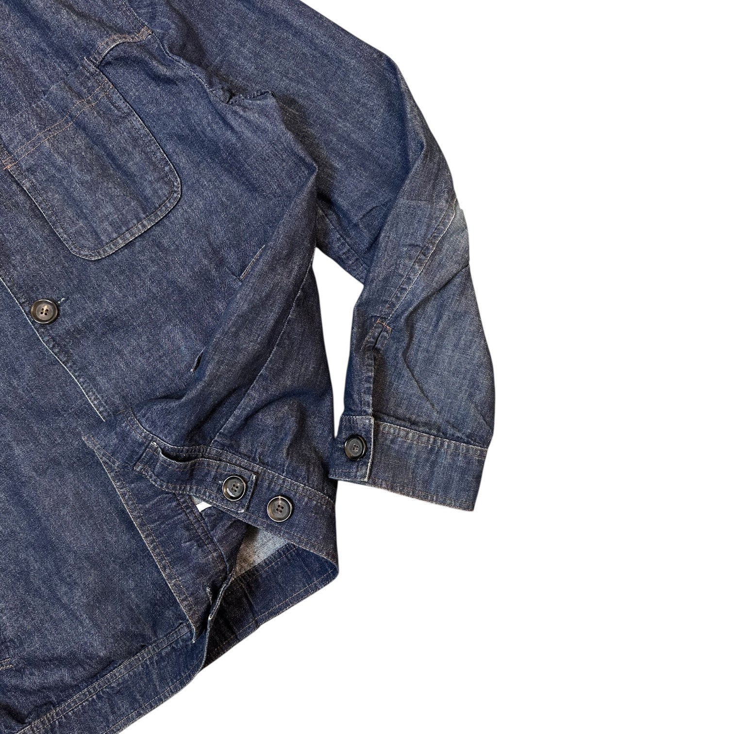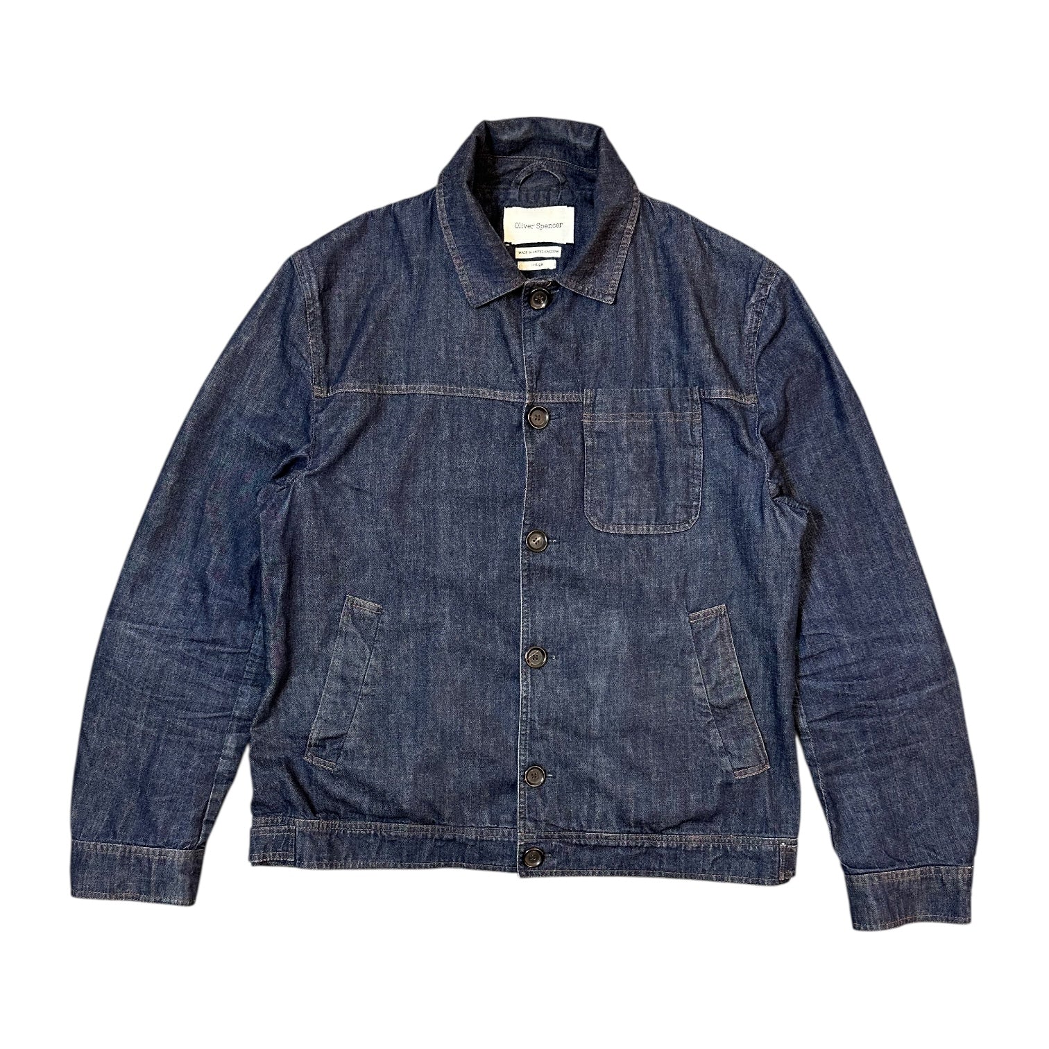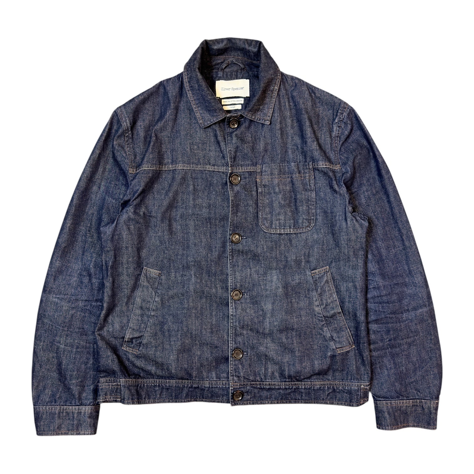 Oliver Spencer Buffalo Denim Jacket. The perfect light layer for transitional weather, crafted with an indigo dye and features a chunky button-front fastening, with a collared neckline, a front patch pocket, side pockets, buttoned cuffs, and an interior patch pocket. RRP £275
