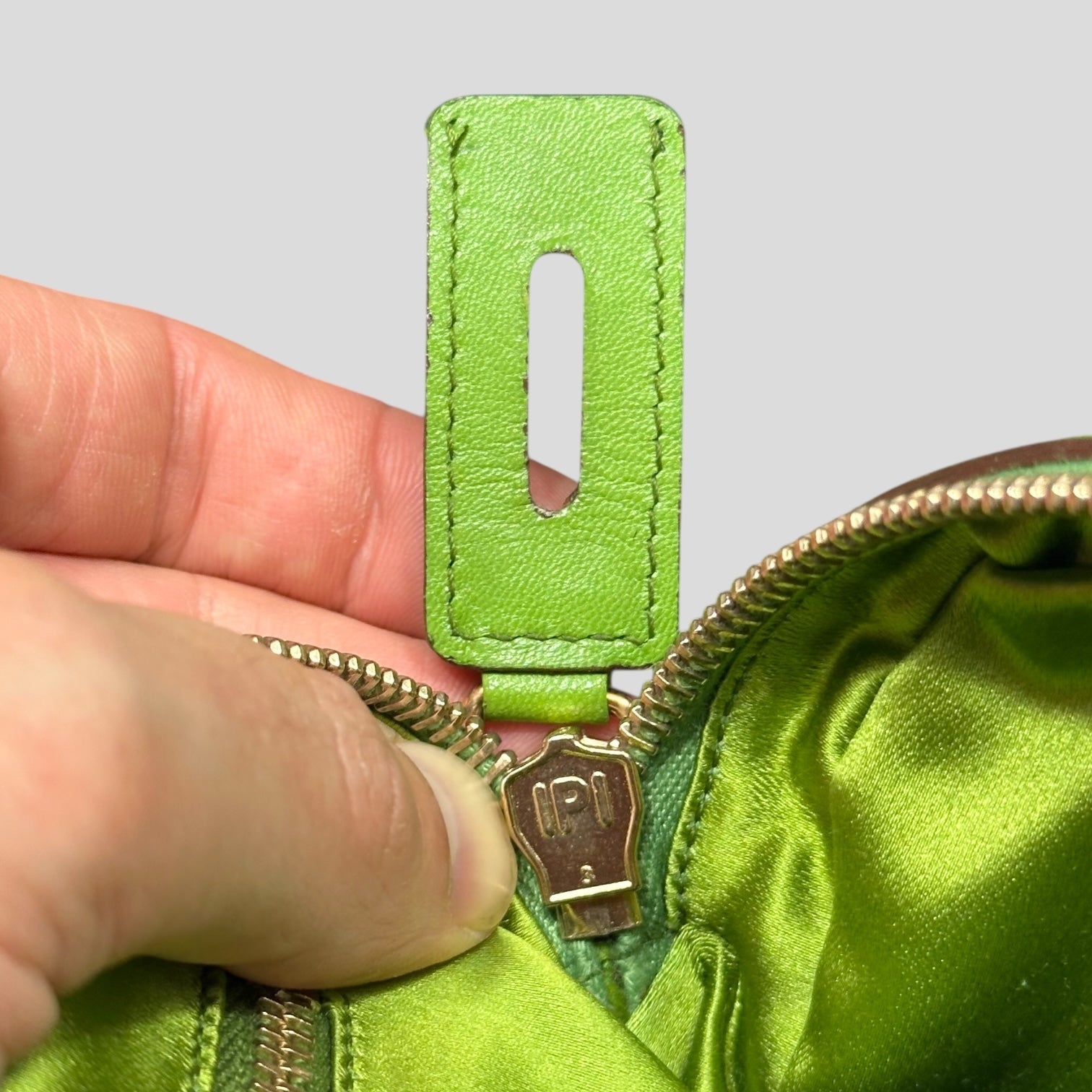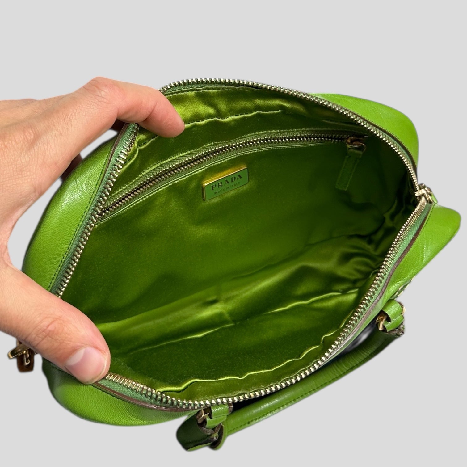 Beautiful 2001 Prada green leather mini top handle clutch style bag / purse with unique woven leather on both sides, Prada plaque logo to side, golden Prada lock that can be used to secure the bag alongside the keys that hide in the leather droptag, two inside zip compartments.