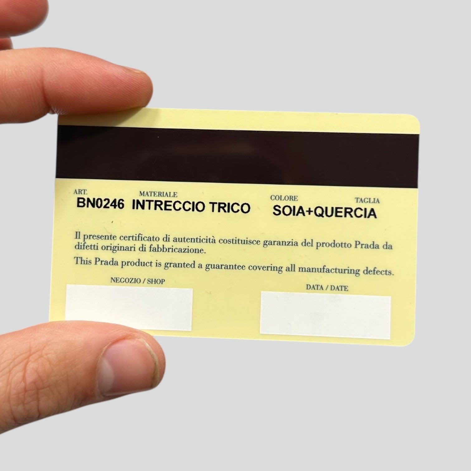 Includes the original Prada cotton drawstring dustbag, the Prada authenticity cards and the plastic ziplock storage bag.