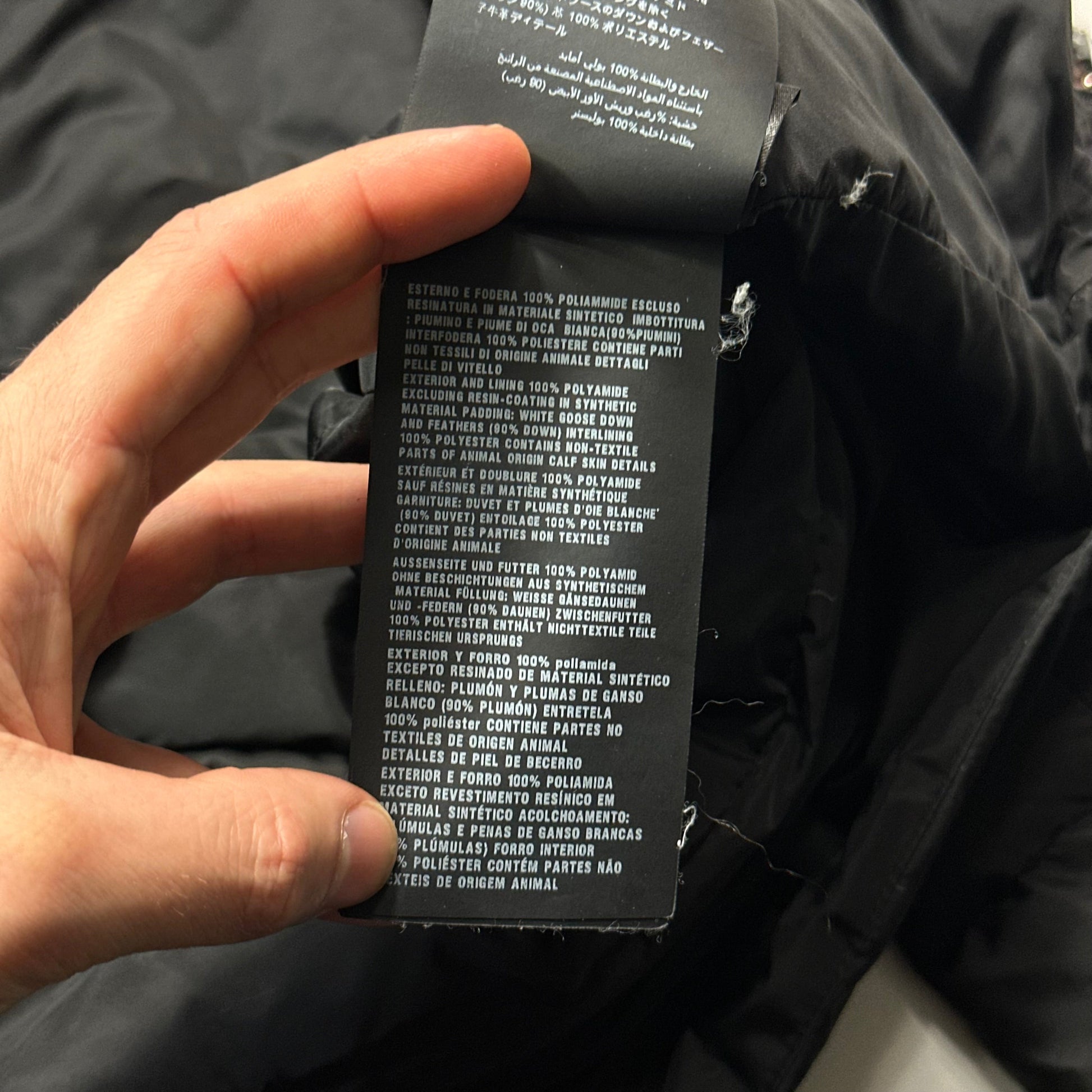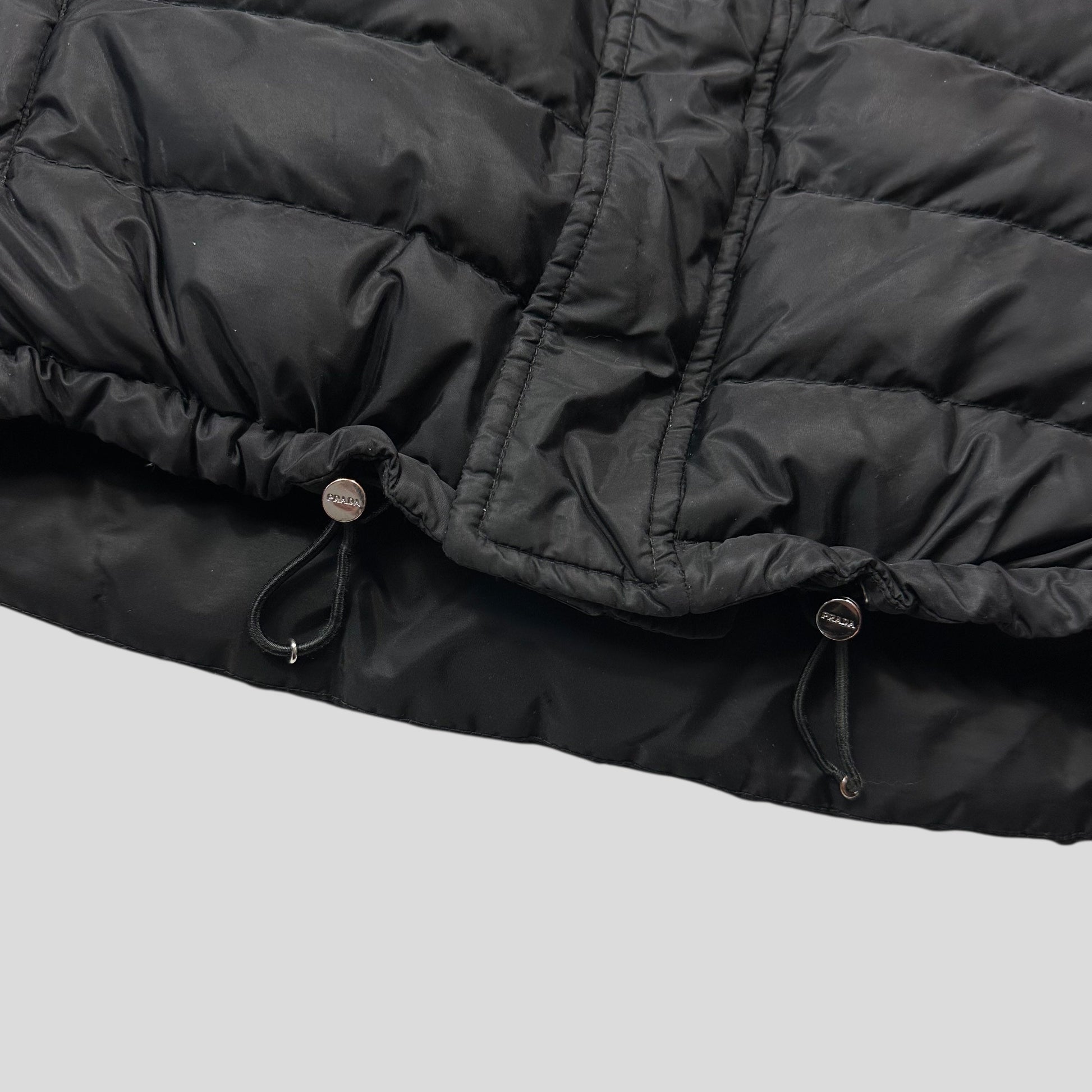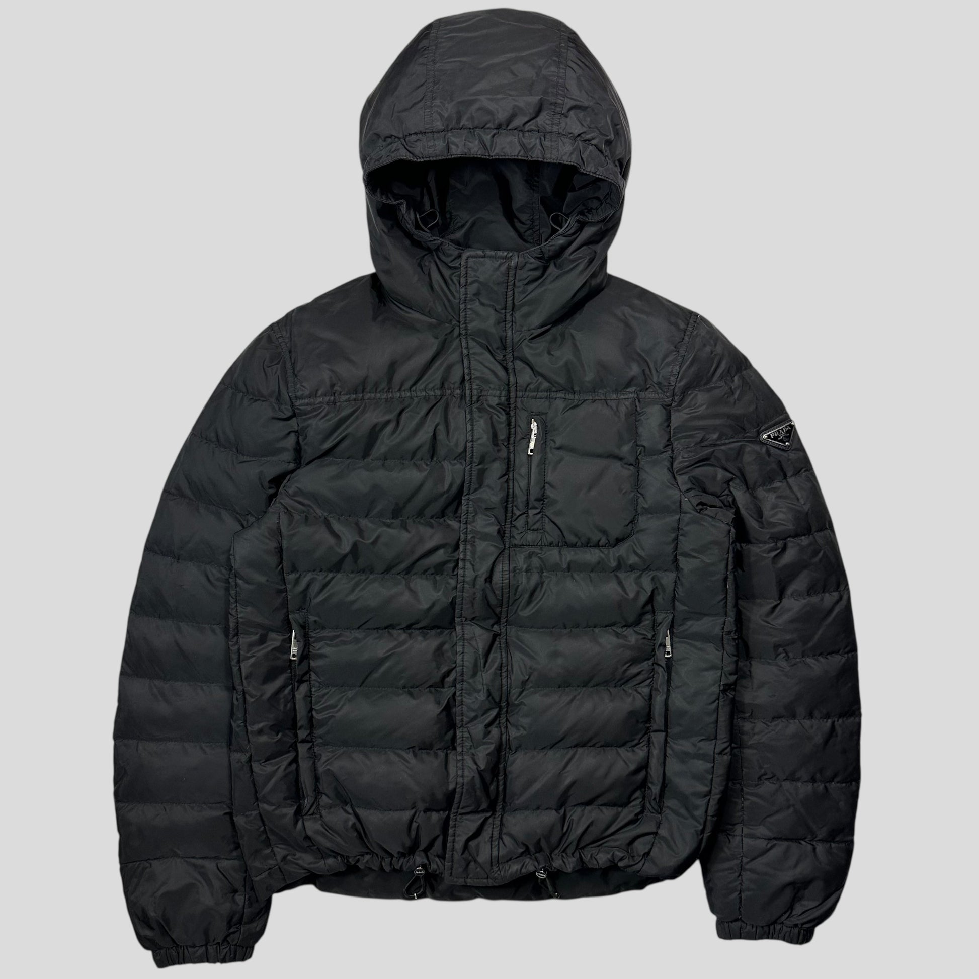 Rare 2018 exclusive Prada Nero black mainline nylon down puffer, unique shape and pocket configuration with a mini zip pocket to chest, triangle plaque logo to arm, adjustable hem and hood toggles to cinch the fit, warm mid-weight goose down fill, twin pockets inside.