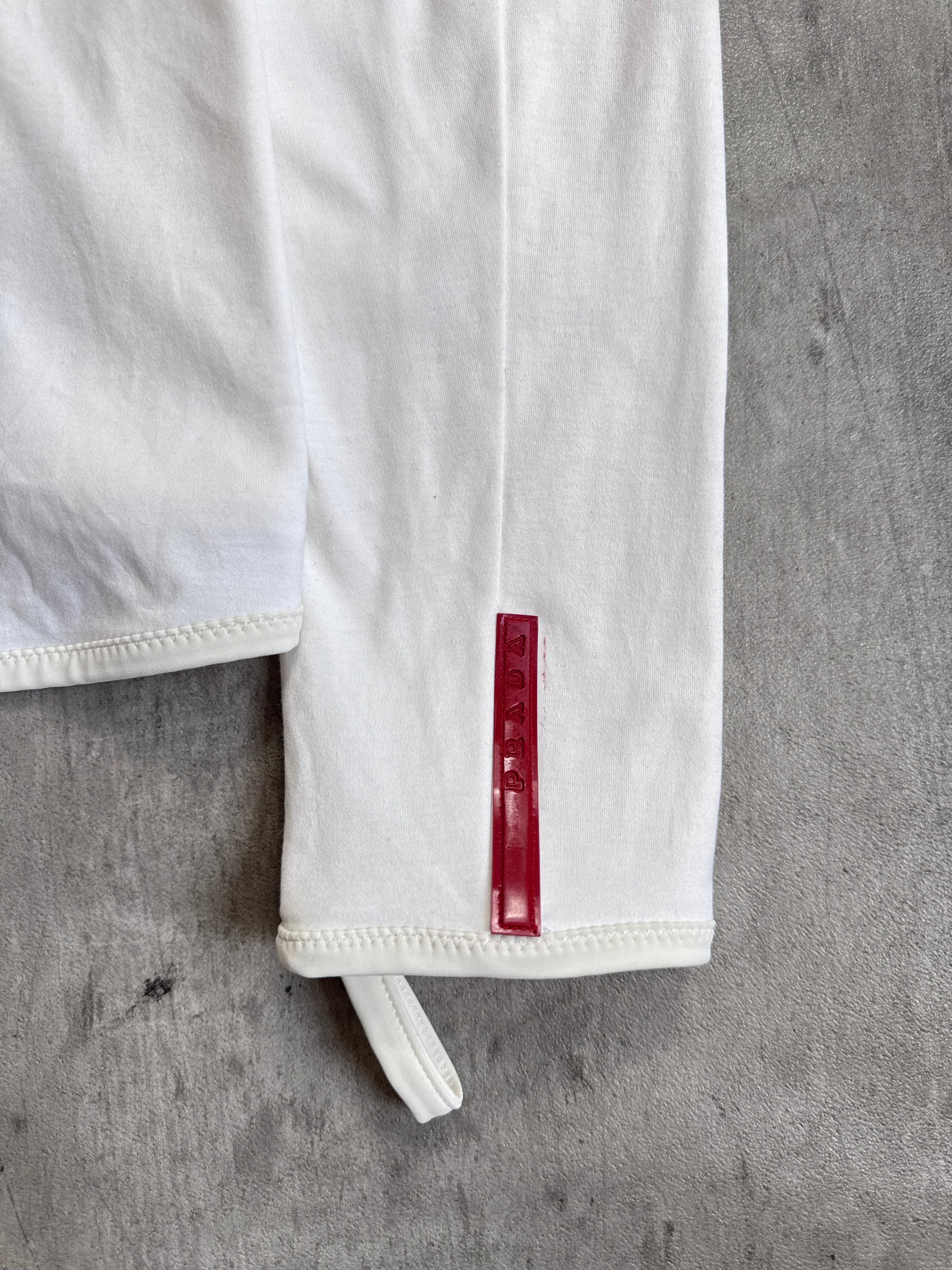 A minimalist Prada Lightweight White Cotton Quarter Zip Sweater, embodying the brand’s refined sportswear aesthetic. Crafted from premium soft-touch cotton, this piece features a high-neck quarter zip, ribbed cuffs and hem, and Prada’s signature red tab detailing along the seam.