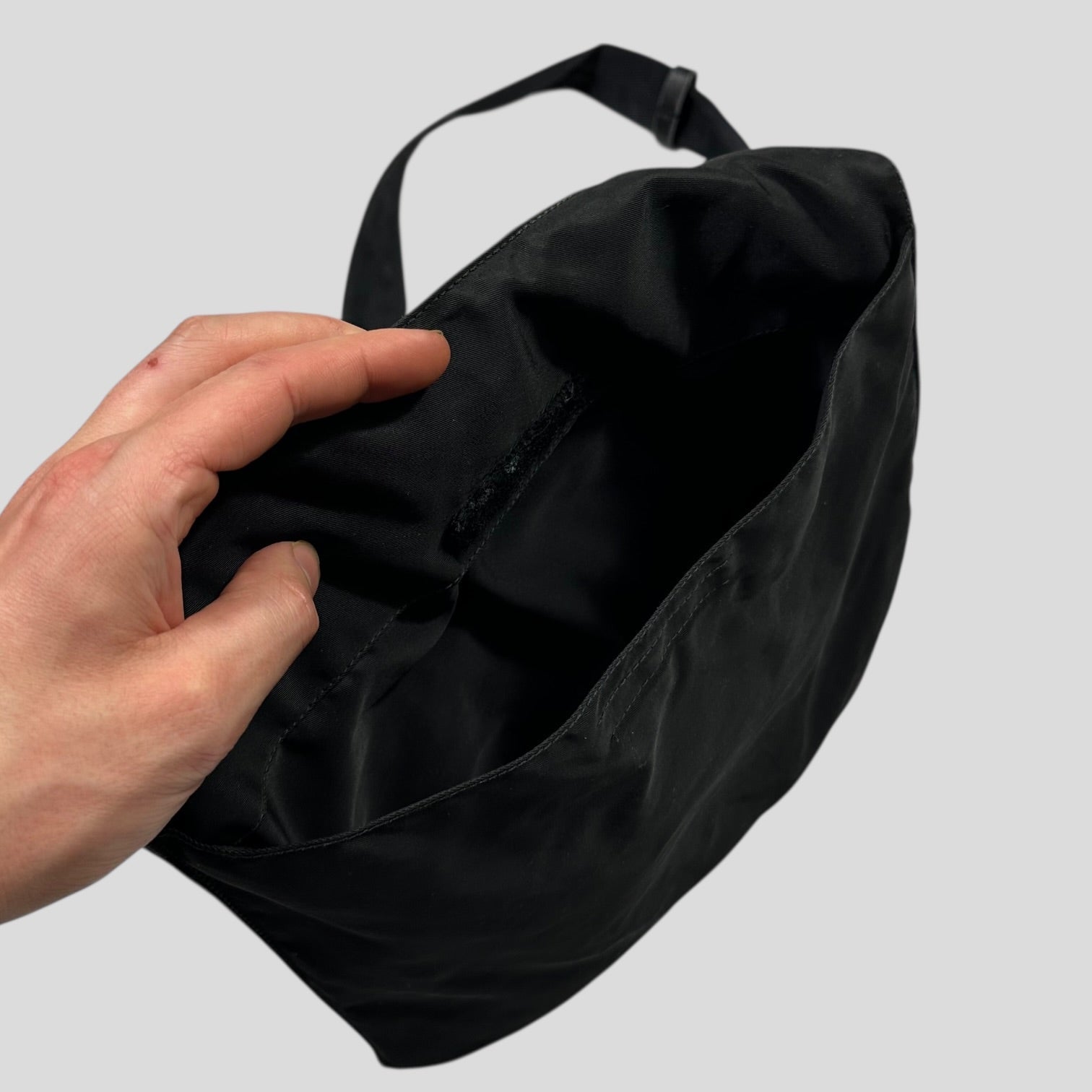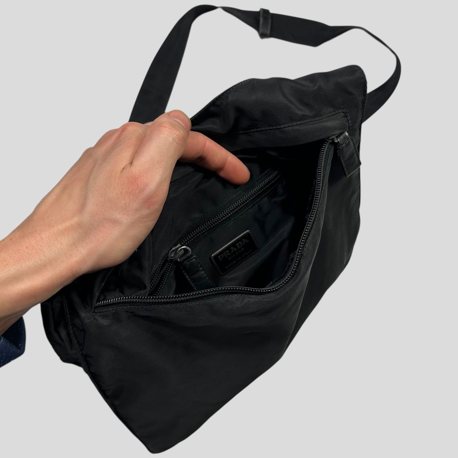 Rare 2000’s Prada mainline triangle plaque logo crossbody bag, unique shape and style that can expand due to a twin seam around the edge, multipocket design with lots of storage, leather detailing adjustable strap.