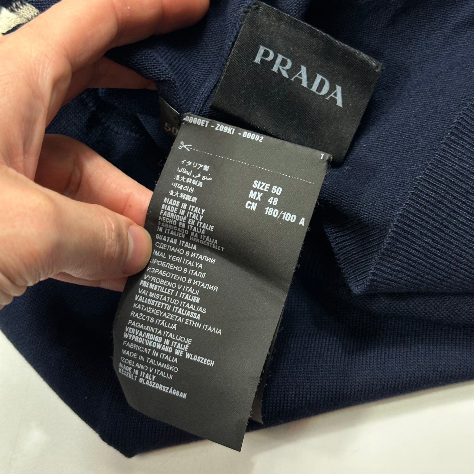 Very rare Prada mainline 2014 navy blue v-neck cardigan, lightweight superfine silk and cotton blend, unique mesh college style striped panels running down the front, similar to a Cuban bowling shirt but excellently transferred onto a knit.