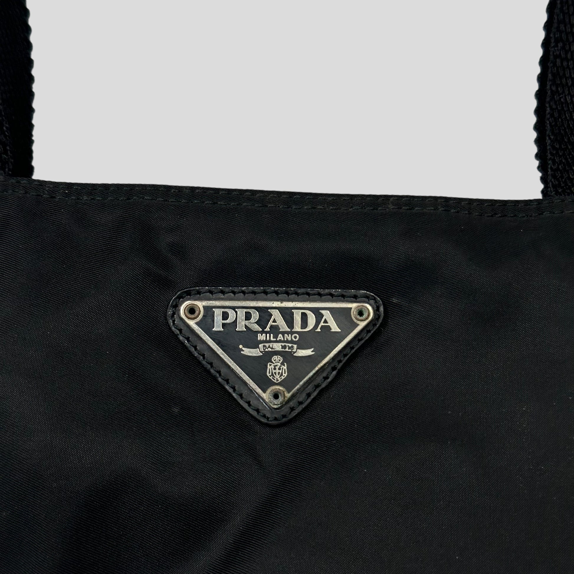 Prada 1990’s nylon Nero black tote bag, triangle plaque badge to front, zip pocket on the back, large dual zip main compartment with an inside zip pocket.