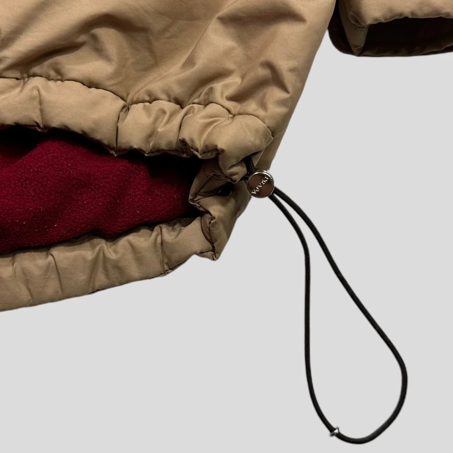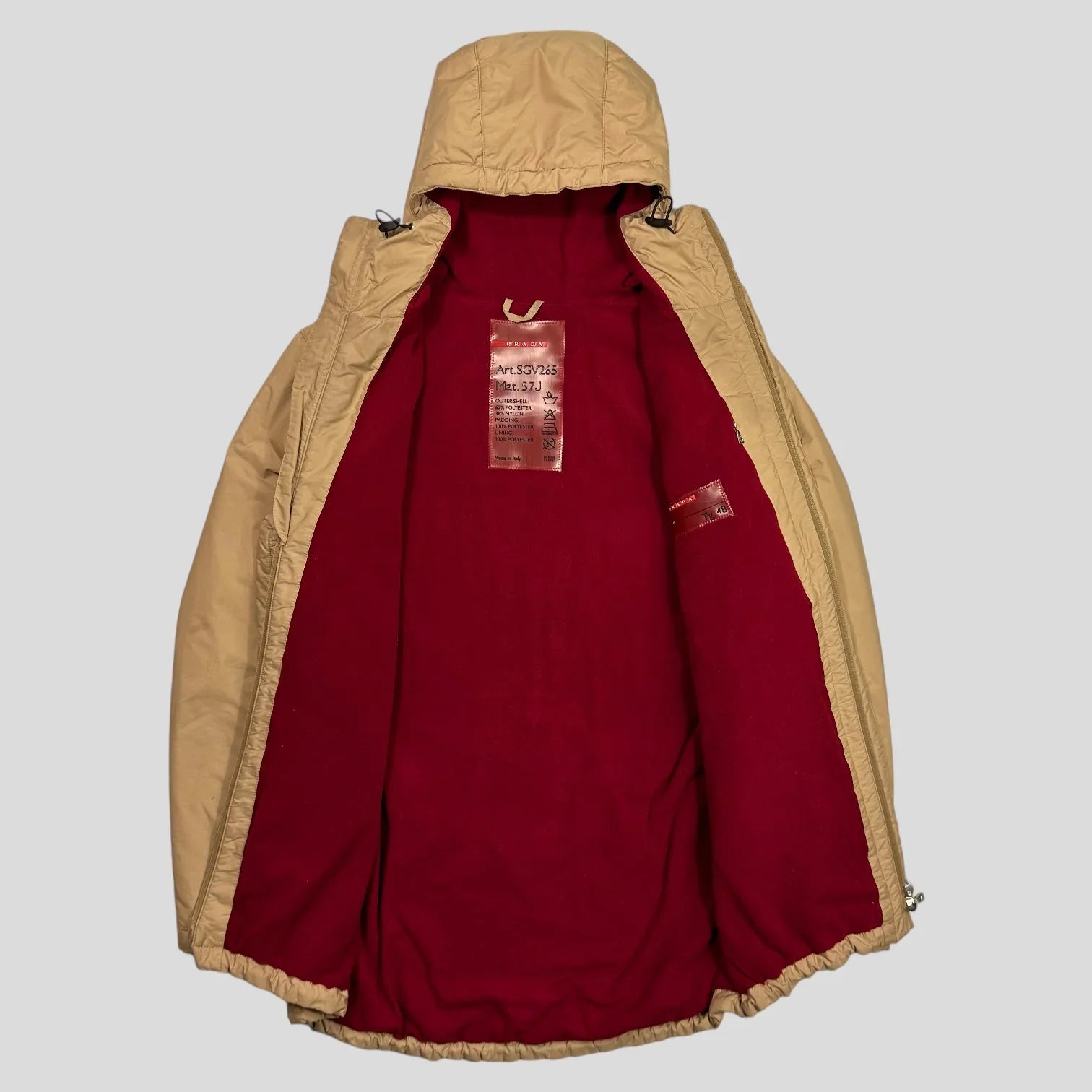 Extremely rare Prada Sport autumn winter 2000 golden nylon jacket with the big red rubber chest logo seen exclusively in this season, long ninja style cut with adjustable hem, hood and cuffs to fit, lined with a warm contrasting red fleece, large zip stash pocket to the lower back also synonymous with the 00 season.