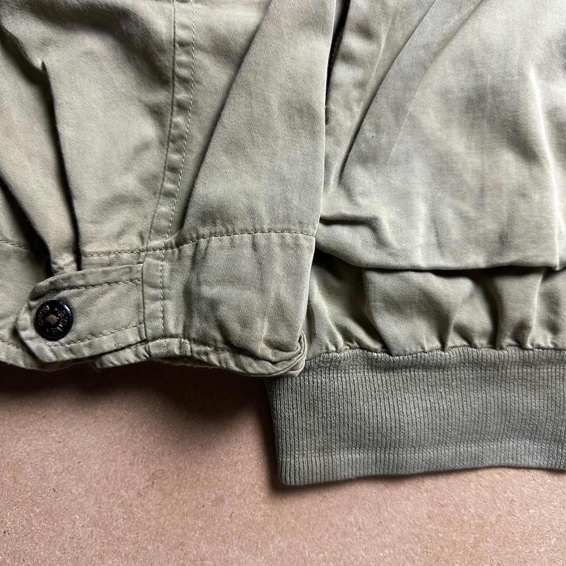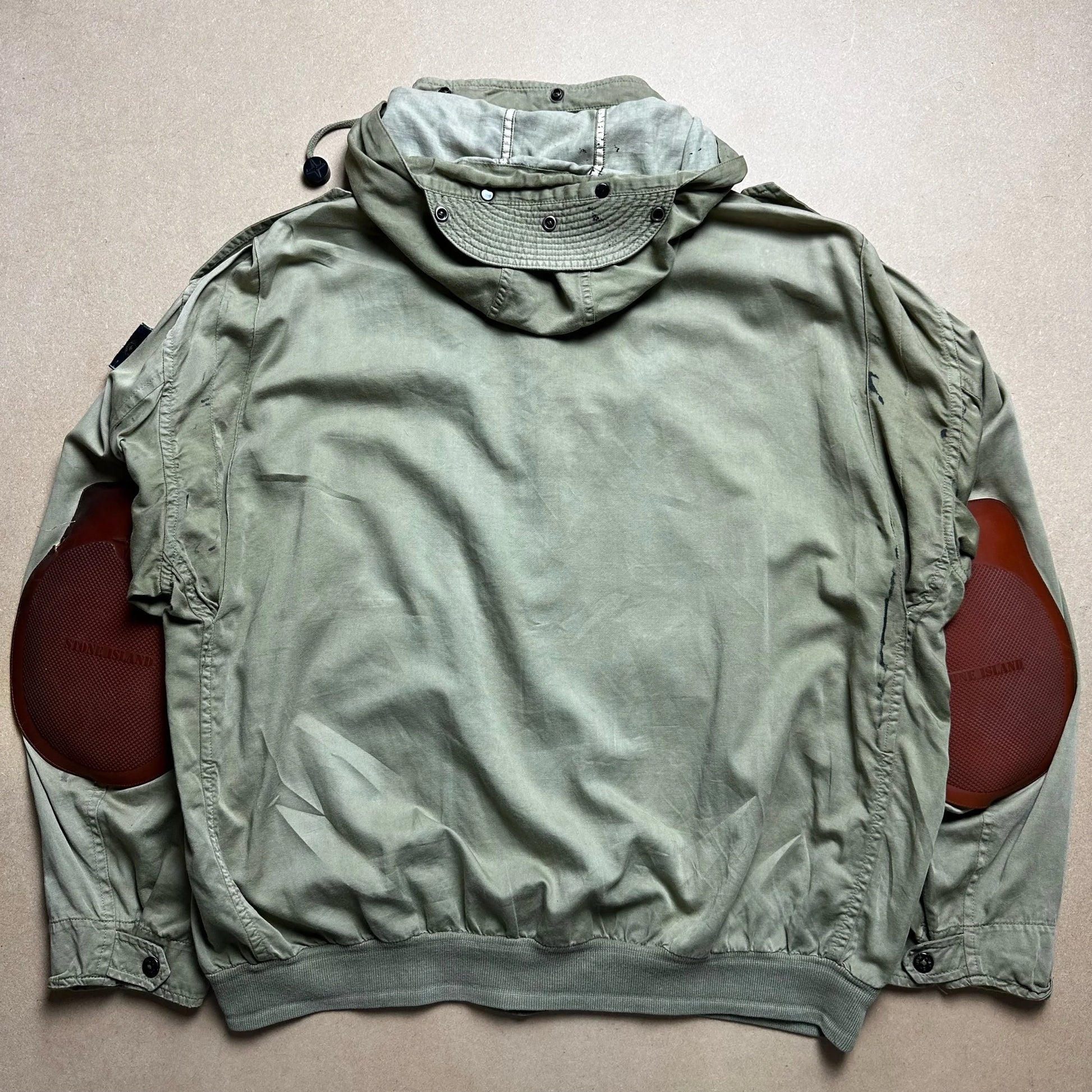 Designed by Massimo Osti. A military inspired garment with loads of detailing. Comprised of a satin cotton blend featuring full concealed full zip / press stud closure. Peaked hood with a concealable collar function. Flap closure cargo pockets with side zip compartments. Adjustable cuffs and ribbed hem. Complete with patented vulcanised rubber elbow pads and button appliqué.