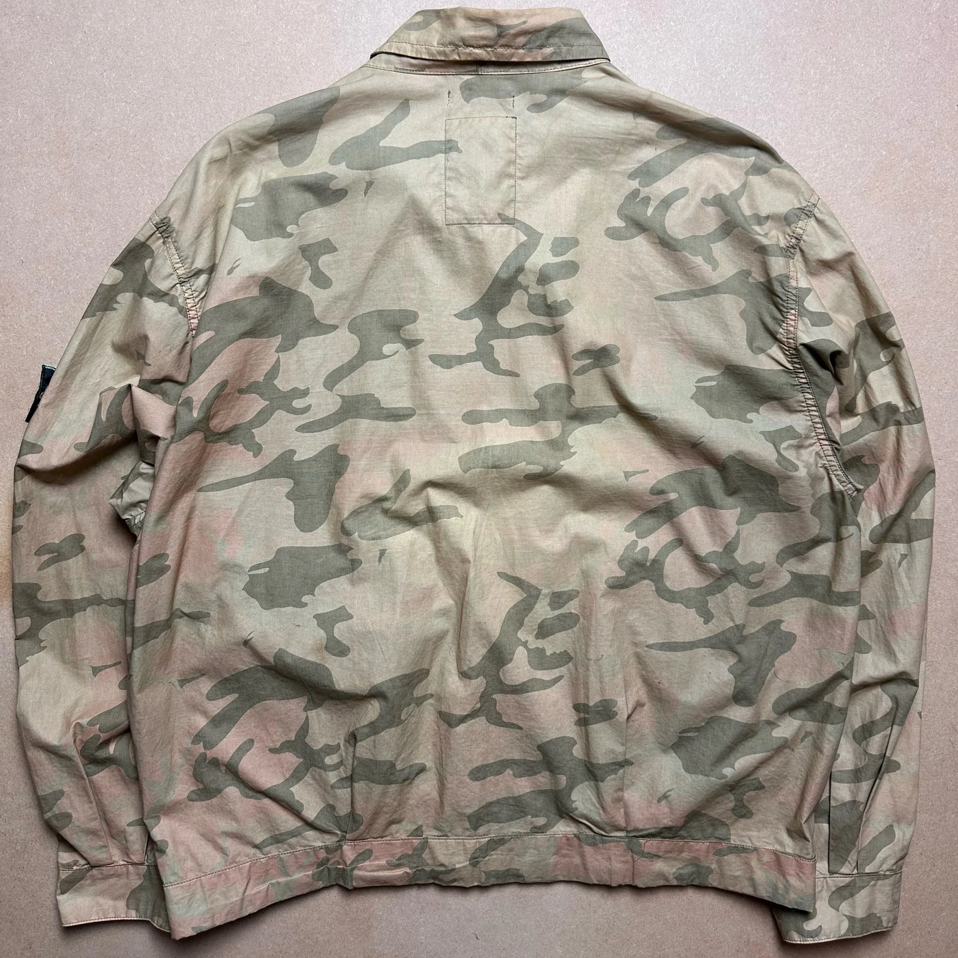 Designed by Massimo Osti. A light silken Cotton Poplin fabric impregnated with heat sensitive camouflage dye patterns. Horizontal zip chest pockets. Straight small spread collar. Adjustable hem and press stud fastened cuffs. Tiger Orange / Sand / Forest Green colour way.