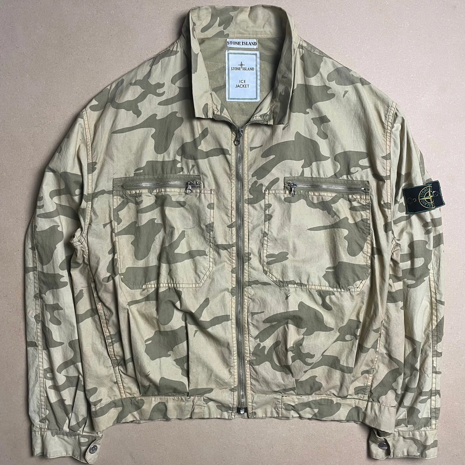 Designed by Massimo Osti. An iconic Archivio piece from the Ice Camouflage range. Early iteration in cotton poplin instead of the next years cotton canvas ripstop. Horizontal chest pockets, lower side slit pockets. Full zip closure, silver embossed press stud cuff closure. Lace internal stitched hem fastening. woodland camo pattern in green/sand colour.