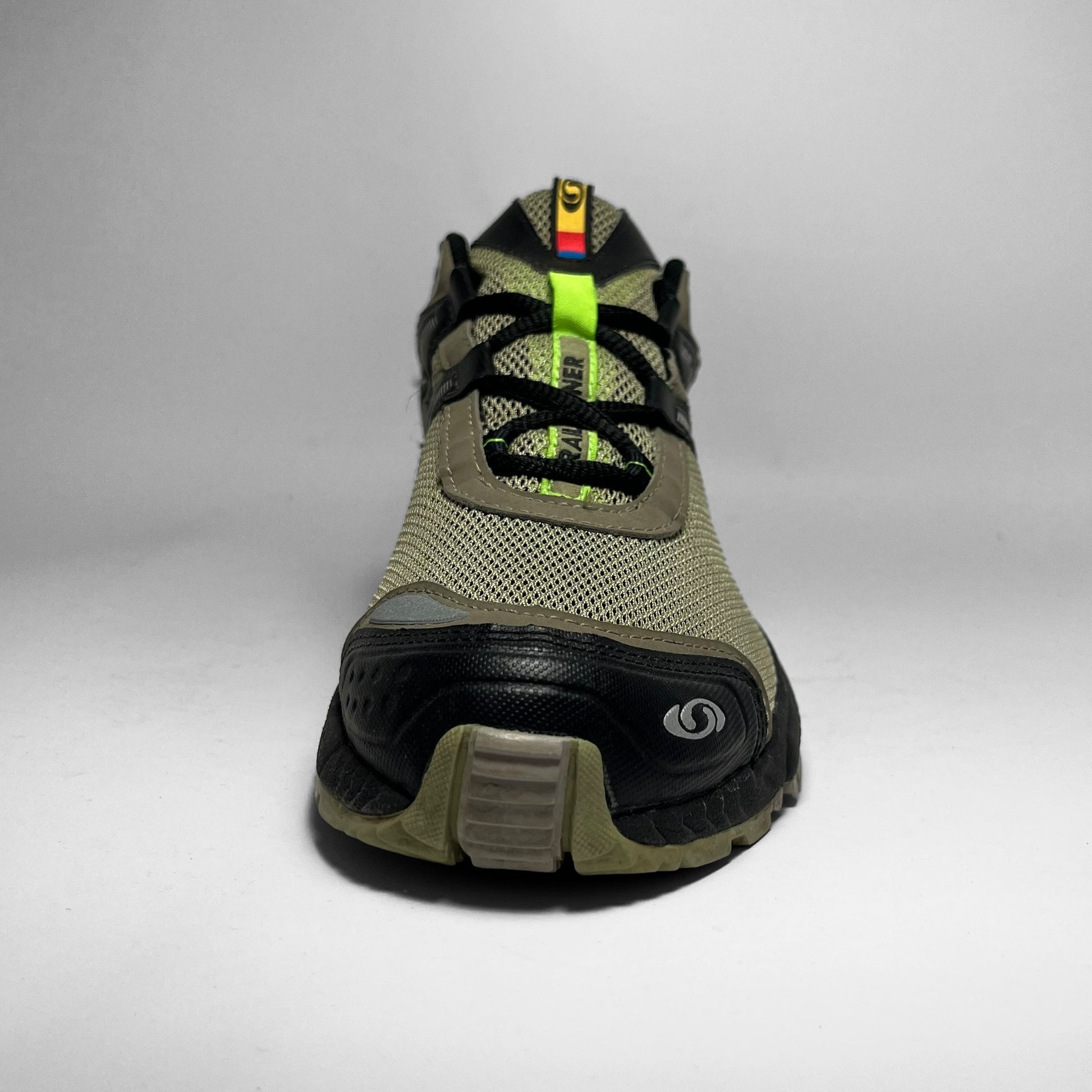 Featuring Salomon’s Cushioning System (SCS) for stability and shock absorption. Built with breathable mesh and synthetic overlays in olive and black including striking panels underneath in bright green, silver branding and details through with Contragrip outsole ensuring grip.