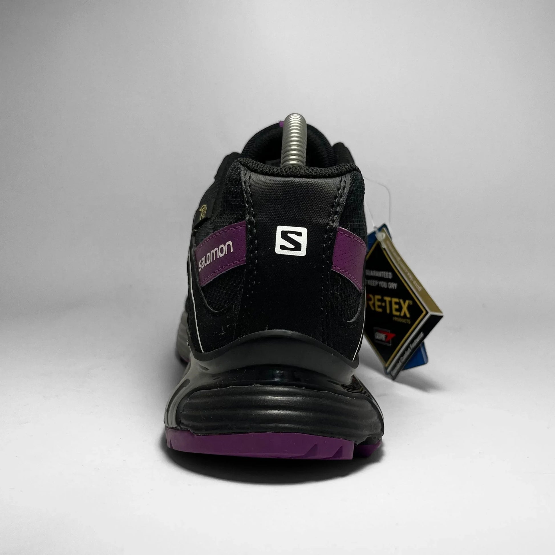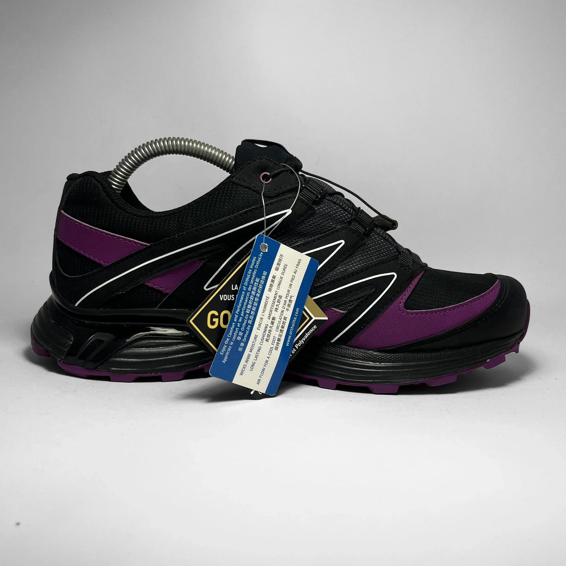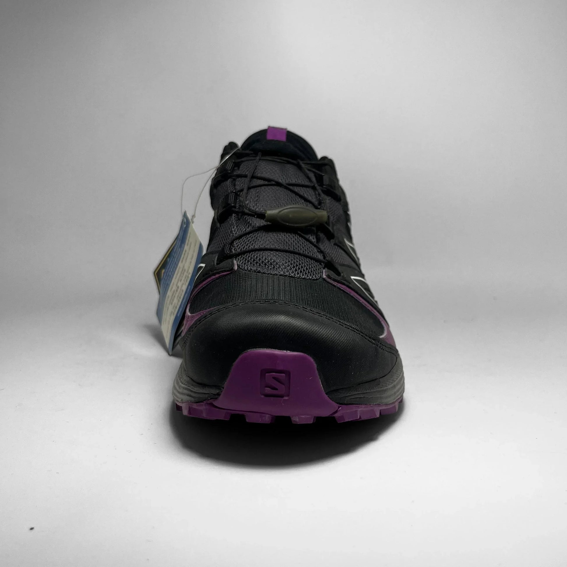 Black mesh base with a rip-stop pattern at front, layered with purple leather perforated panels from toe to heel, rubberised mudguard and cotton panelling on the sides complemented with silver lining, just like the branding throughout, finished with a quick-rope system. All packed in Gore-Tex.