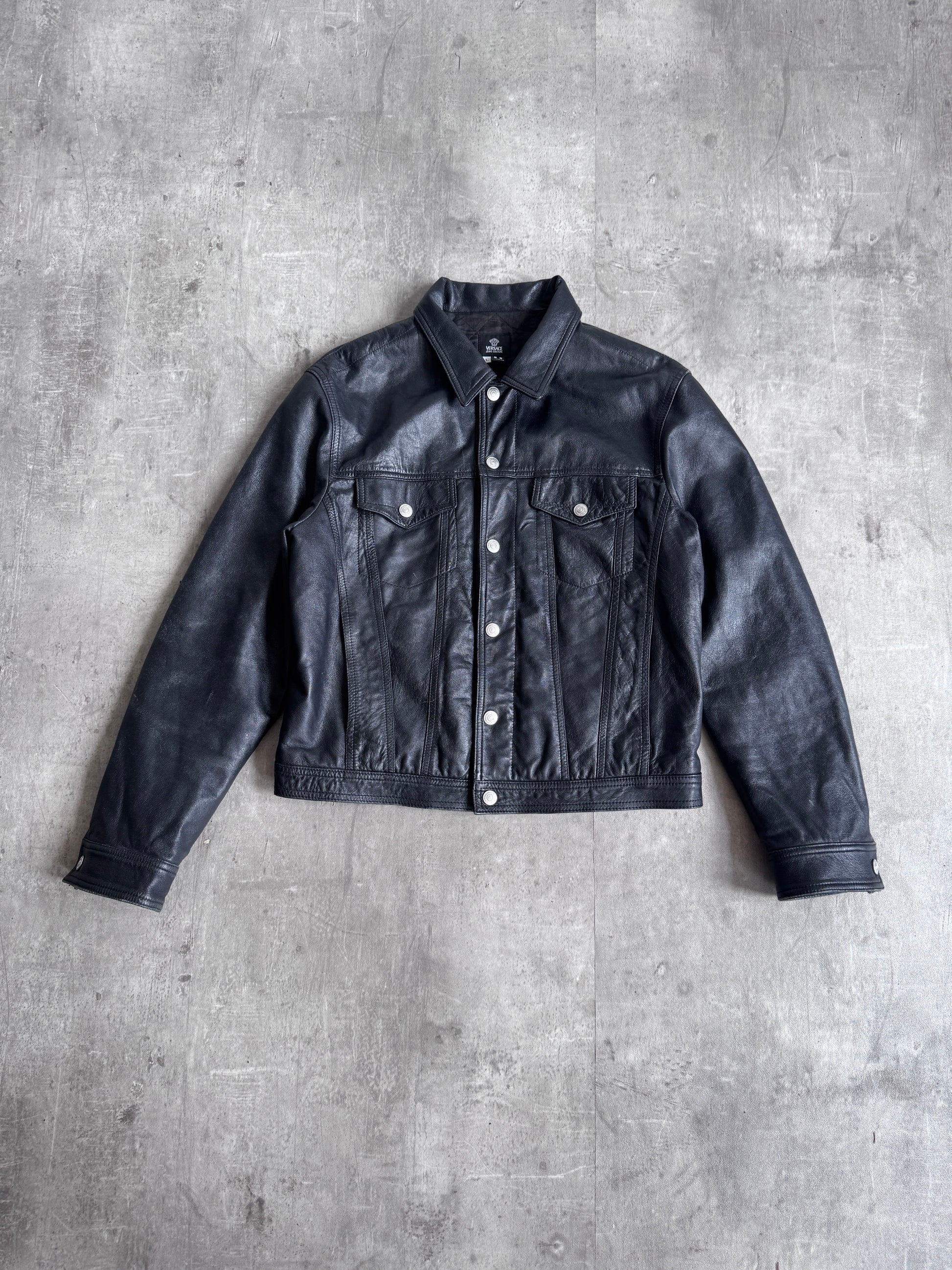 This Versace black soft leather trucker jacket reimagines a classic American silhouette through the lens of high-fashion Italian craftsmanship. Cut from buttery smooth leather with a subtle sheen, it features structured paneling, pointed collar, and matte black hardware that deliver a sleek, tailored finish. The minimal exterior is balanced by unmistakable Versace attitude—quiet luxury with just the right amount of edge. Perfect for transitional layering or head-turning nightwear, this jacket is a wardrobe anchor for anyone chasing vintage runway energy, modern rockstar style, and collectible Versace outerwear with timeless appeal.