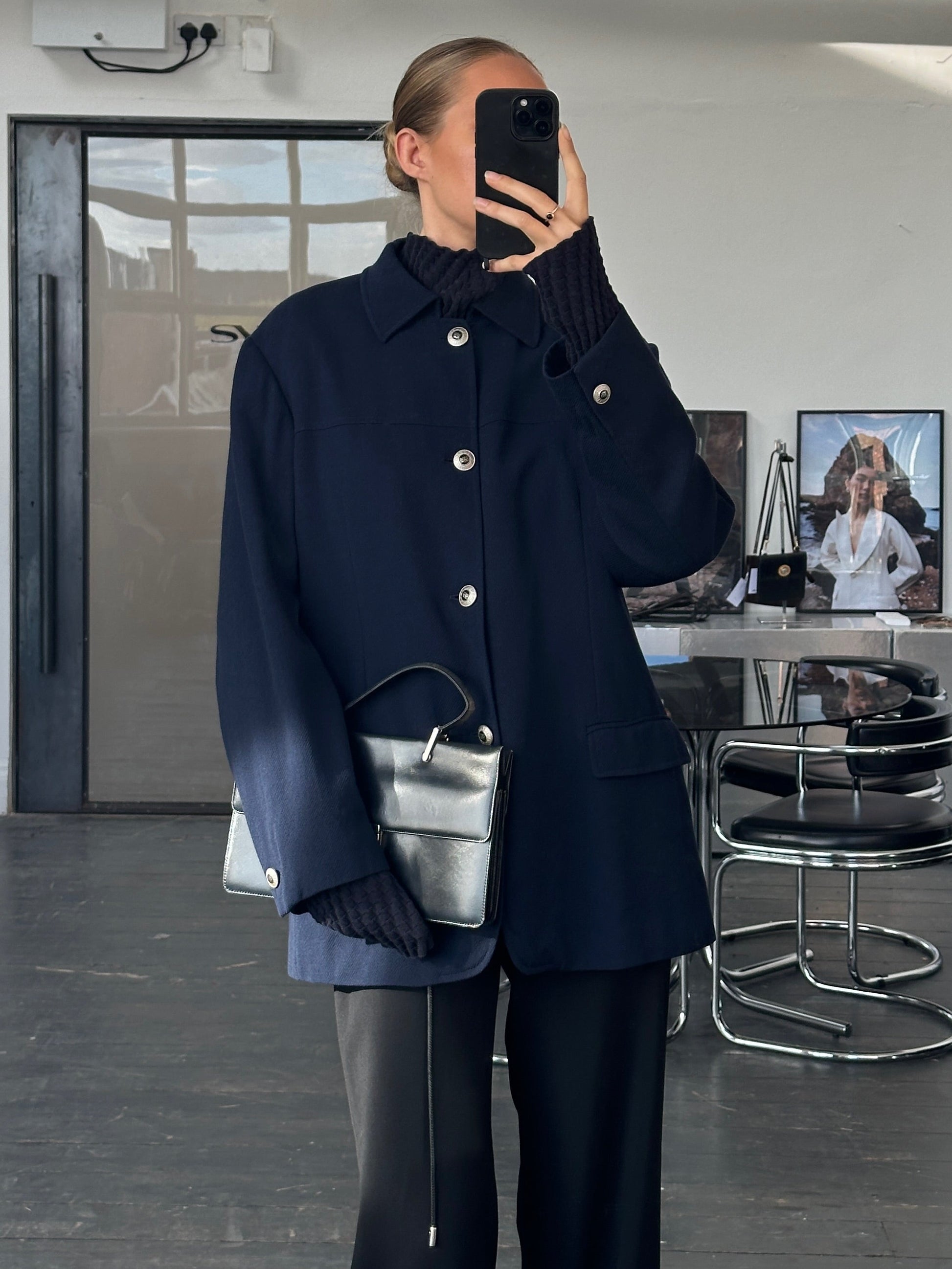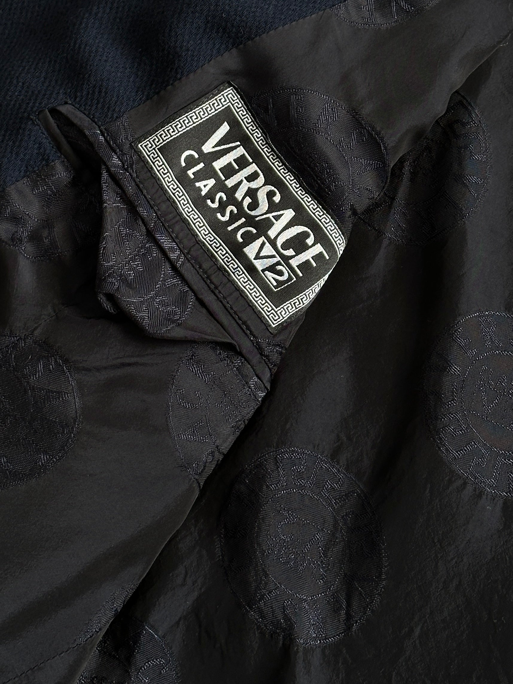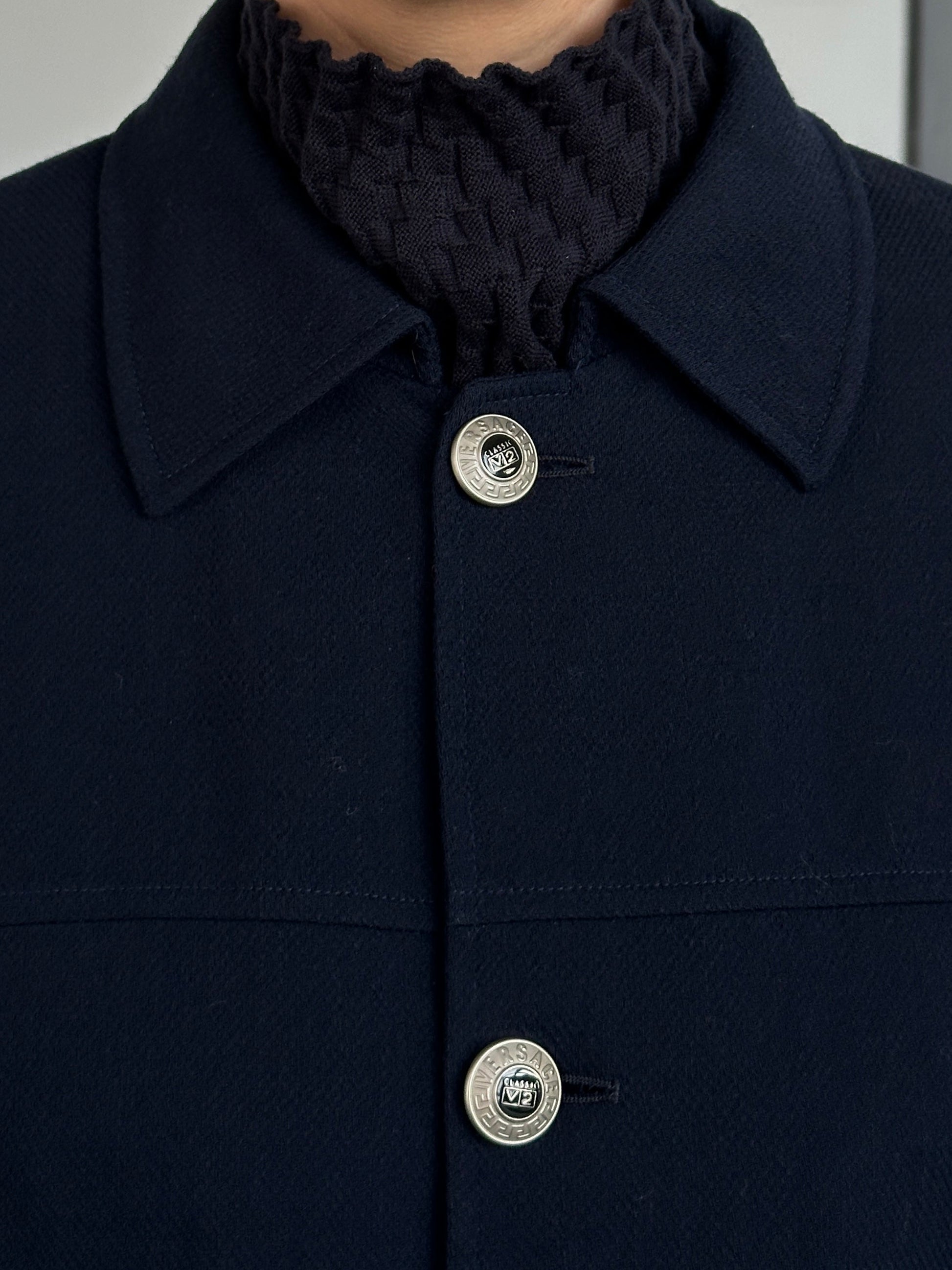 Vintage late 1990s Versace Classic V2 navy wool chore jacket featuring bespoke metal logo buttons and full monogram satin lining for a refined utilitarian finish.