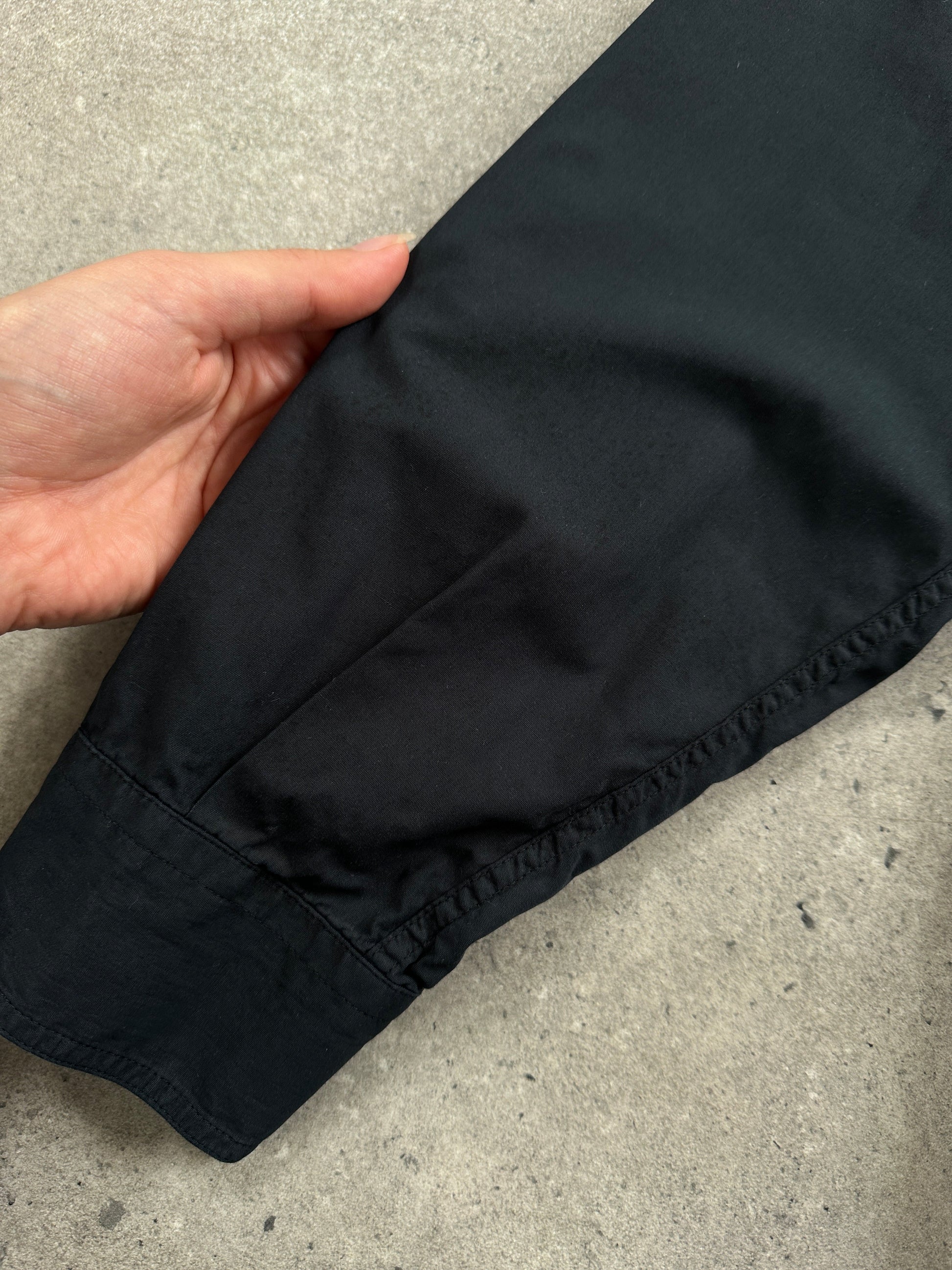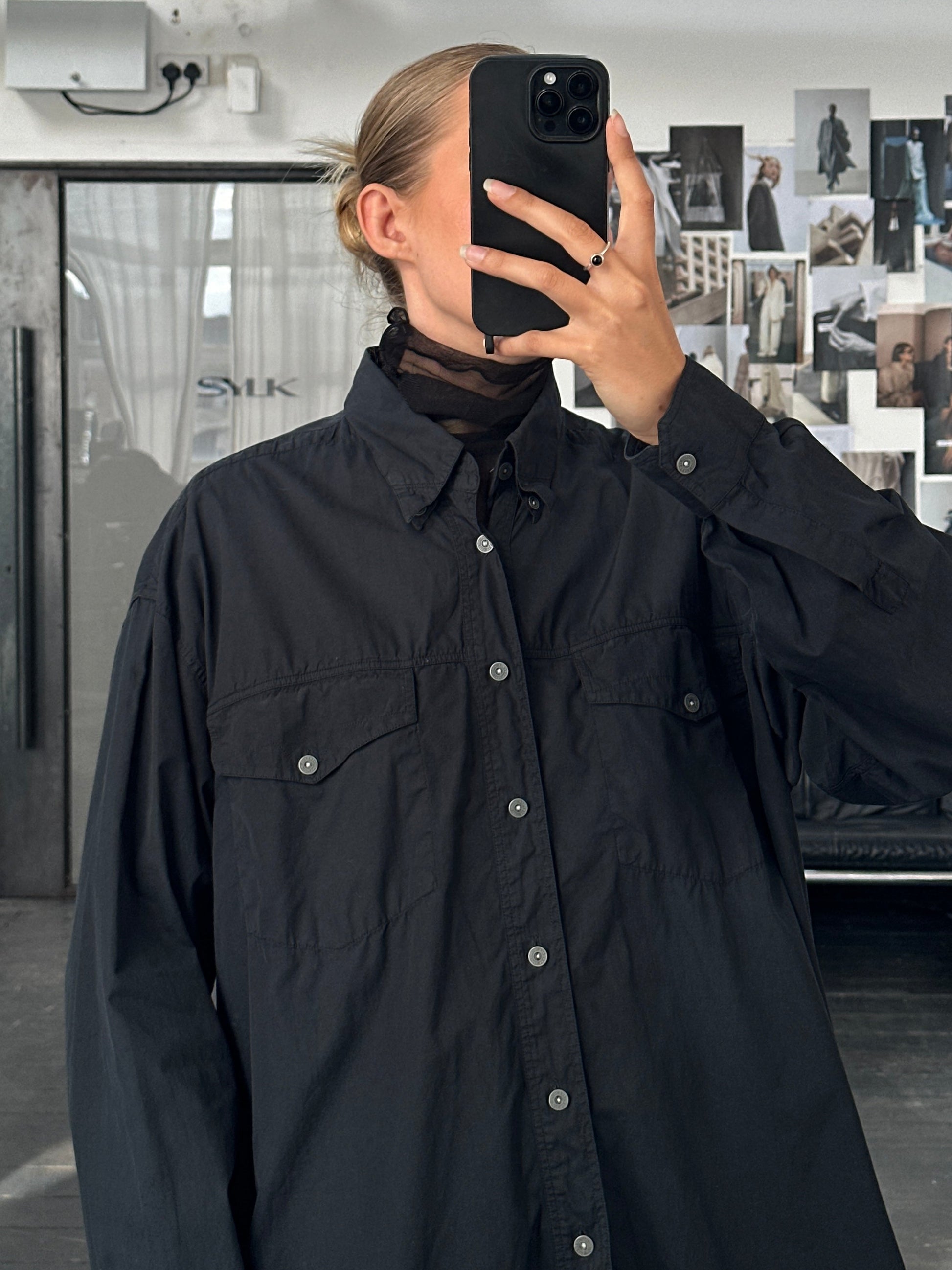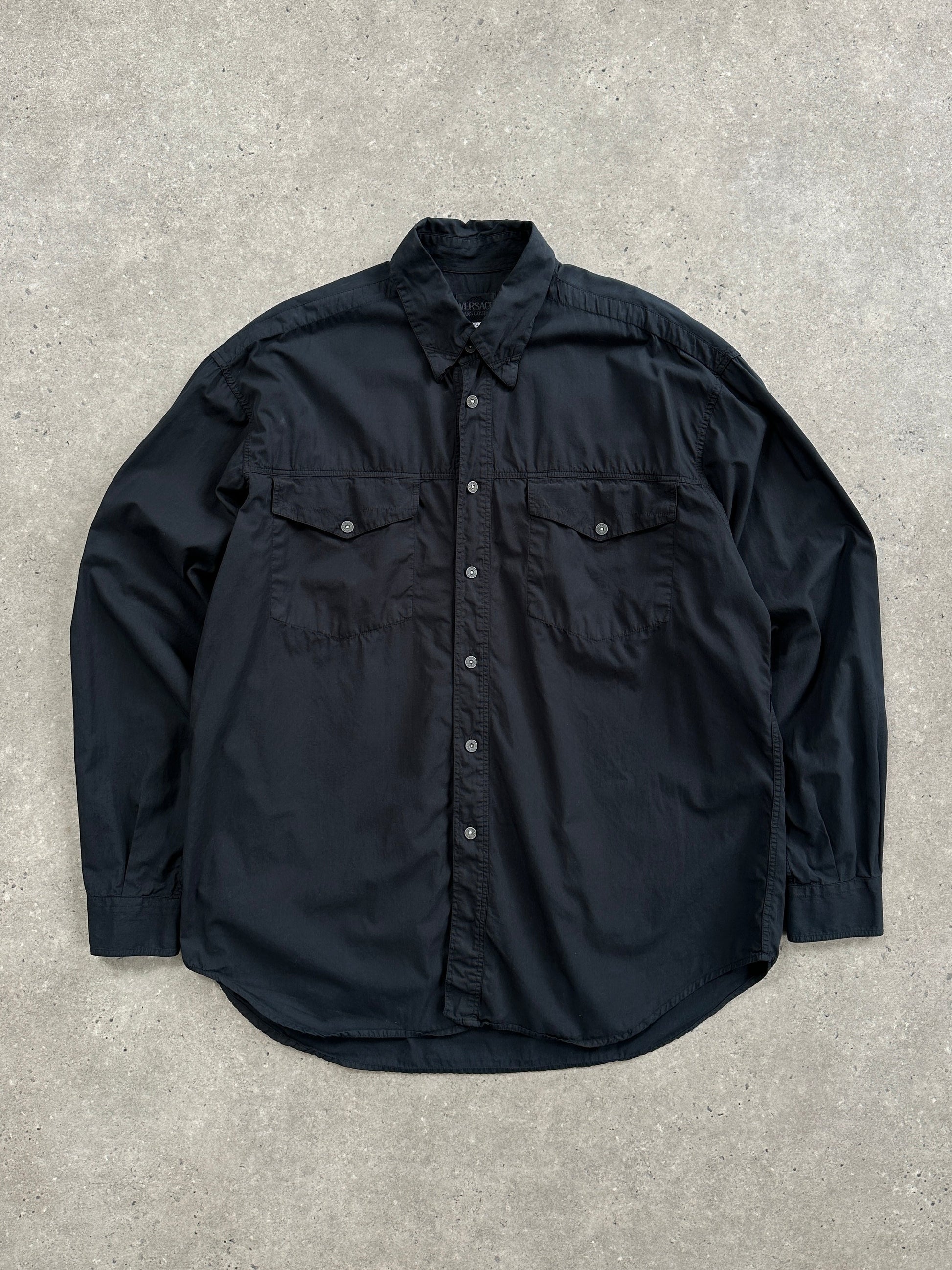 Versace Jeans Couture navy cotton button-up. 90s workwear inspired shirt with structured chest pockets and metal logo buttons.