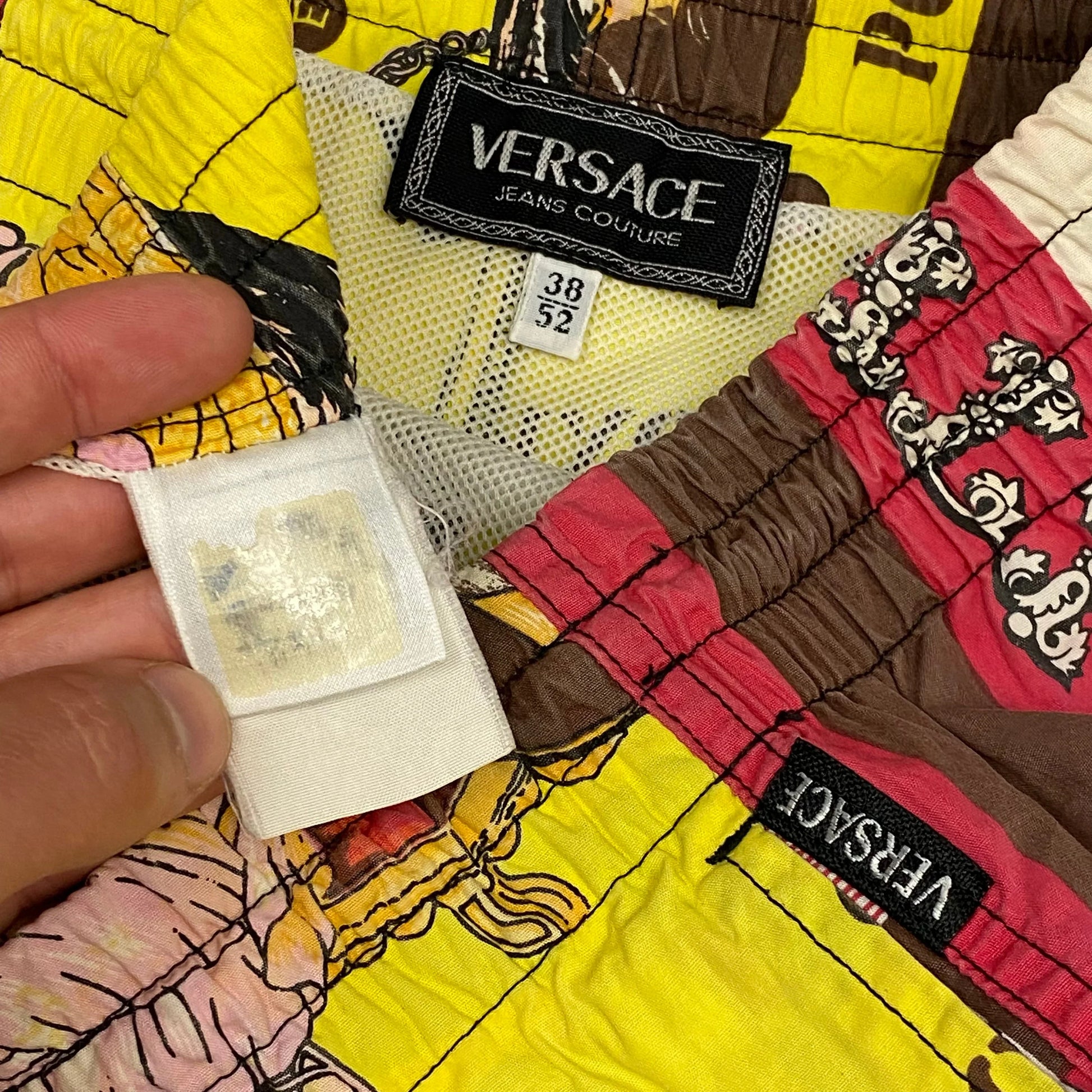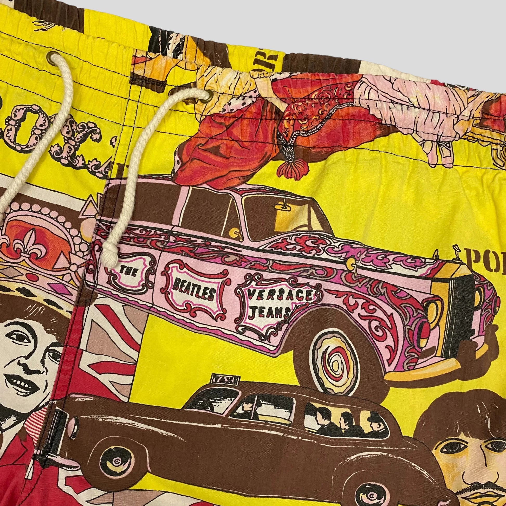 Extremely rare pop art 1990’s Versace Jeans Couture swim shorts, feature the iconic Versace Rock & Royalty print with art from The Beetles and Sex Pistols in a lovely mixture of yellows browns and washed out pinks.