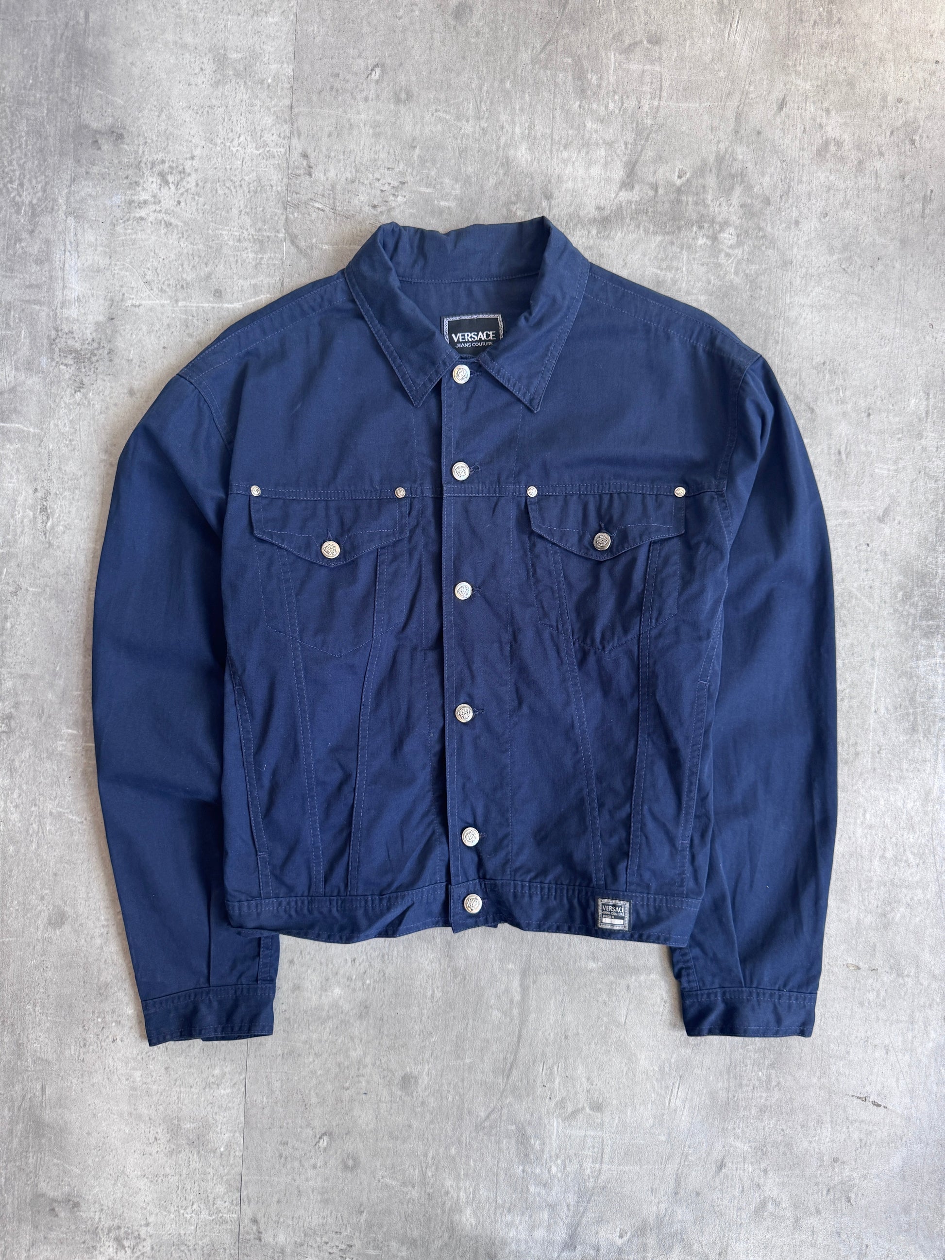 A sleek reinterpretation of the classic trucker silhouette from Versace. Crafted from durable navy cotton, this jacket features sharp tailoring with a minimalist aesthetic, finished with silver-tone branded buttons. Perfect for casual layering with a touch of luxury edge.