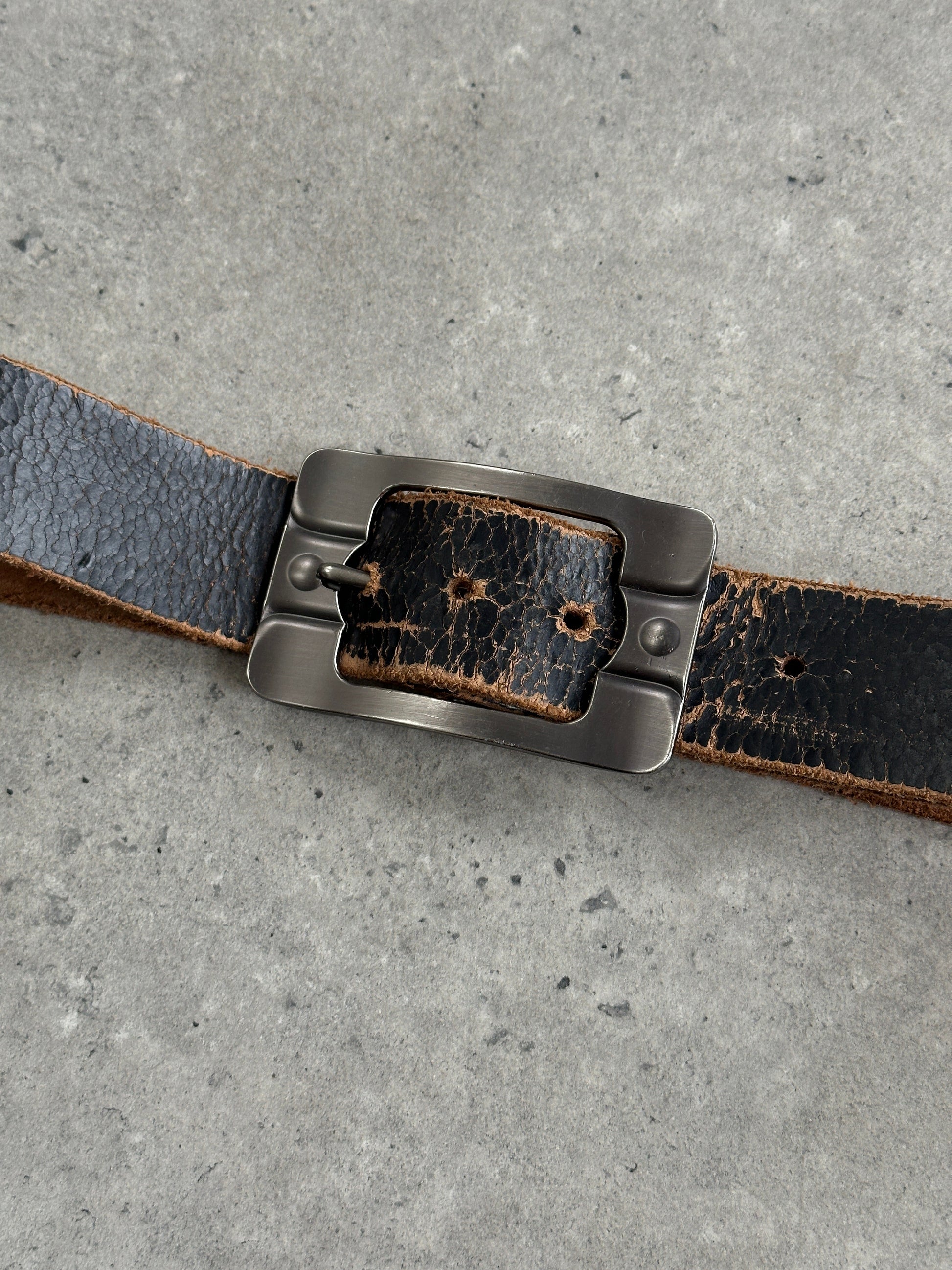 Vintage 1990s genuine leather belt featuring a naturally aged cracked patina and matte metal silver square buckle. A minimal design elevated by its raw texture and lived-in appeal.