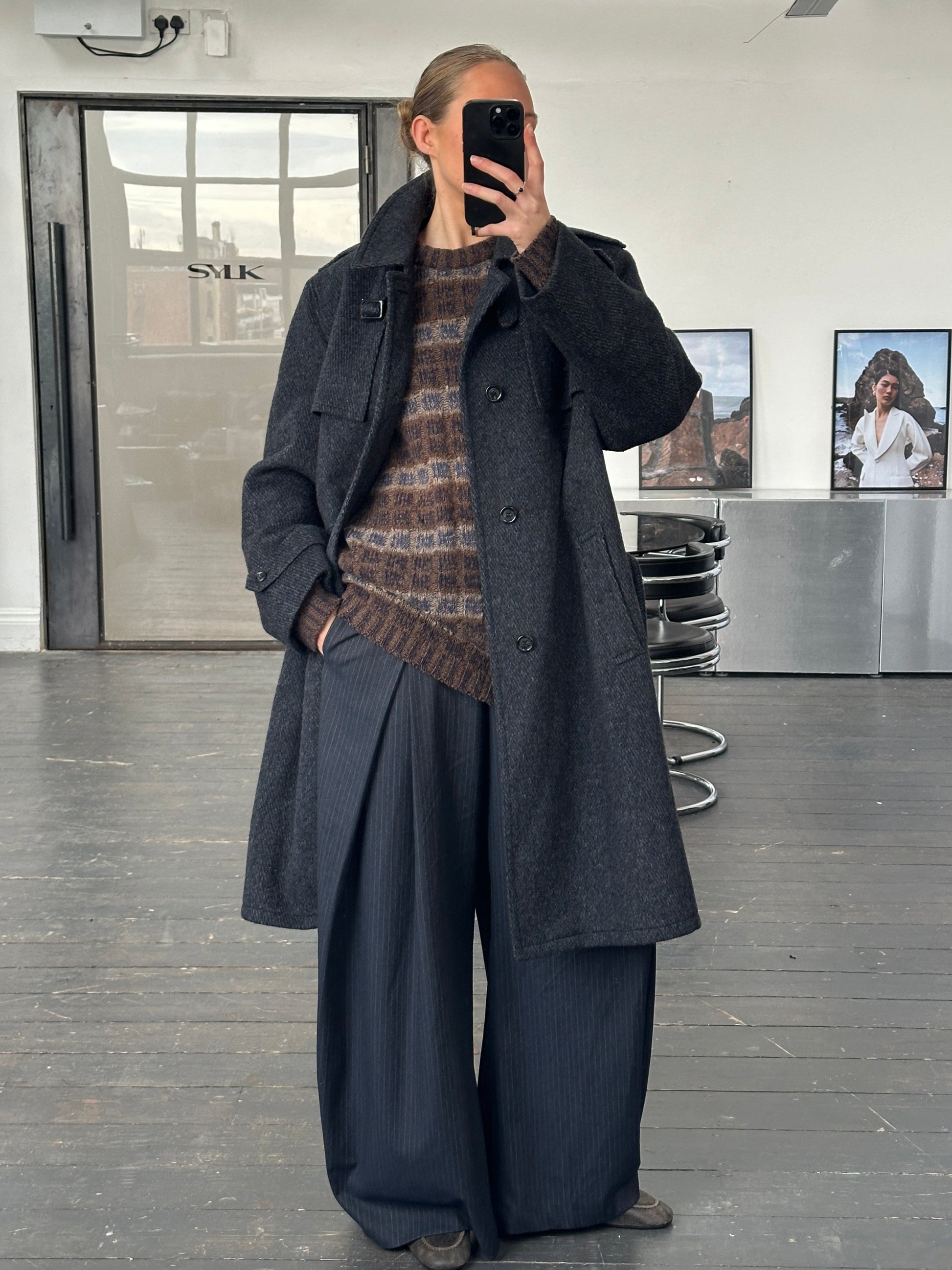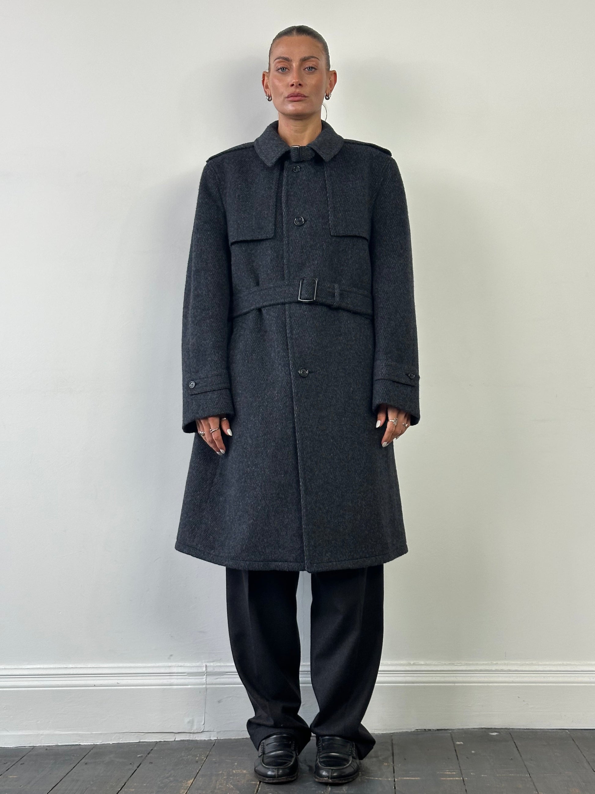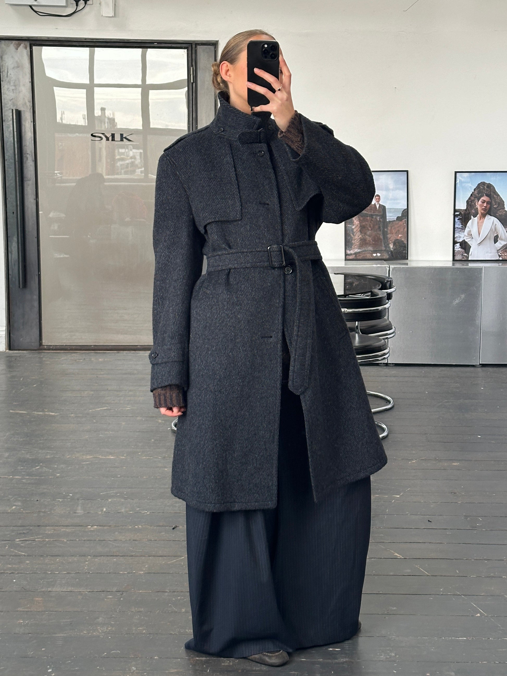 A vintage 1990s navy belted coat crafted from brushed pure wool, featuring a high neck fastening with buckle detail and a clean utilitarian silhouette. Designed with a relaxed oversized fit and strong shoulder line.