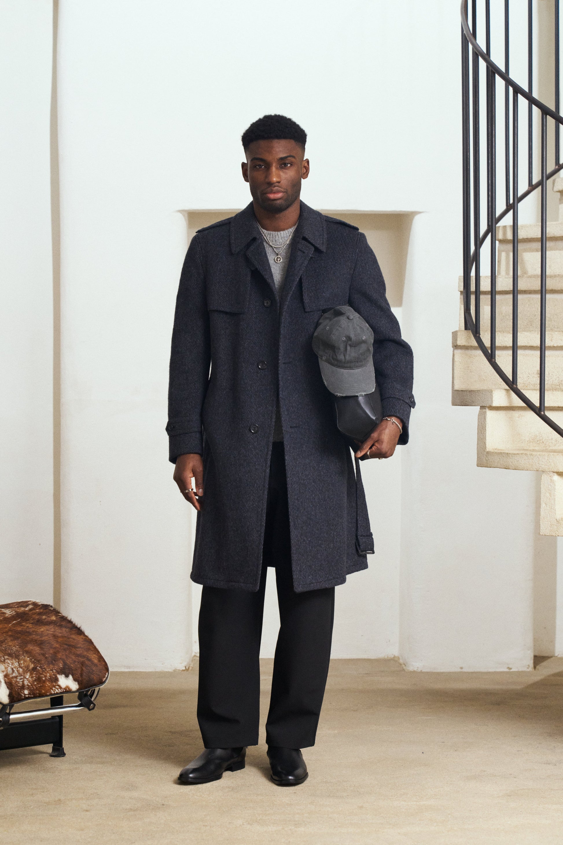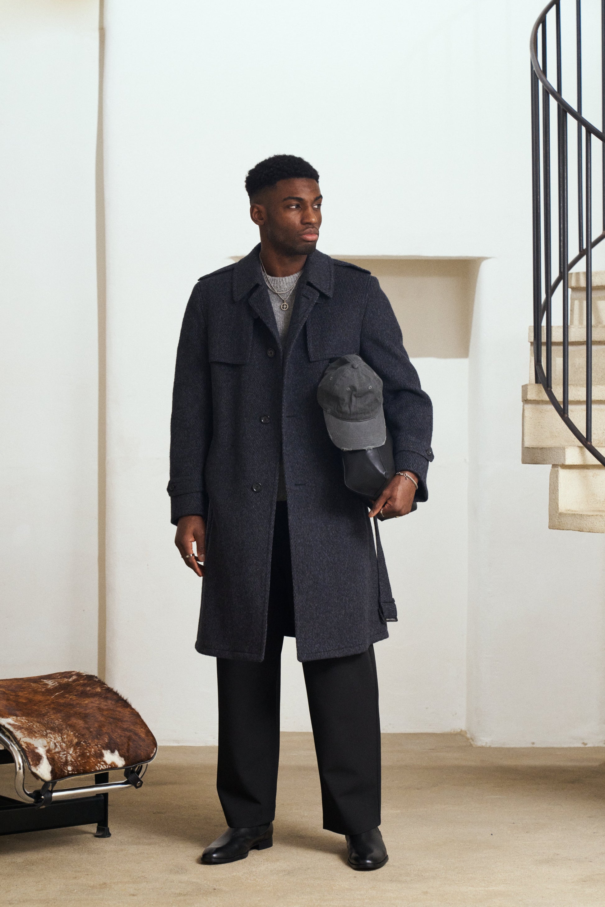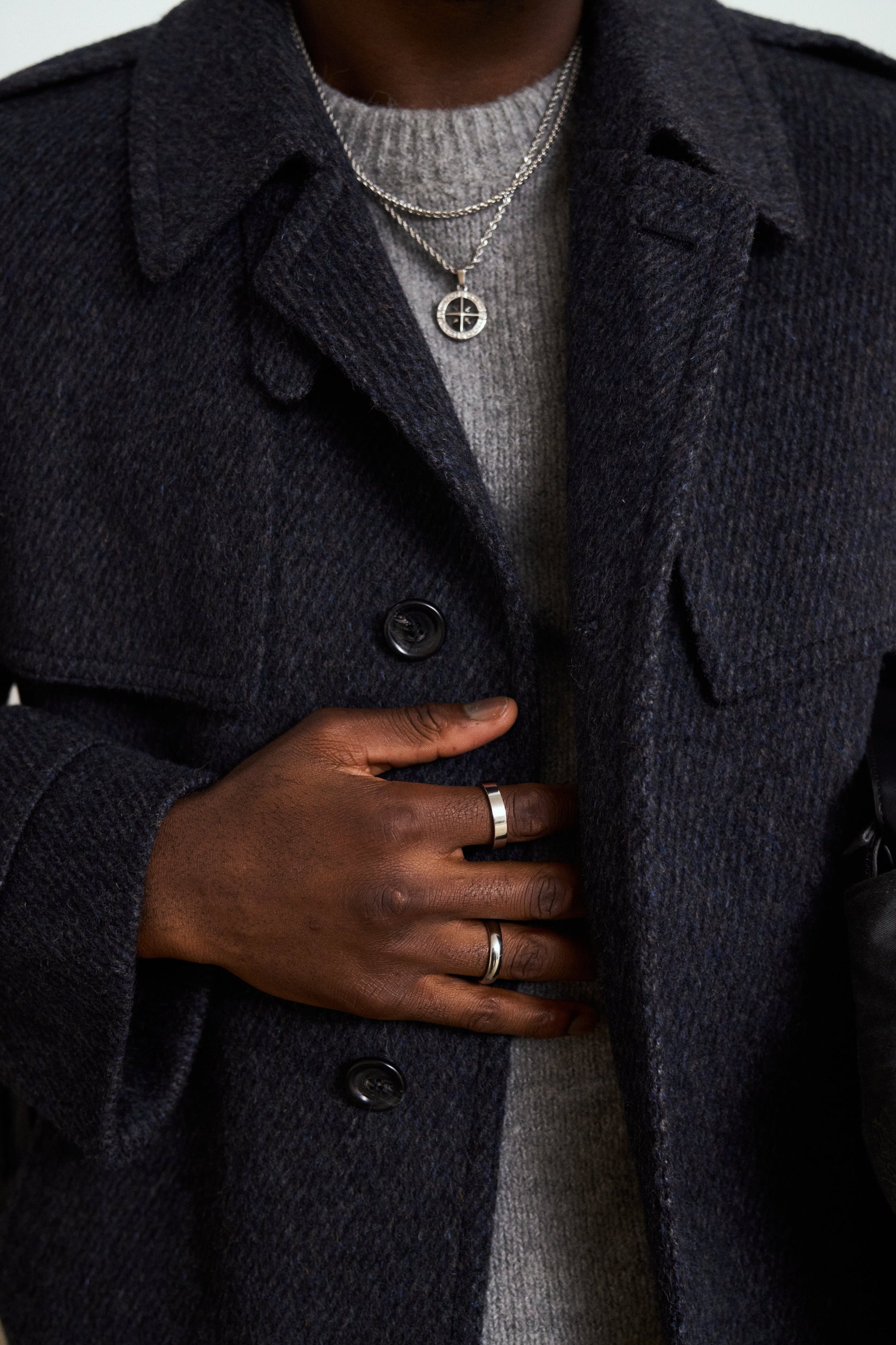 A vintage 1990s navy belted coat crafted from brushed pure wool, featuring a high neck fastening with buckle detail and a clean utilitarian silhouette. Designed with a relaxed oversized fit and strong shoulder line.