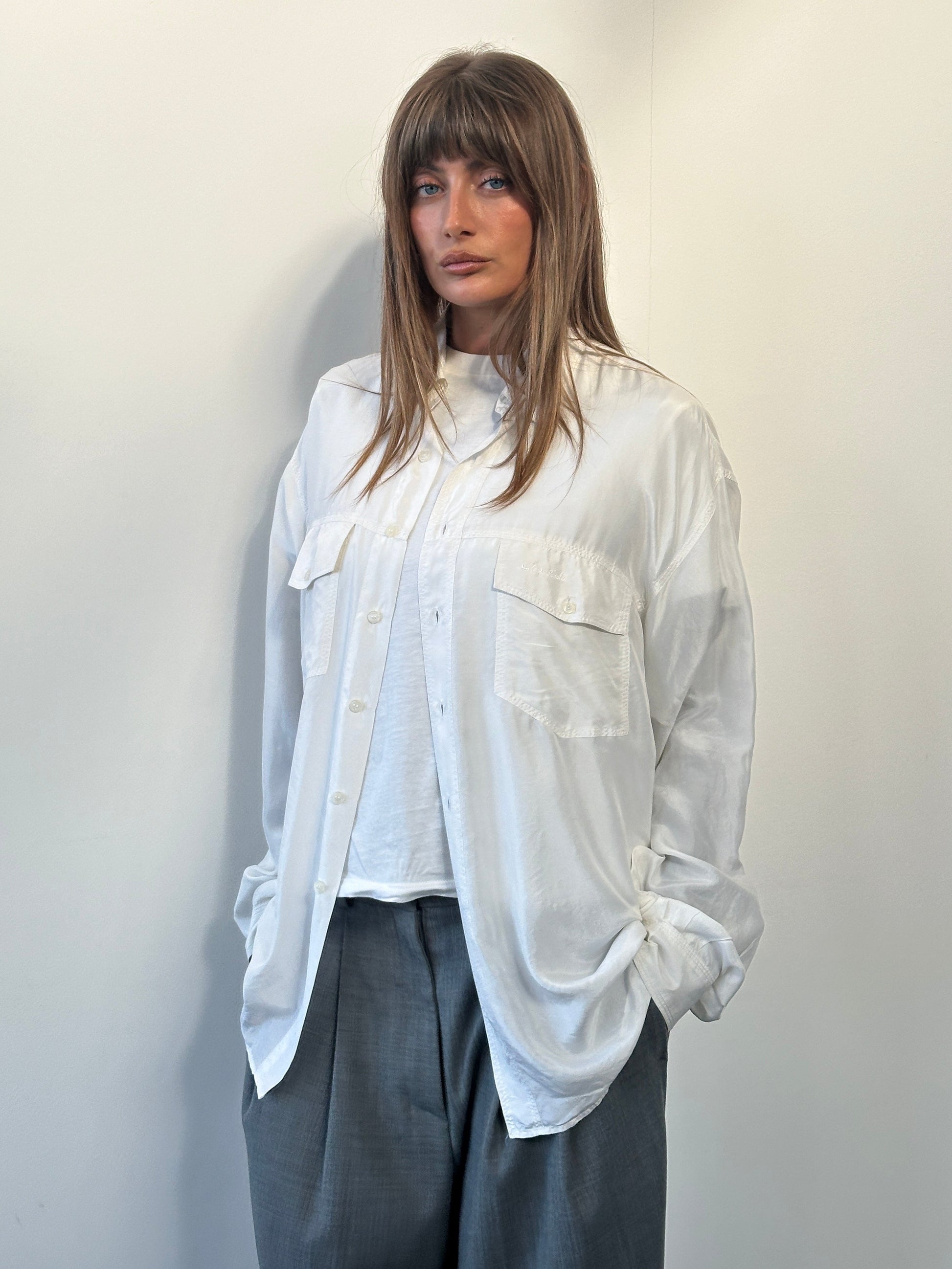 Vintage white pure silk shirt by Umberto Rosetti featuring a soft drape, subtle chest embroidery and relaxed tailoring. A minimal 1990s piece with a clean oversized silhouette.