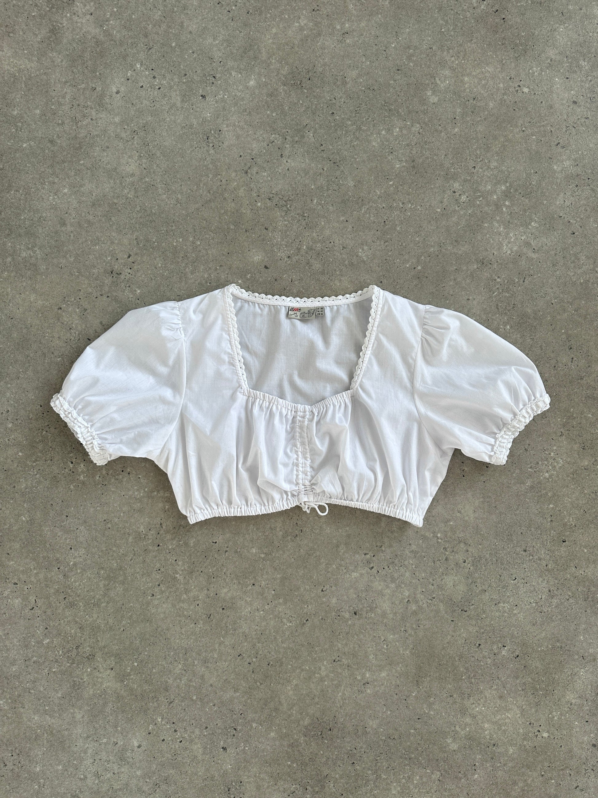 Vintage German Lekra cropped Trachten blouse top in crisp white cotton blend, with puff sleeves, lace trim, and gathered bustline — a romantic alpine-inspired piece