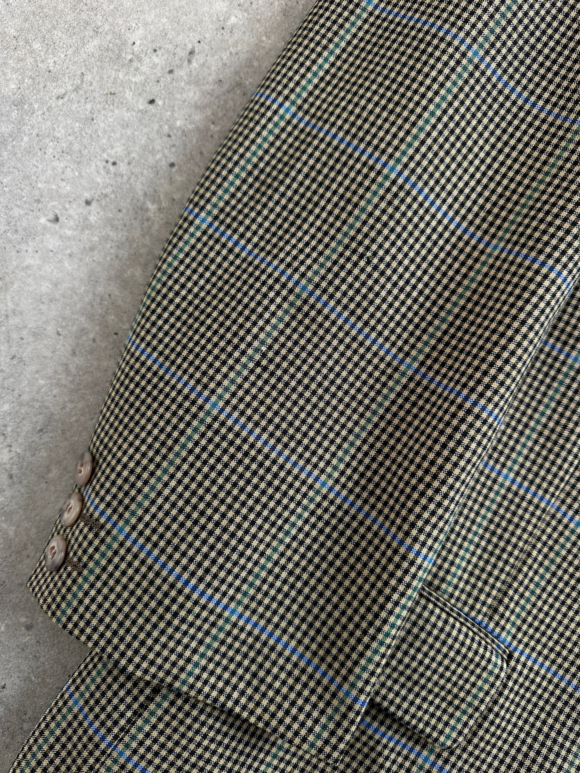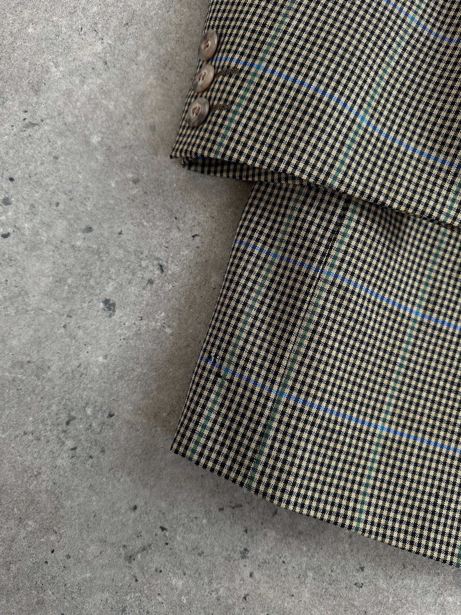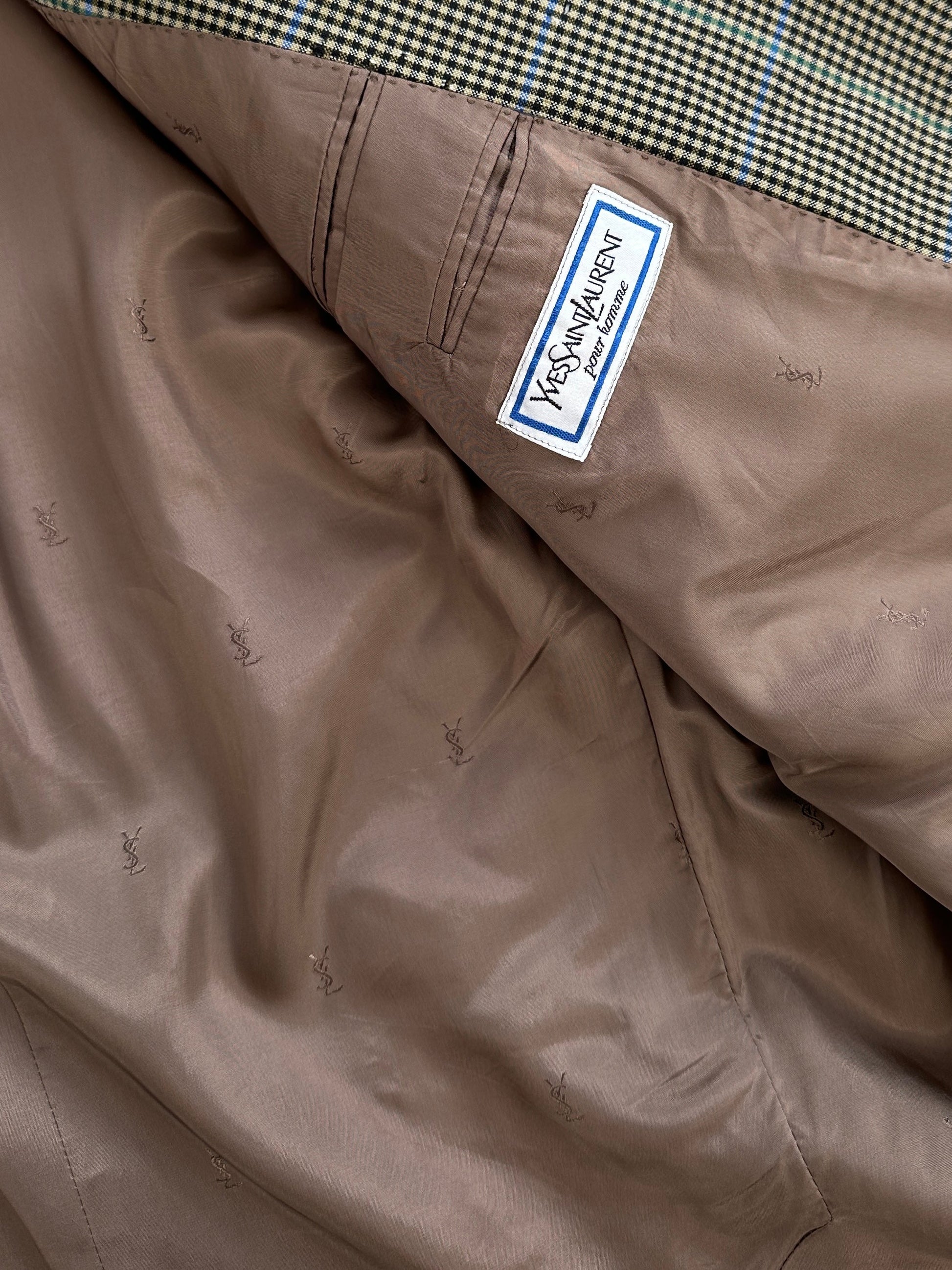 Vintage Yves Saint Laurent Pour Homme blazer in an overall green tone with a multicolour check pattern featuring green, yellow, white, black and subtle blue accents. A classic tailored silhouette from the 1990s, made in France with clean lines and a softly padded shoulder.