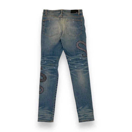 AMIRI GLITTER SNAKE DISTRESSED DENIM JEANS BLUE 34W
