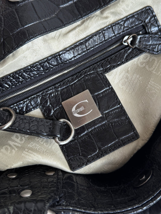 Just Cavalli Chain Black Canvas Leather Handle Hand Bag
