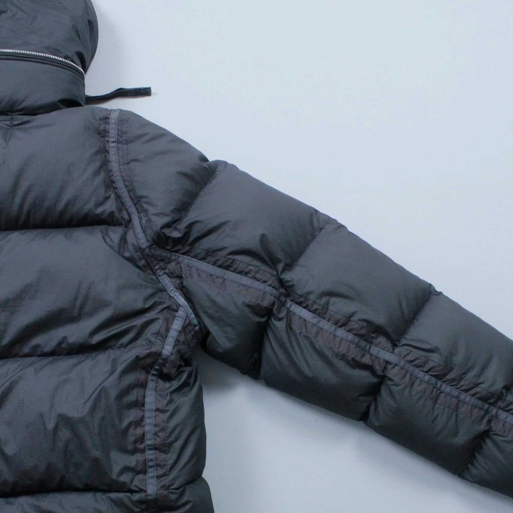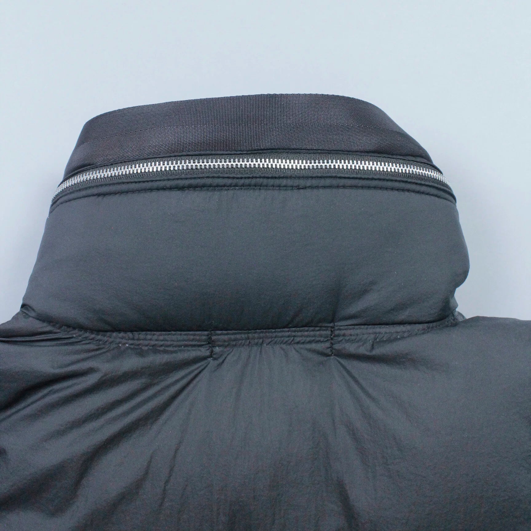 A Japanese featherweight nylon canvas presents this modular constructed goose down filled puffer. Two pockets with slanted zip closure of single piece structure. Adjustable snap fasten cotton stretch cuffs complete the tapered sleeves. A fully concealable ultra-lightweight hood is stored inside the funnel neck collar via a hidden zipper. An extended reinforced zipper features as this piece’s main closure. Stone Island Italy branded plastic toggles complete the hem fastening of this piece. Full appliques and tape seaming in a fine ribbed heavy cotton. An amazing and highly futuristic piece from the Paul Harvey era.