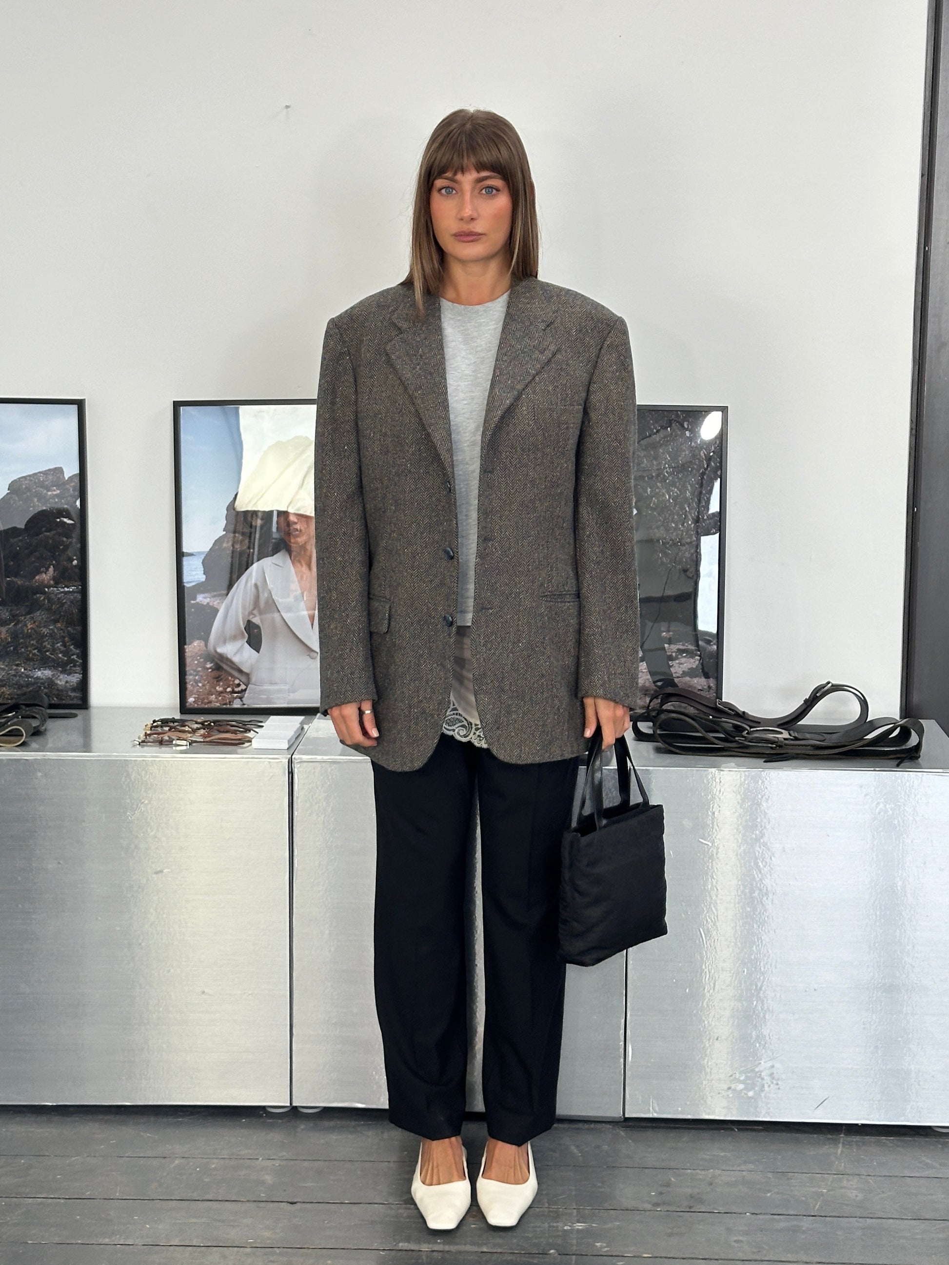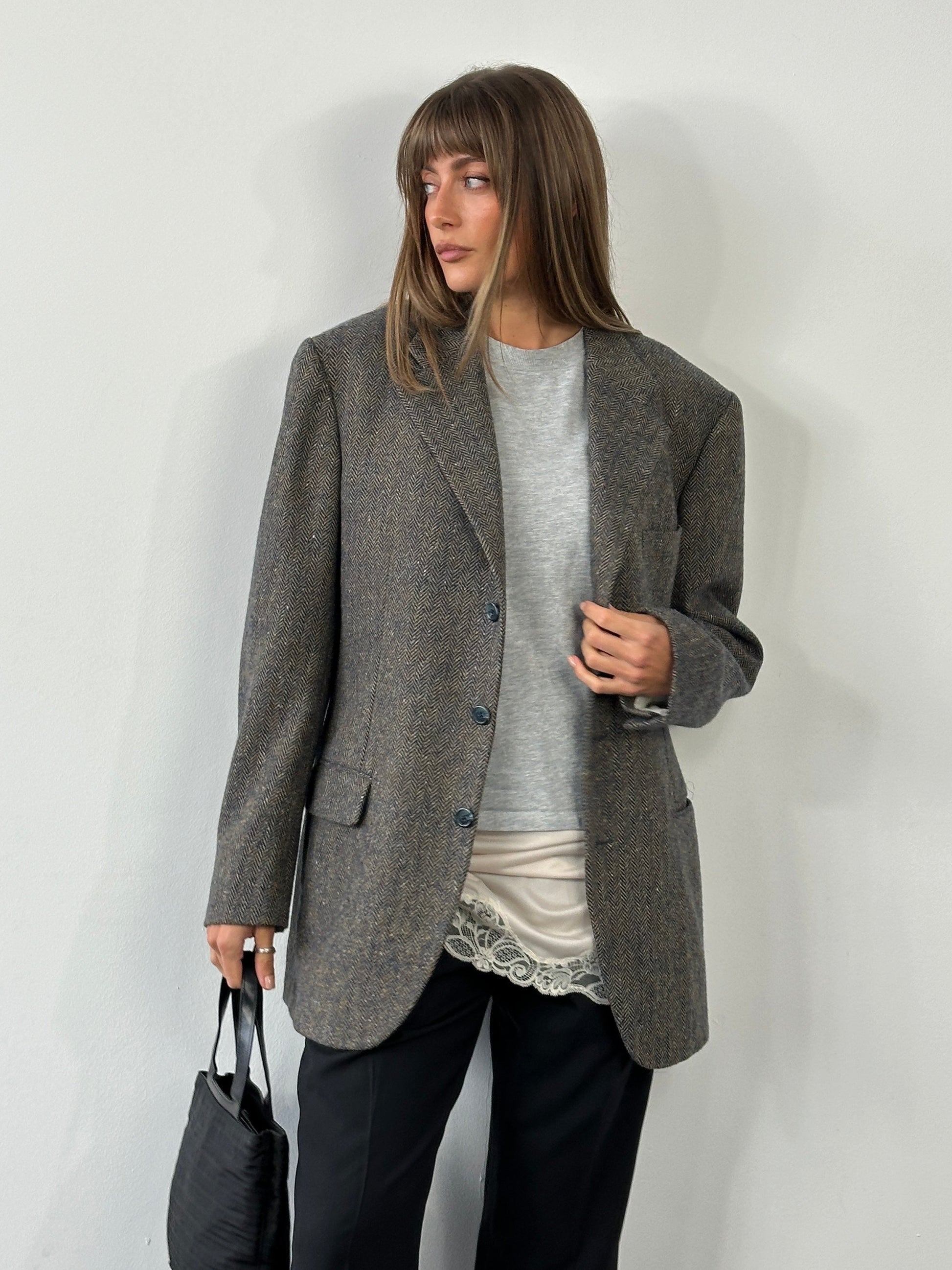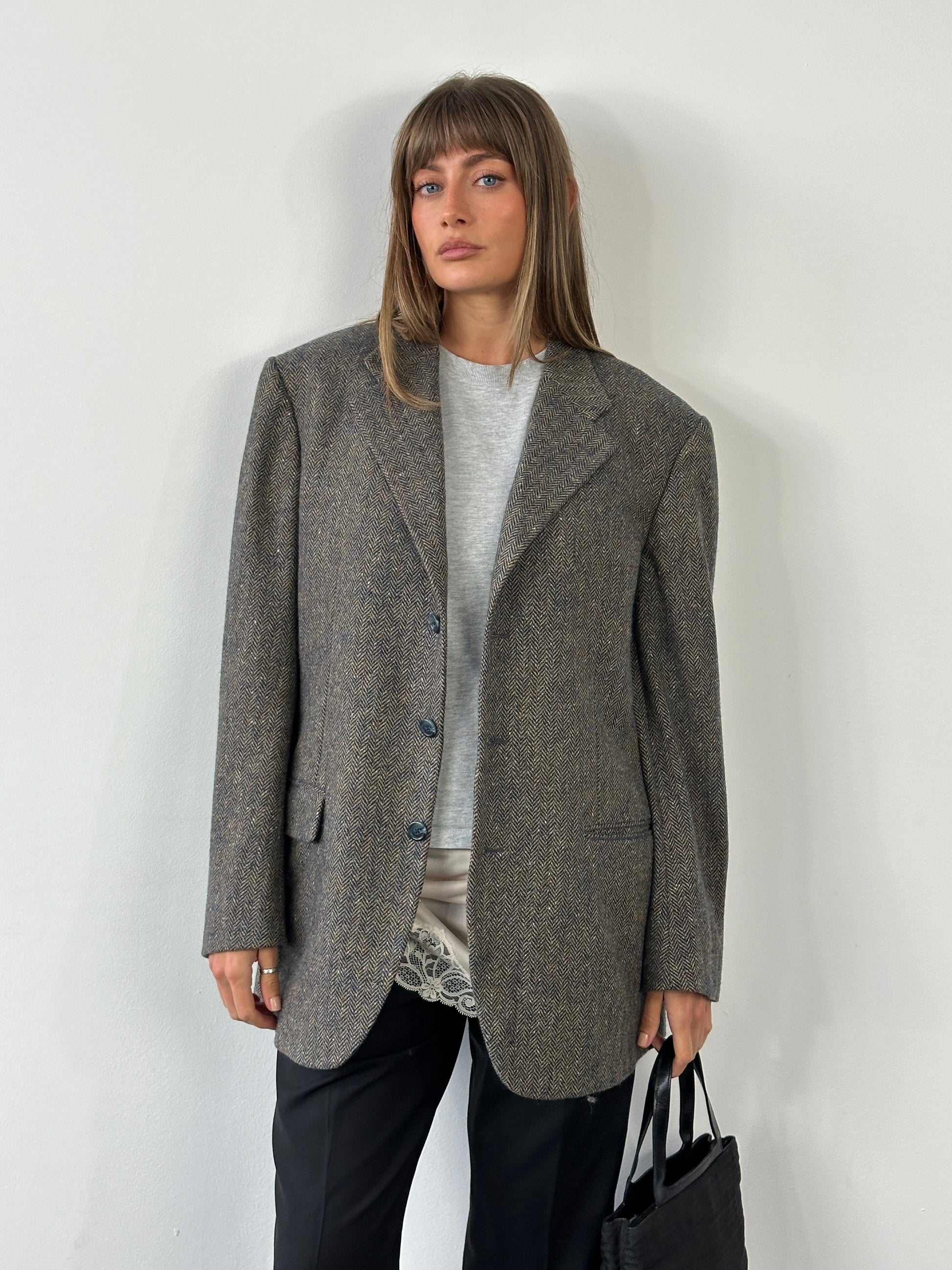 A classic 1990s Burberrys of London herringbone wool blazer featuring a brown and blue woven pattern with a soft brushed handle. Tailored in Italy with a structured silhouette and clean notched lapels.