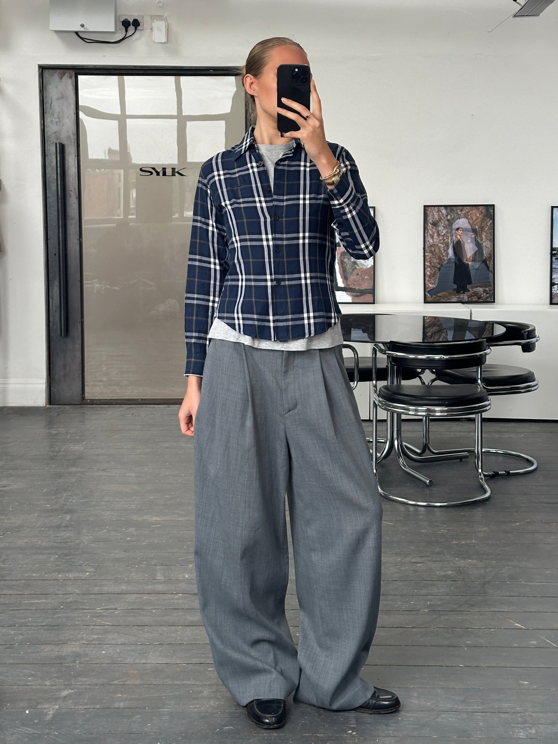 Burberry London 2000s navy heritage check shirt with tonal EKD logo embroidery and engraved buttons. tailored from pure cotton with subtle sleeve emblem detailing.