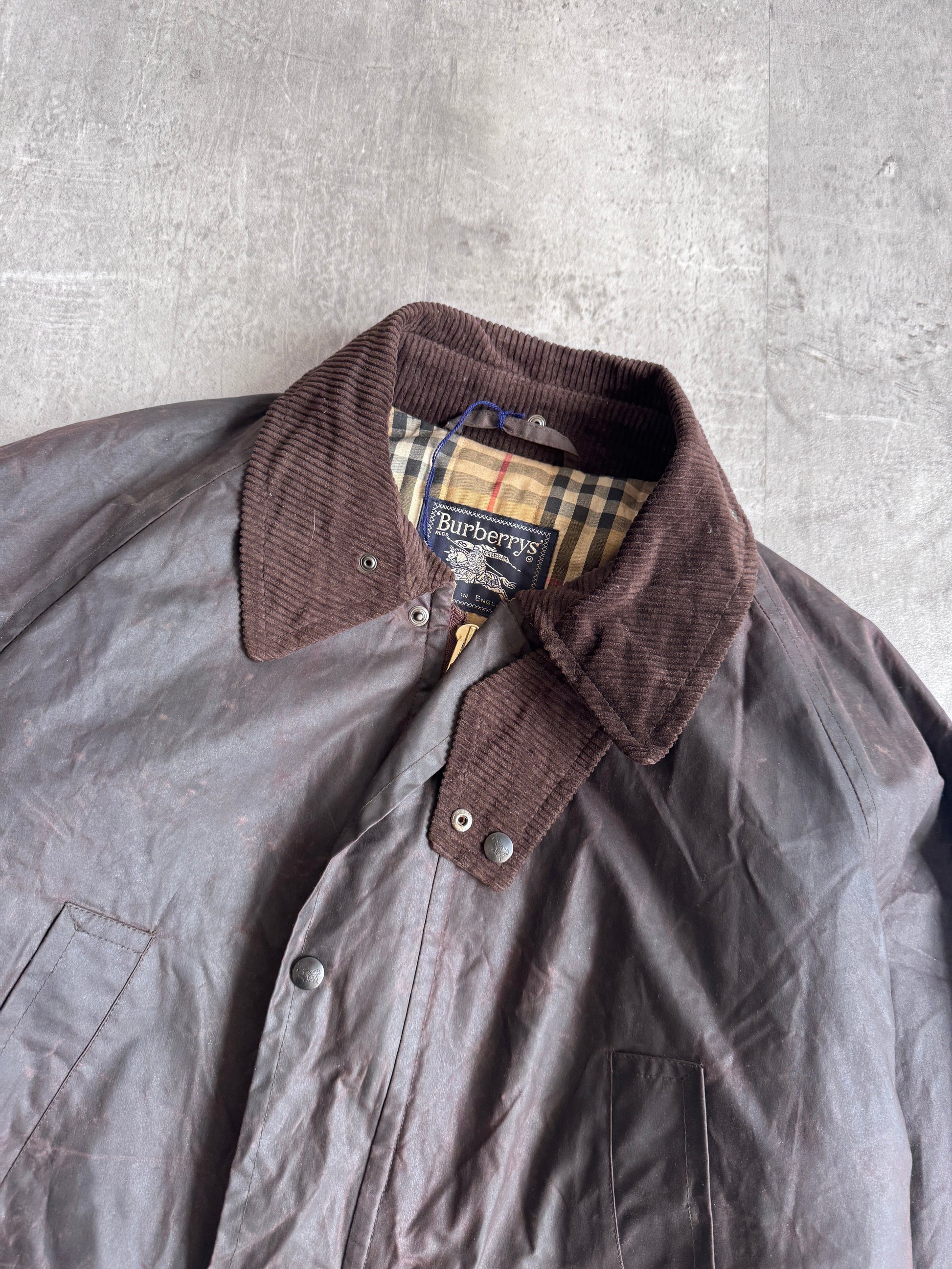 A rugged and timeless Burberry parka, crafted in a wax-coated cotton for weather resistance and durability. Designed in a deep brown tone with classic utilitarian detailing, this jacket is finished with a corduroy collar and Burberry’s signature Nova Check lining. A heritage outerwear staple that blends function and luxury.