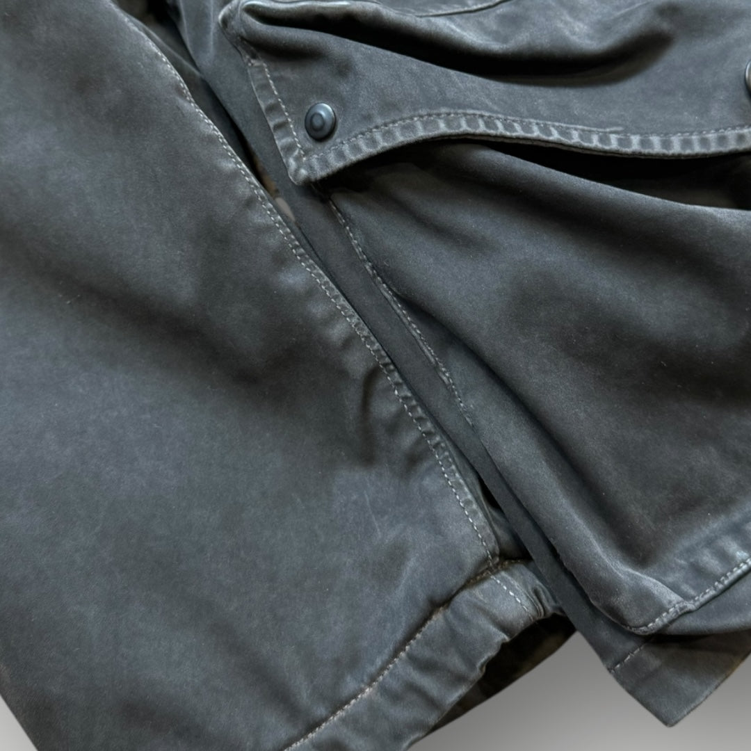 • Waxed outer with winter lining, multi press-button pockets, adjustable goggled hood, hidden compartments on the inside, rope adjustable waist and main zip and button closure.