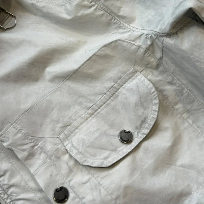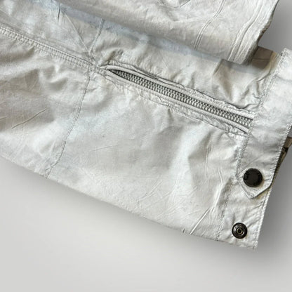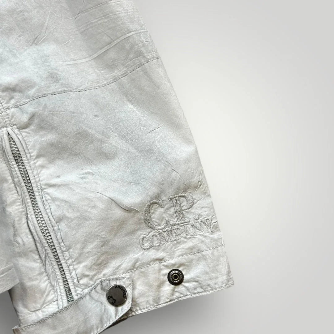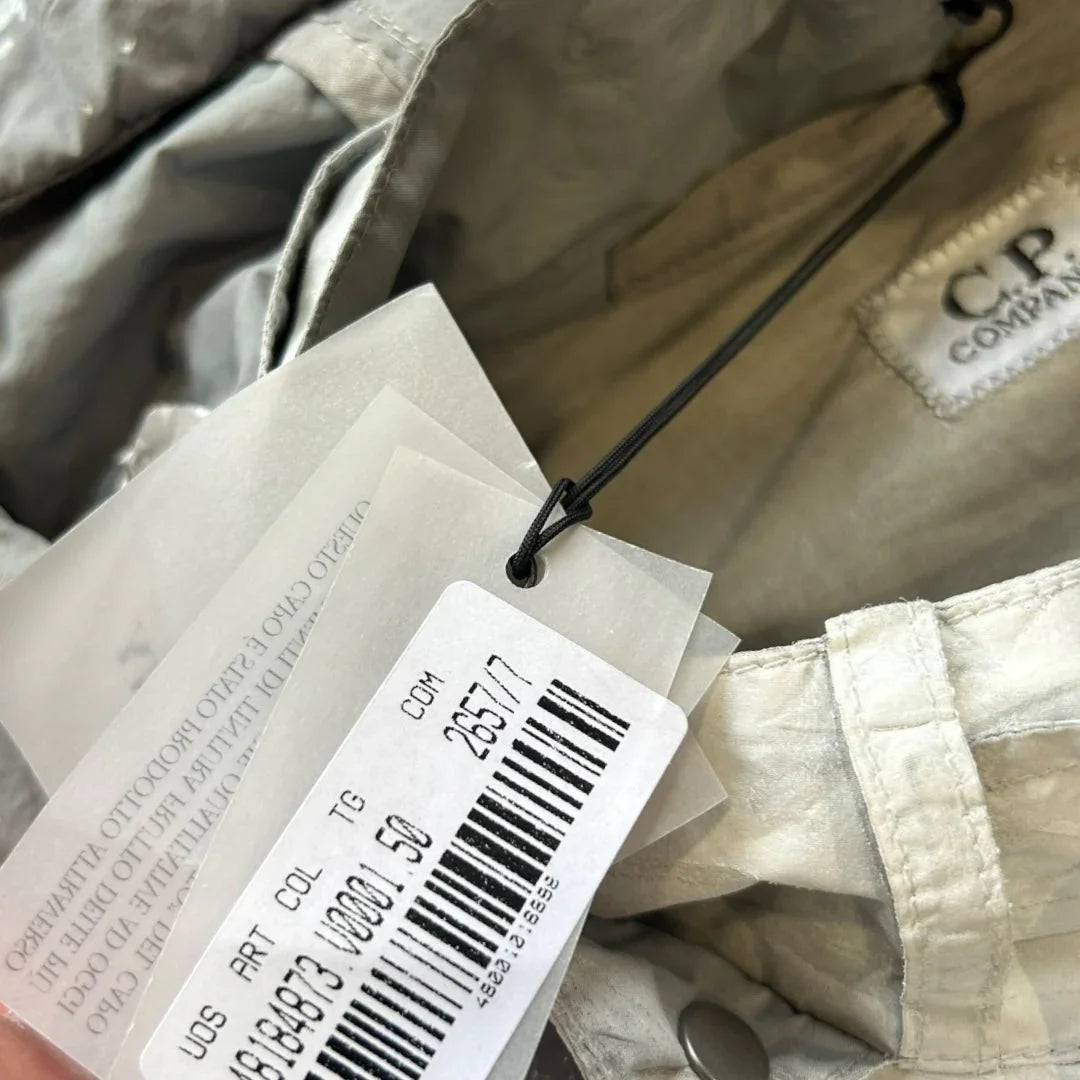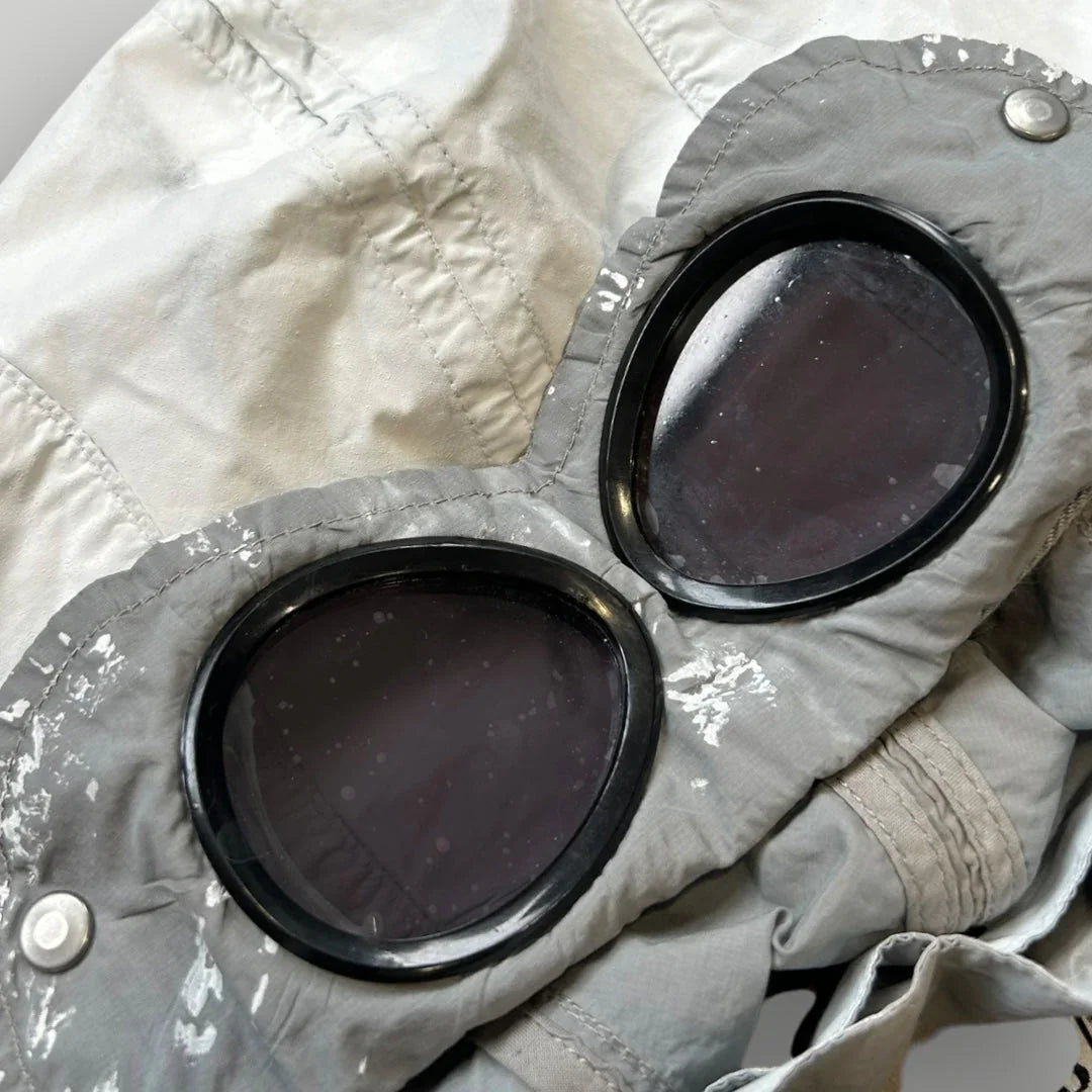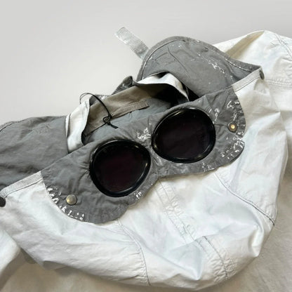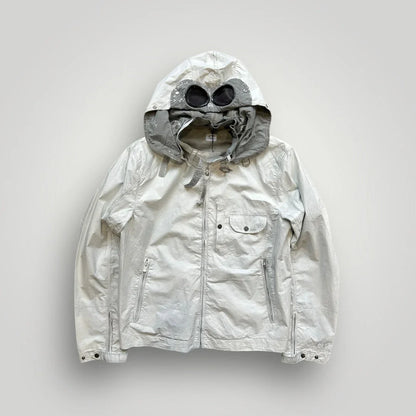 White Mille Miglia jacket in cotton/nylon canvas with light manual rubberizing treatment that makes each garment unique. Two diagonal pockets closed by zip and a patch on the chest with side opening closed by snap and small pocket with lapel closed by snap. Zip on the bottom of the sleeve. Detachable hood with lenses. Closed by zip. CP logo embroidered to left cuff.