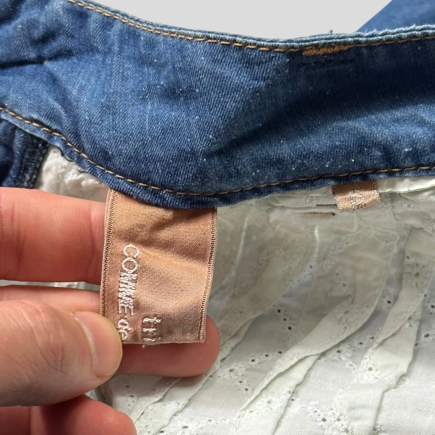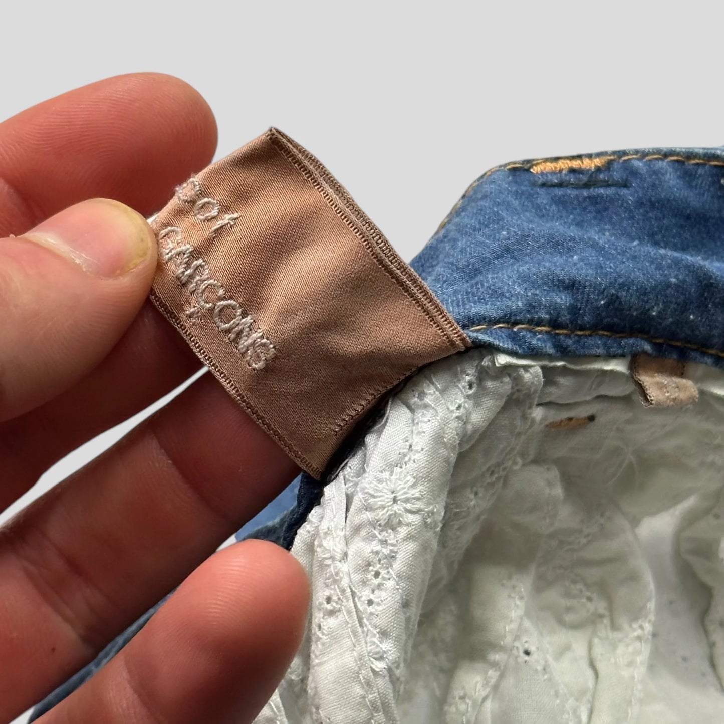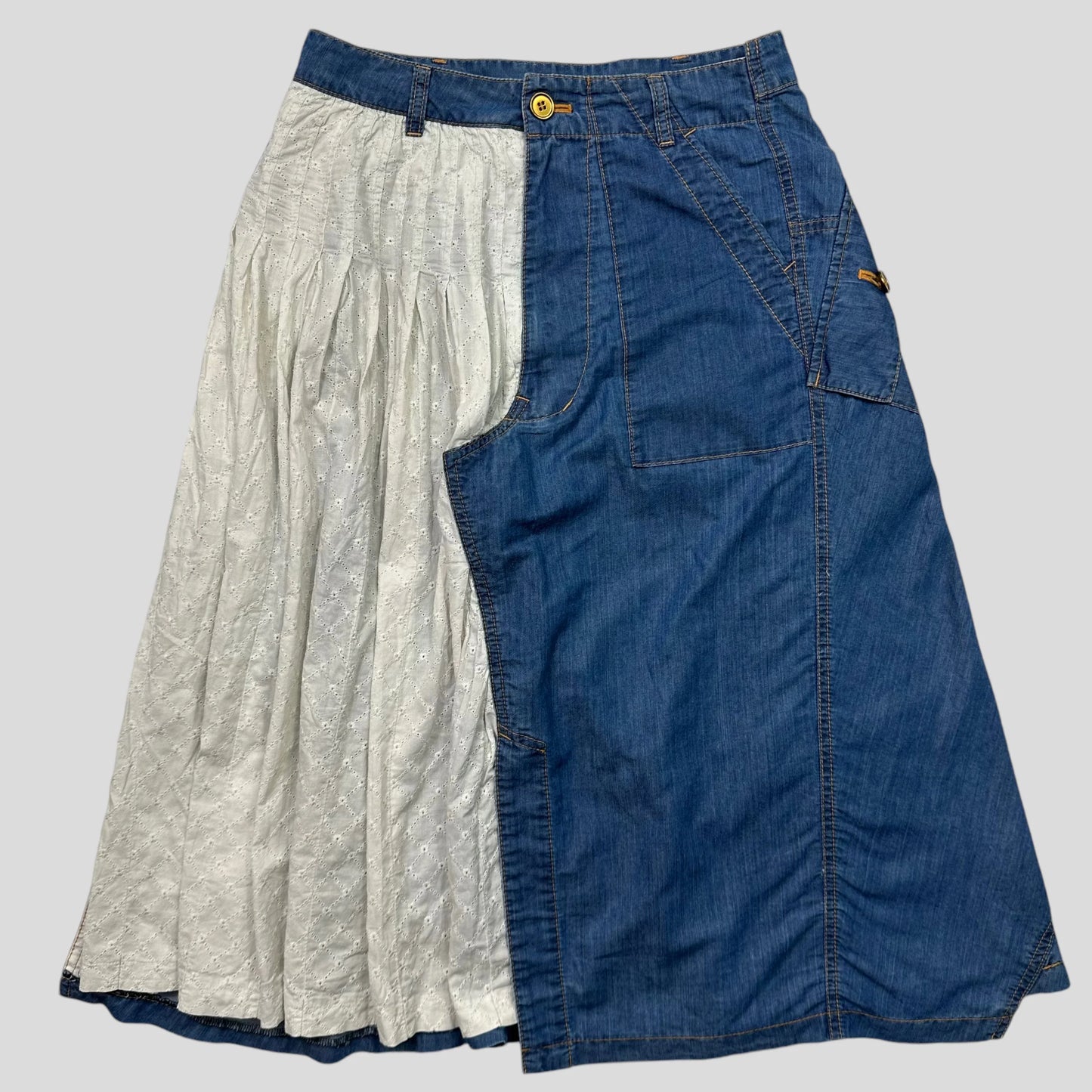 Very rare early 2000’s Comme Des Garçons skirt, unique white brodiere panel split with a denim cargo skirt, large buttoned pockets on back and slot pockets  further down, hand pockets at either side, made in Japan.