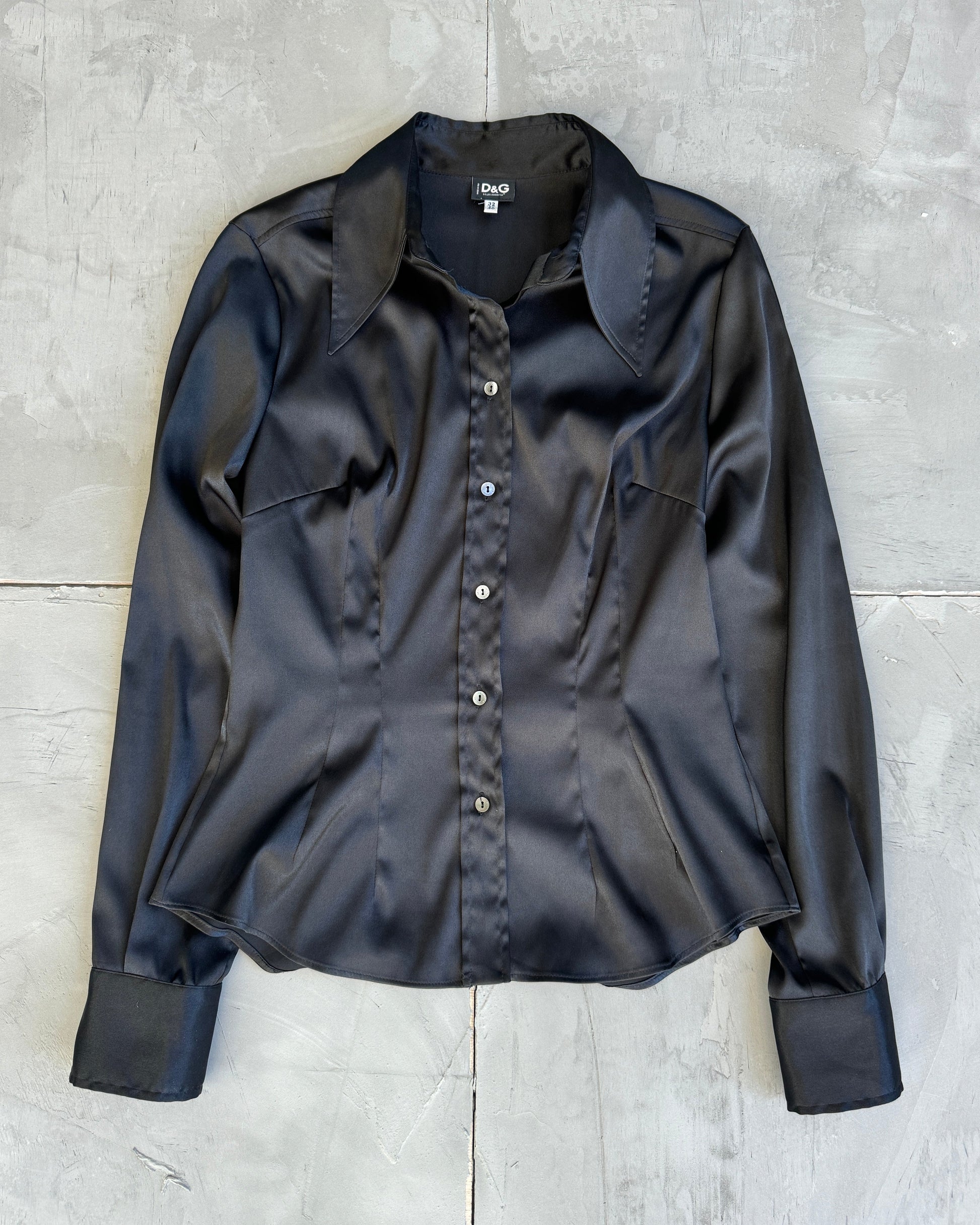 Black satin long sleeve shirt featuring a wide dagger collar.