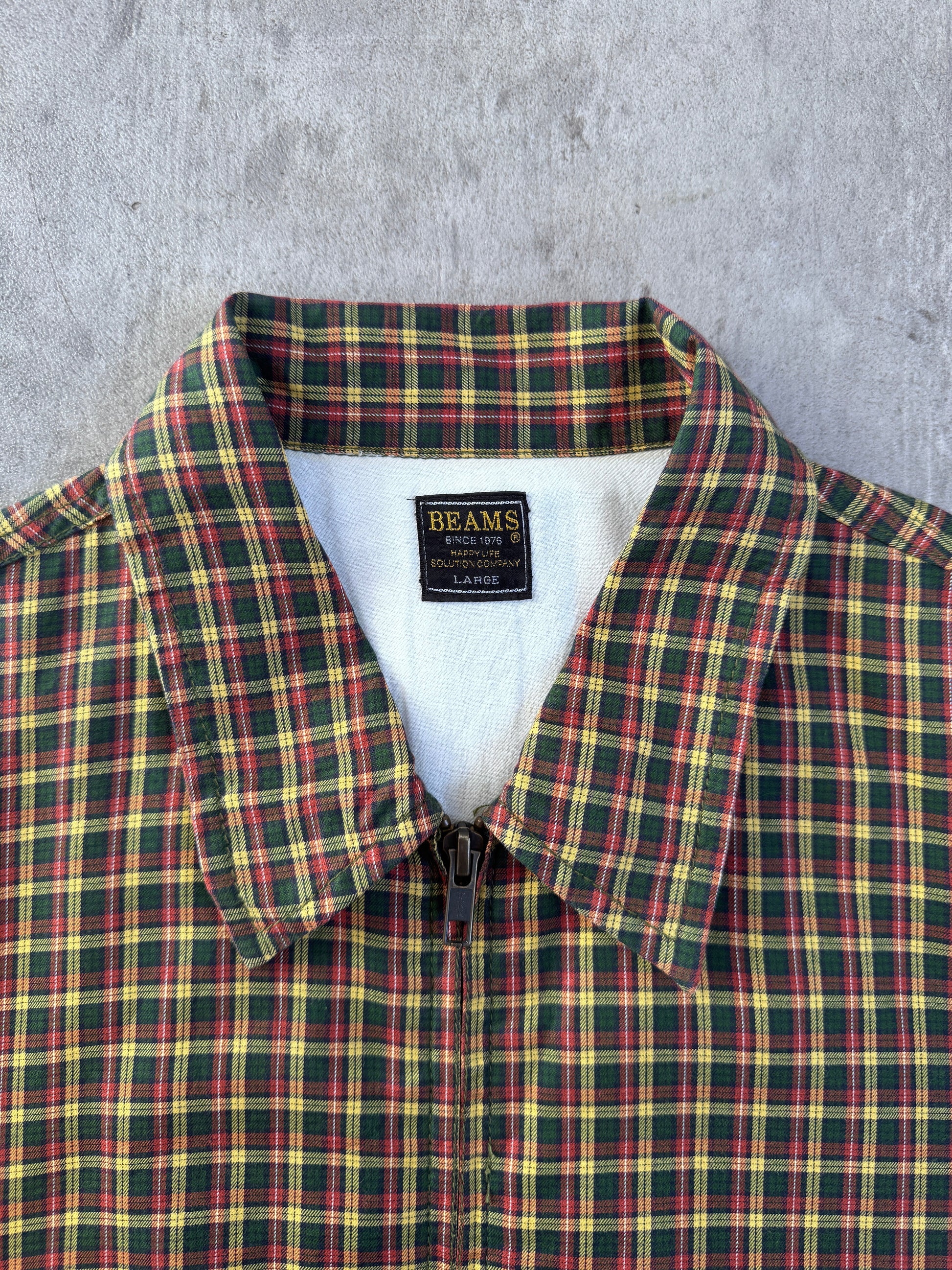 A clean example of early 2000s Japanese streetwear from Beams. This plaid bomber jacket captures that understated Y2K aesthetic — minimal branding, sharp tailoring, and effortless everyday wearability.