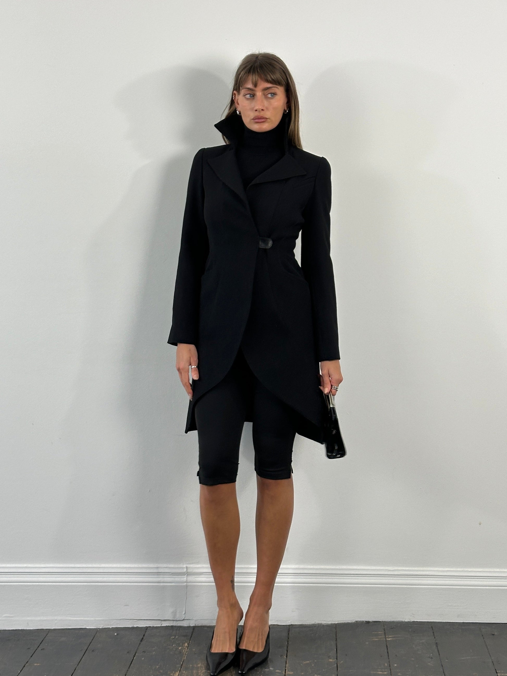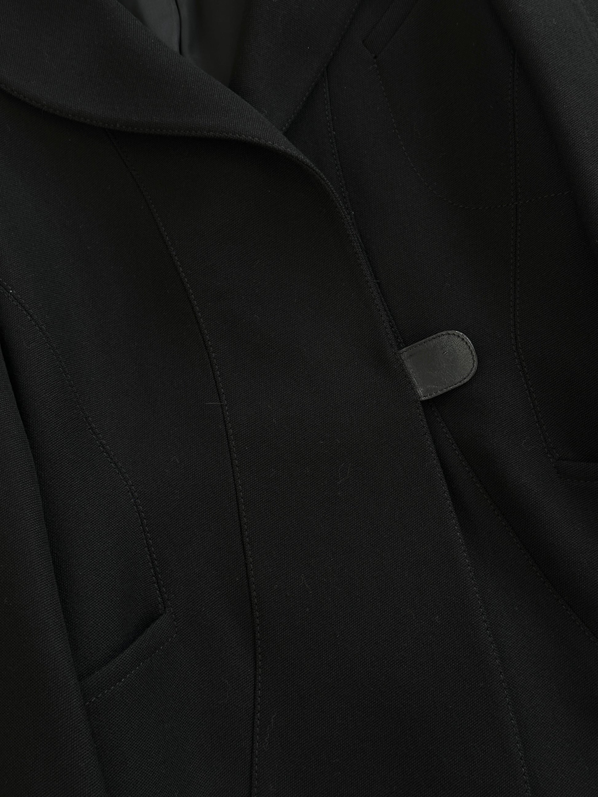 A vintage 2000s Emporio Armani tailored coat in a deep black tone with sculpted seams and a curved silhouette. A refined minimalist shape with quiet luxury detailing.