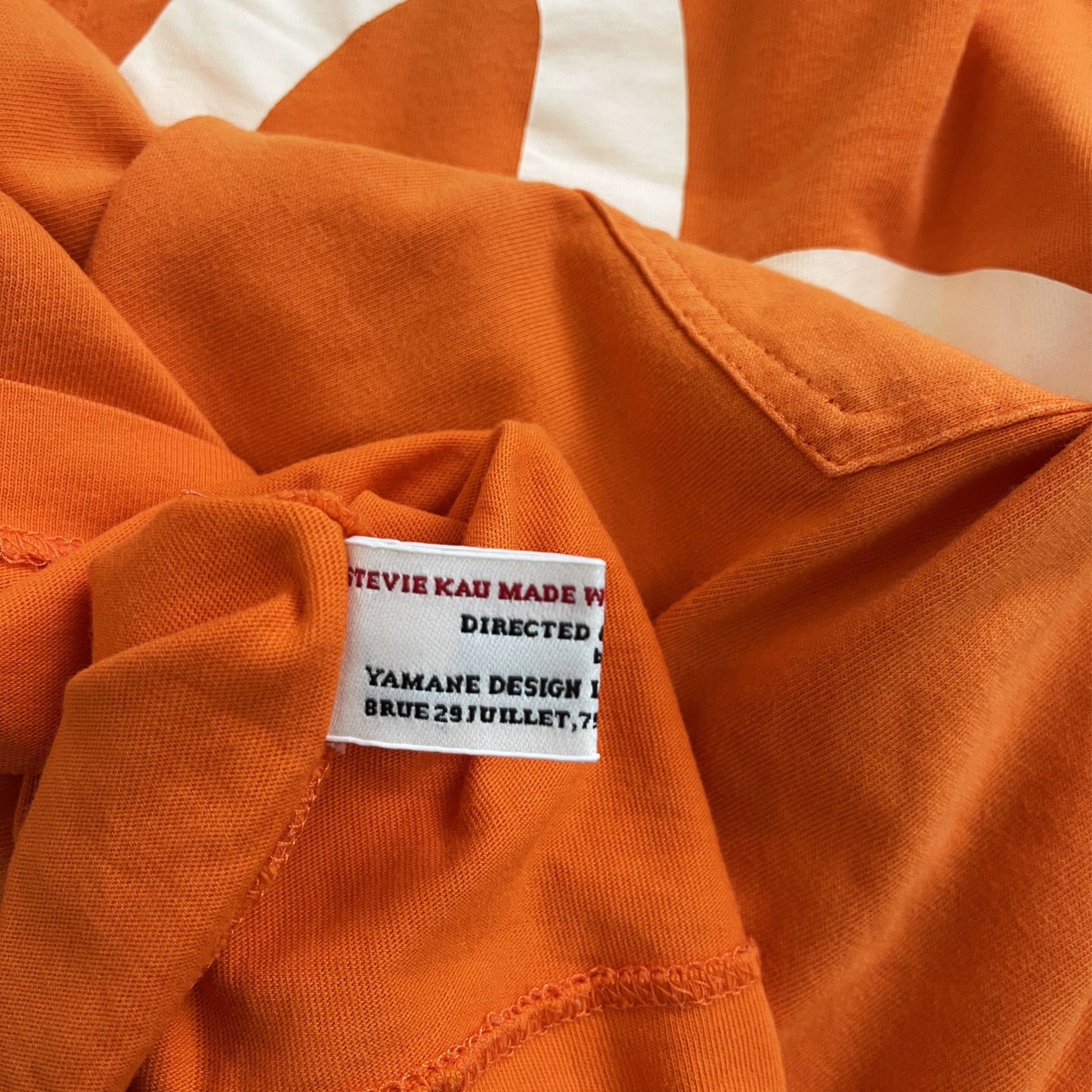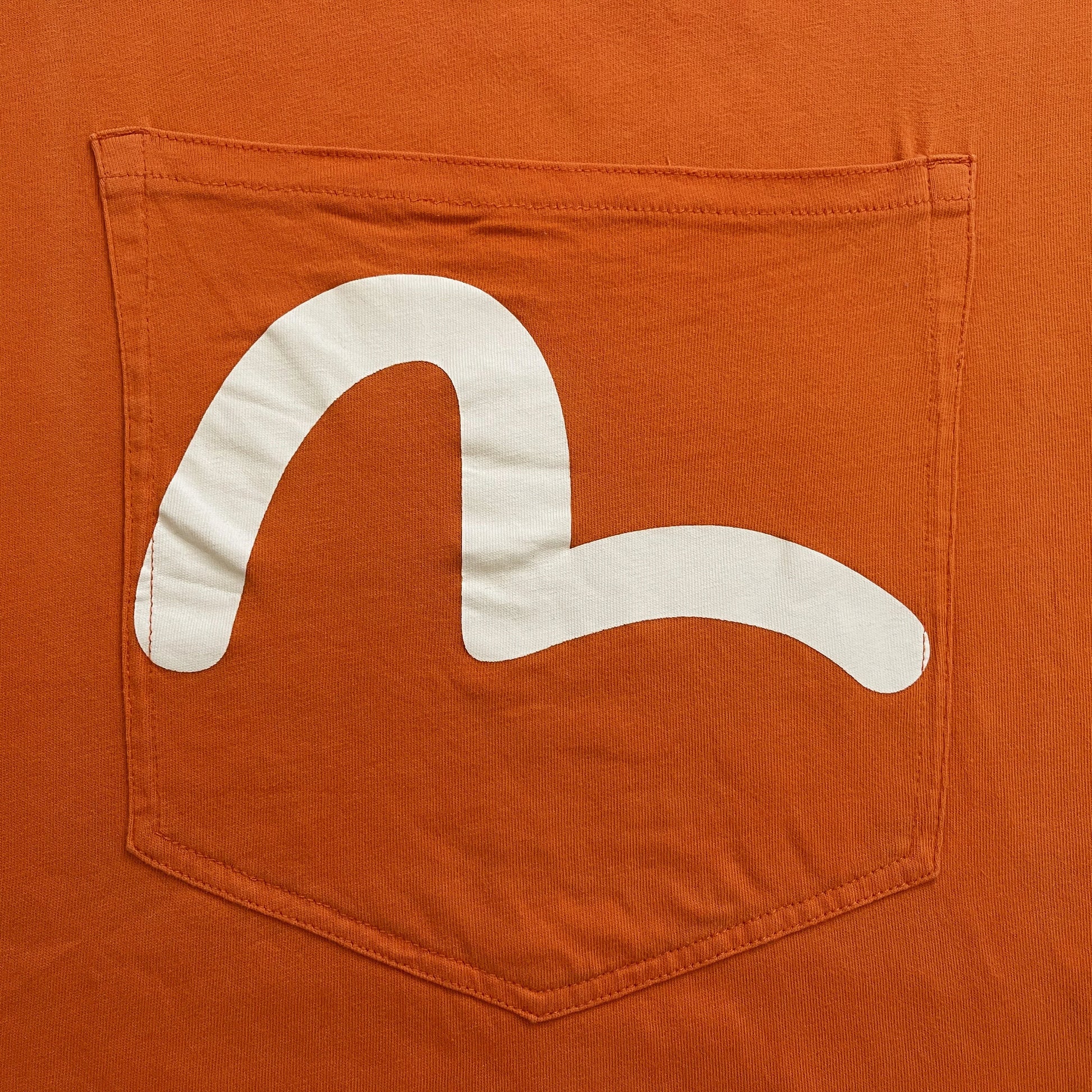 Evisu mens orange t-shirt with seagull logo on front pocket.