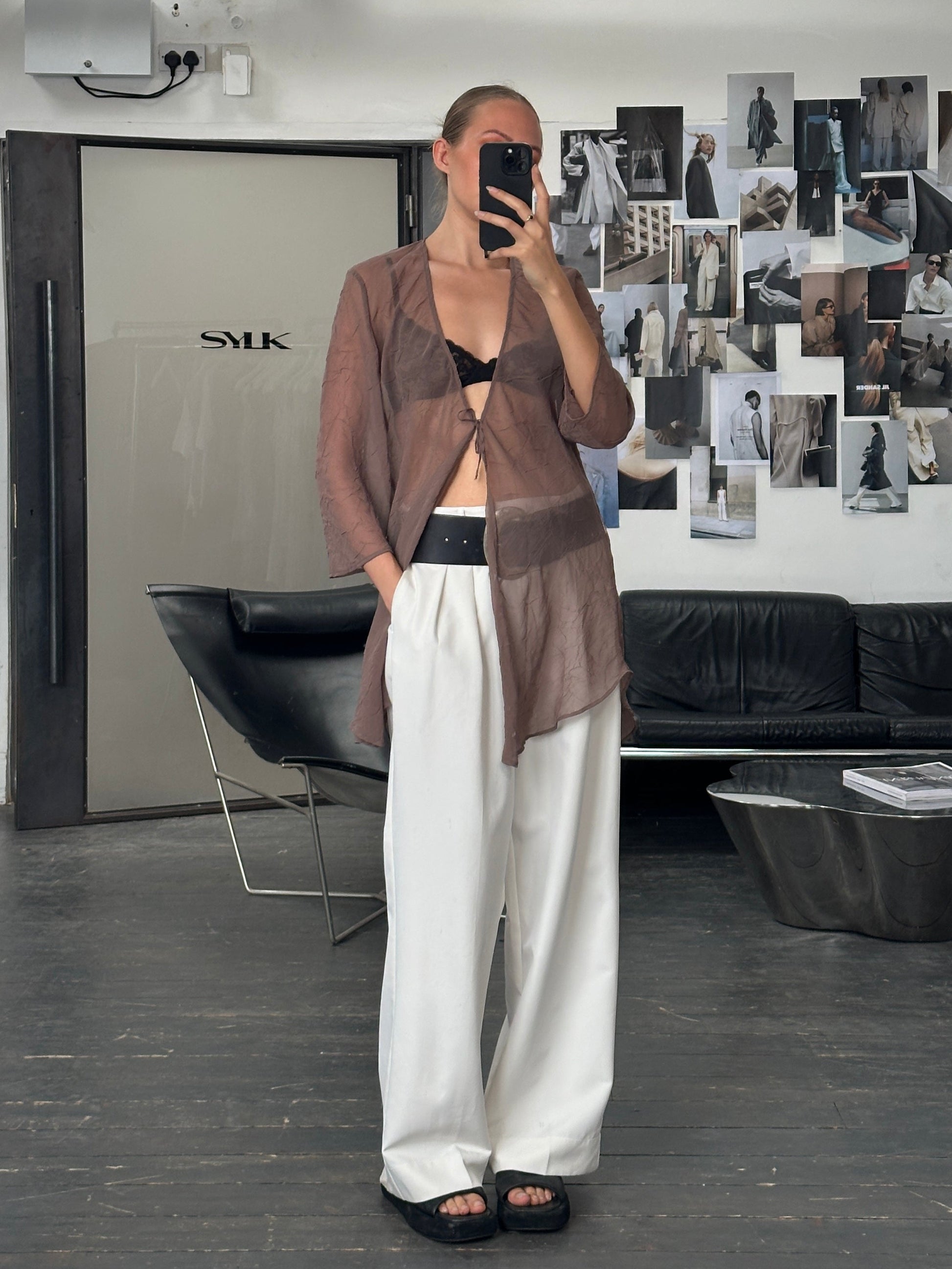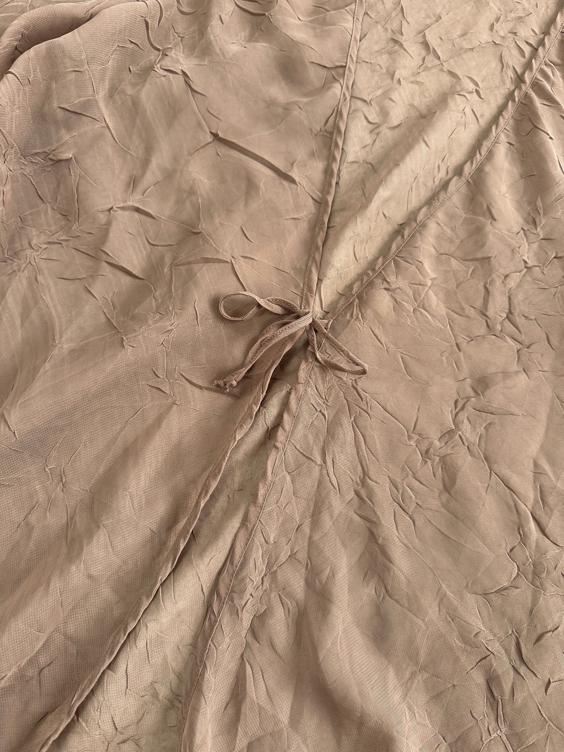 A sheer Italian robe-dress, crafted in crushed-texture polyester with a fluid, diaphanous drape. Cut with wide kimono sleeves and a plunging neckline, Finished in a muted taupe tone, it moves between resort layering and evening statement with ease.