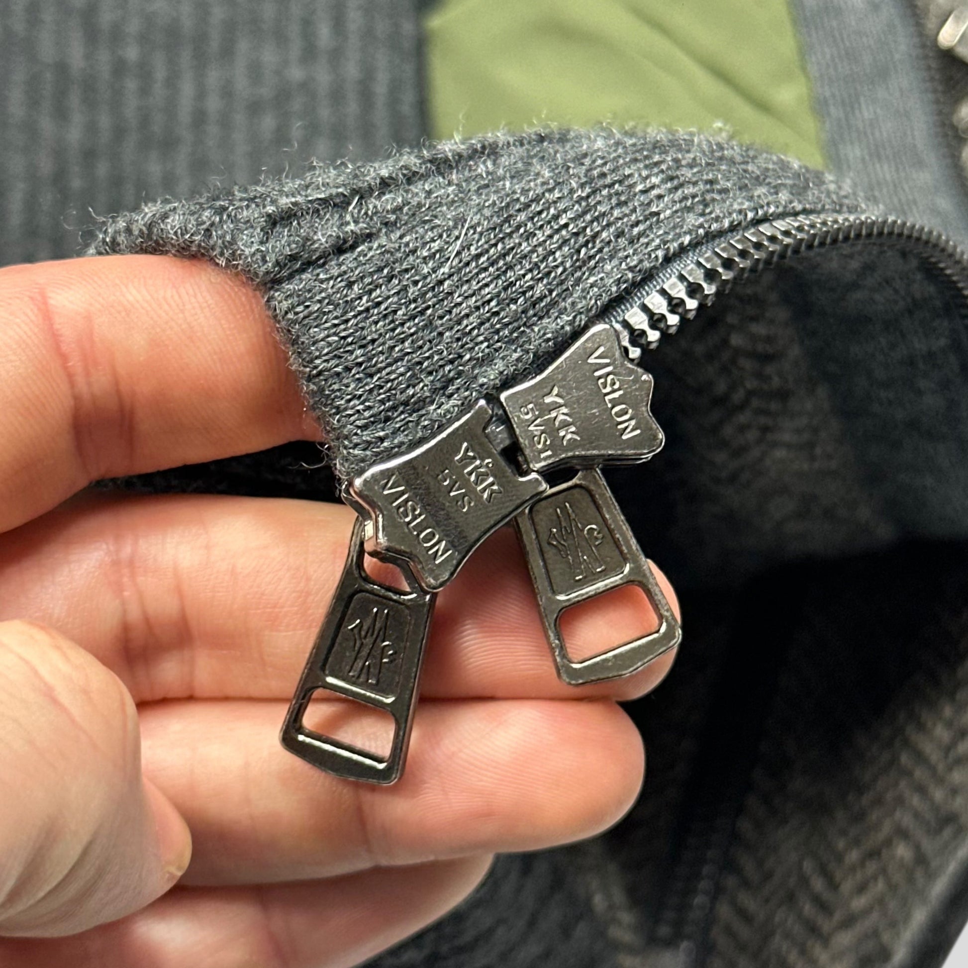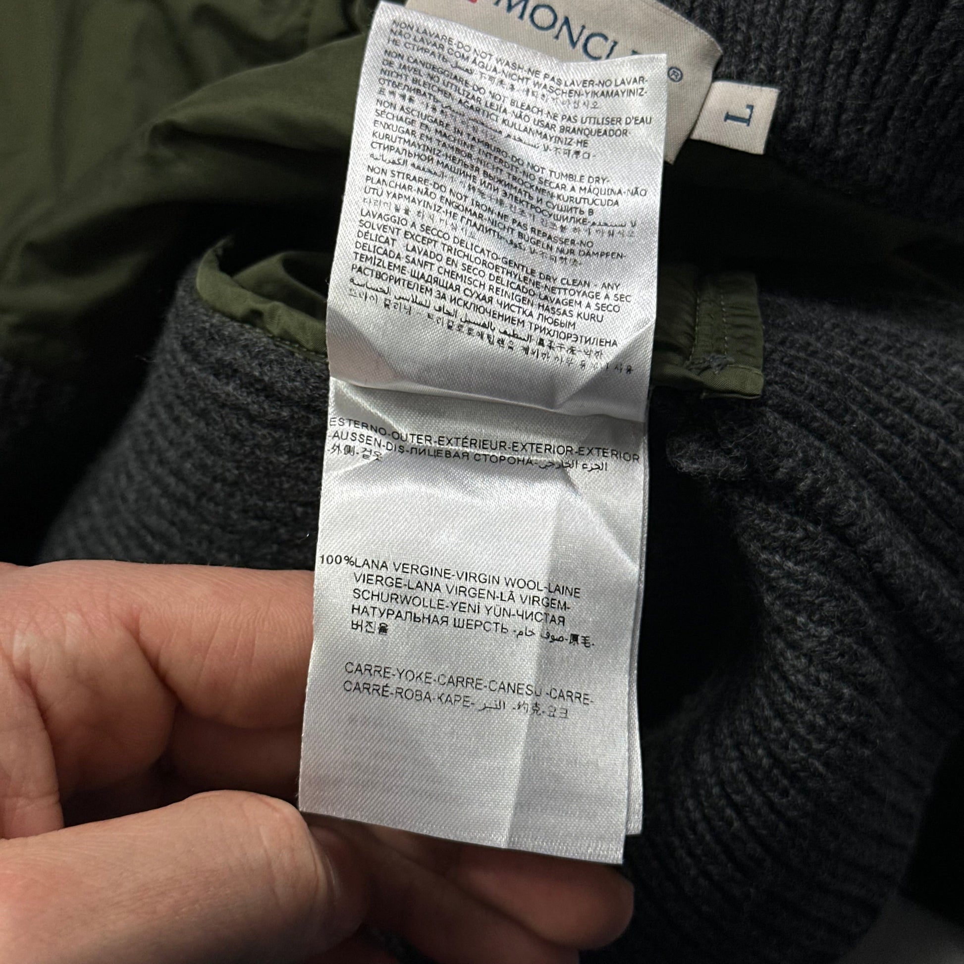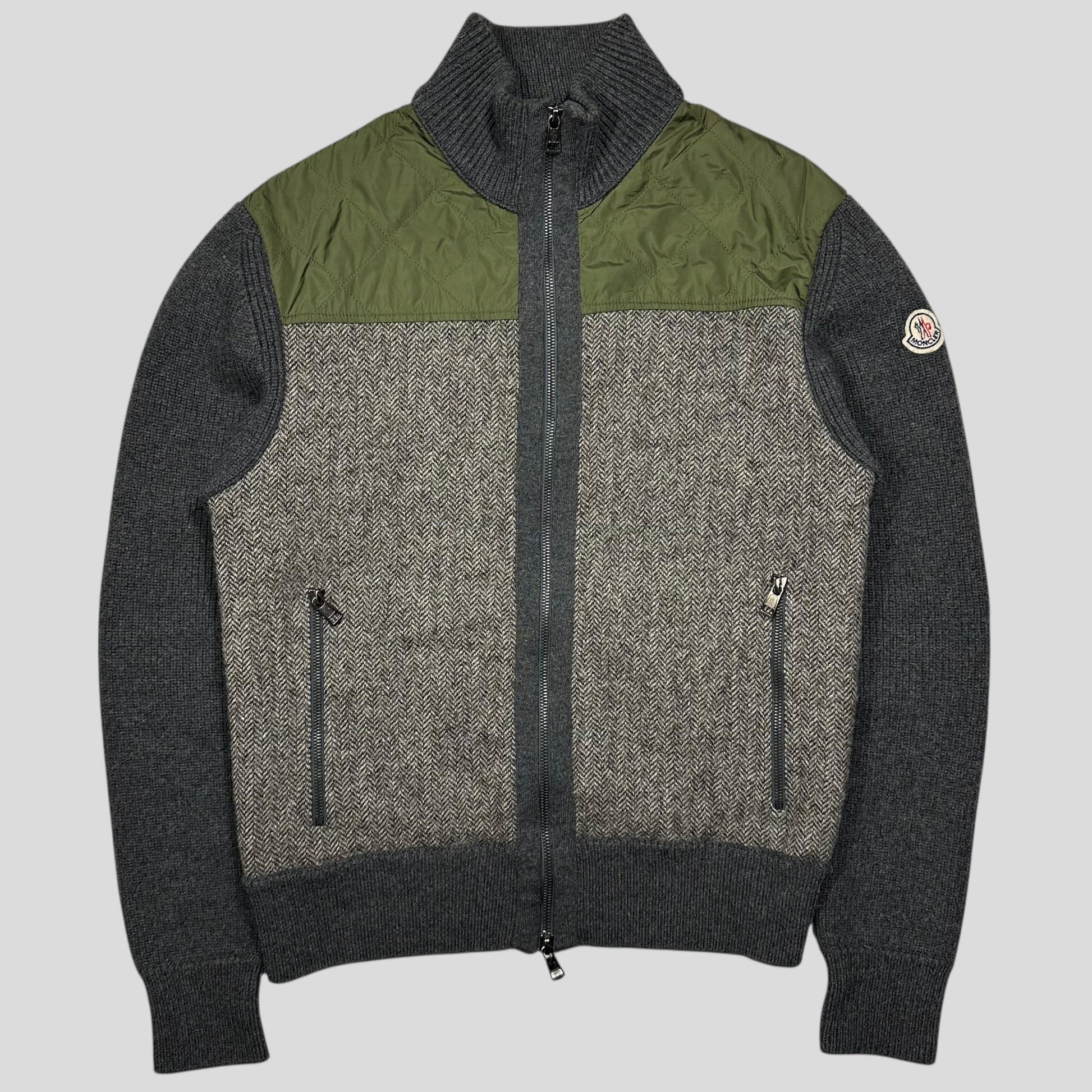Moncler Hybrid heavy virgin wool and padded quilted nylon, beautiful houndstooth panel with grey wool arms, Moncler rooster logo patch to arm, zip hand pockets and twin zip front, very warm cozy piece.