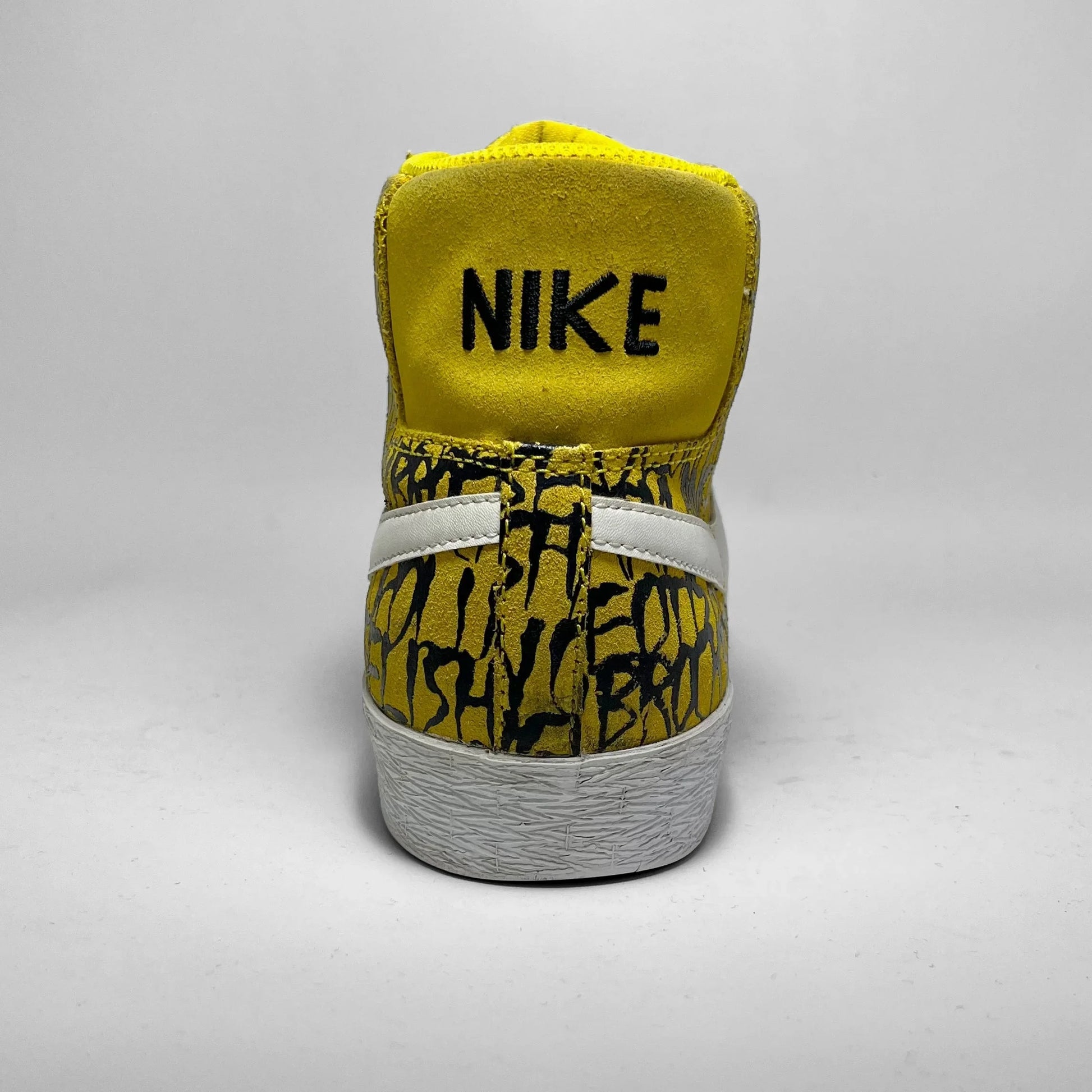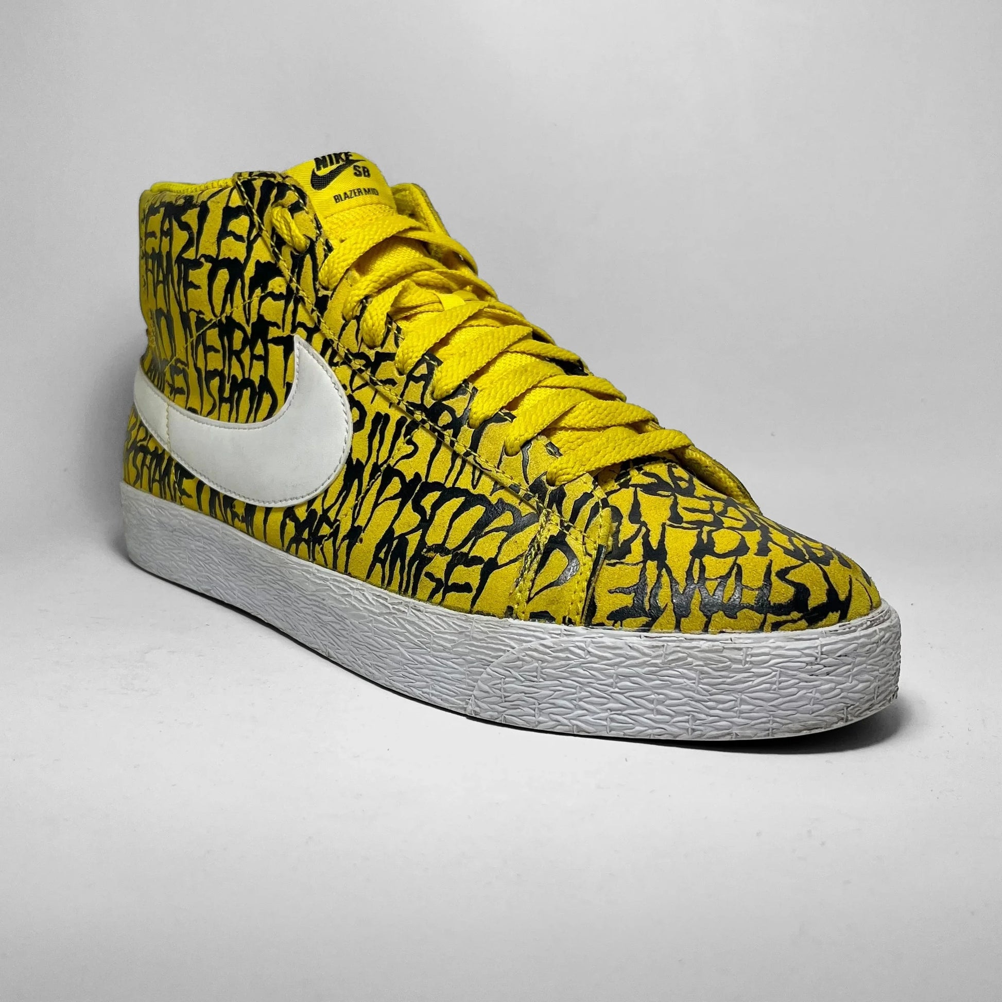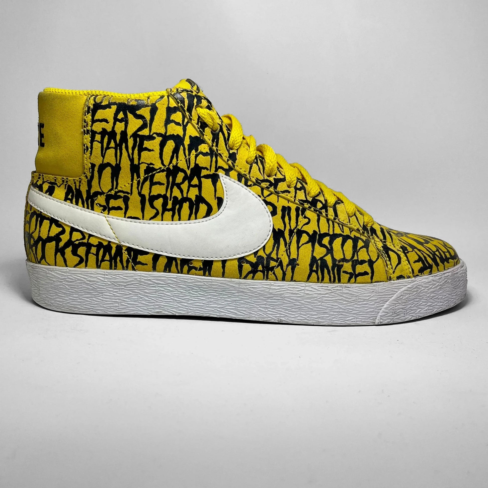 The Nike SB Blazer Mid “Neckface” (2013), also known as “The Chronicle,” is a bold skate shoe collaboration between Nike SB and the graffiti artist Neckface. It features a vibrant yellow suede upper covered in Neckface’s signature black handwritten-style graphics, with all the Nike SB’s team riders names. The white leather Swoosh and heel tab contrast sharply with the chaotic artwork, while the gum sole provides classic grip. Released alongside Nike SB’s Chronicles Vol. 1/2 skate video.