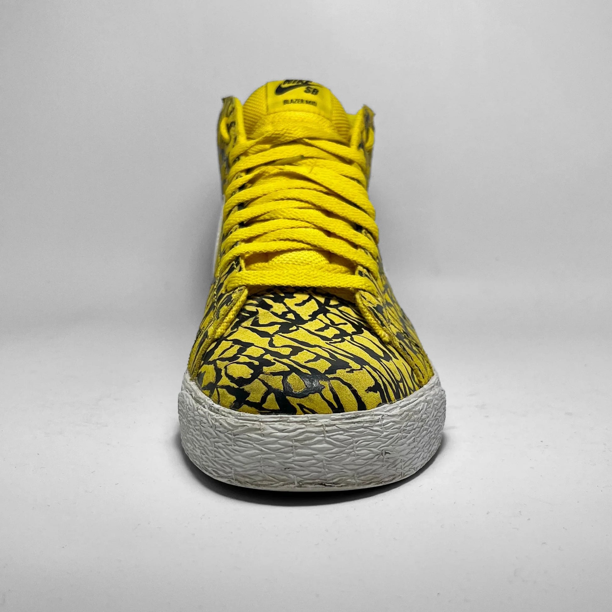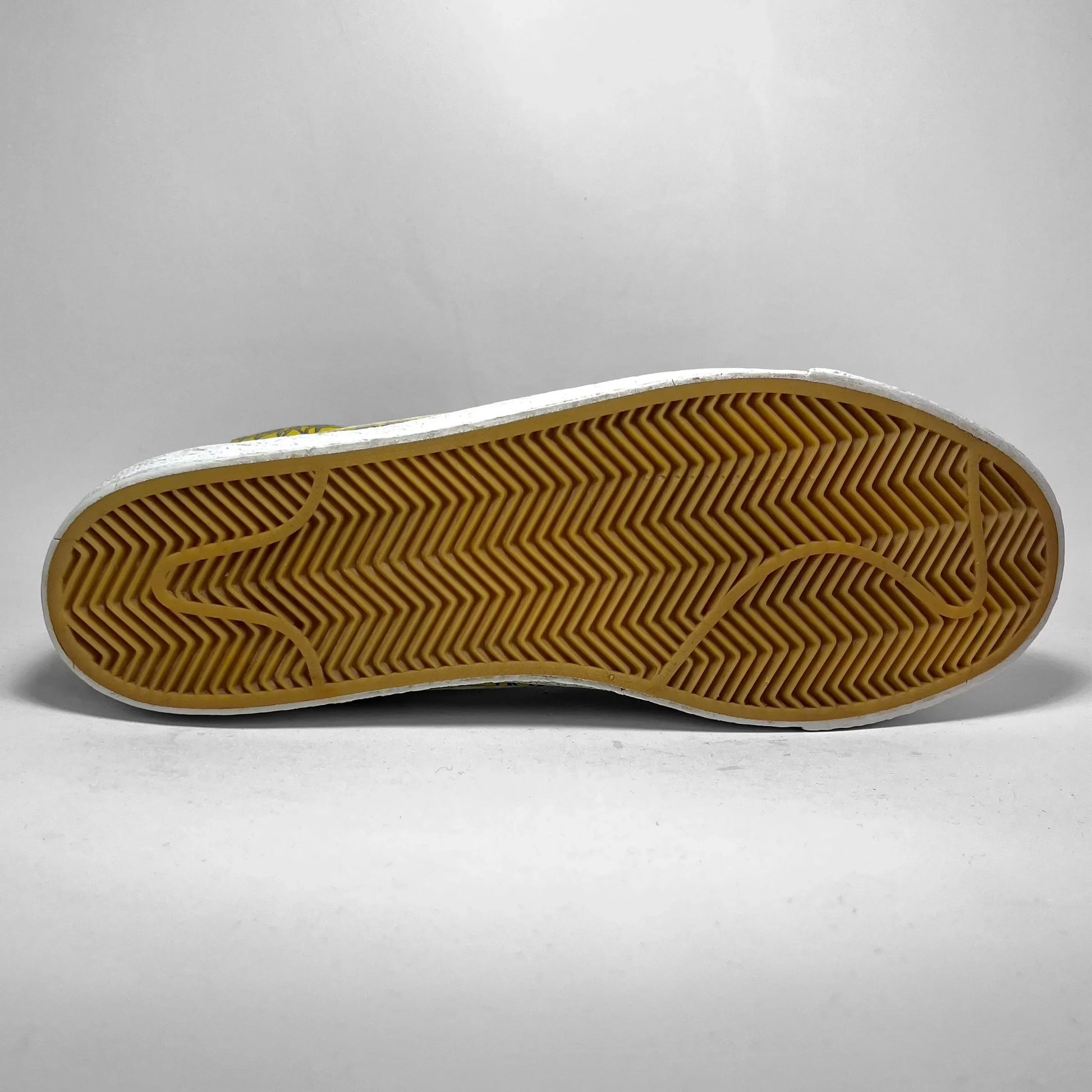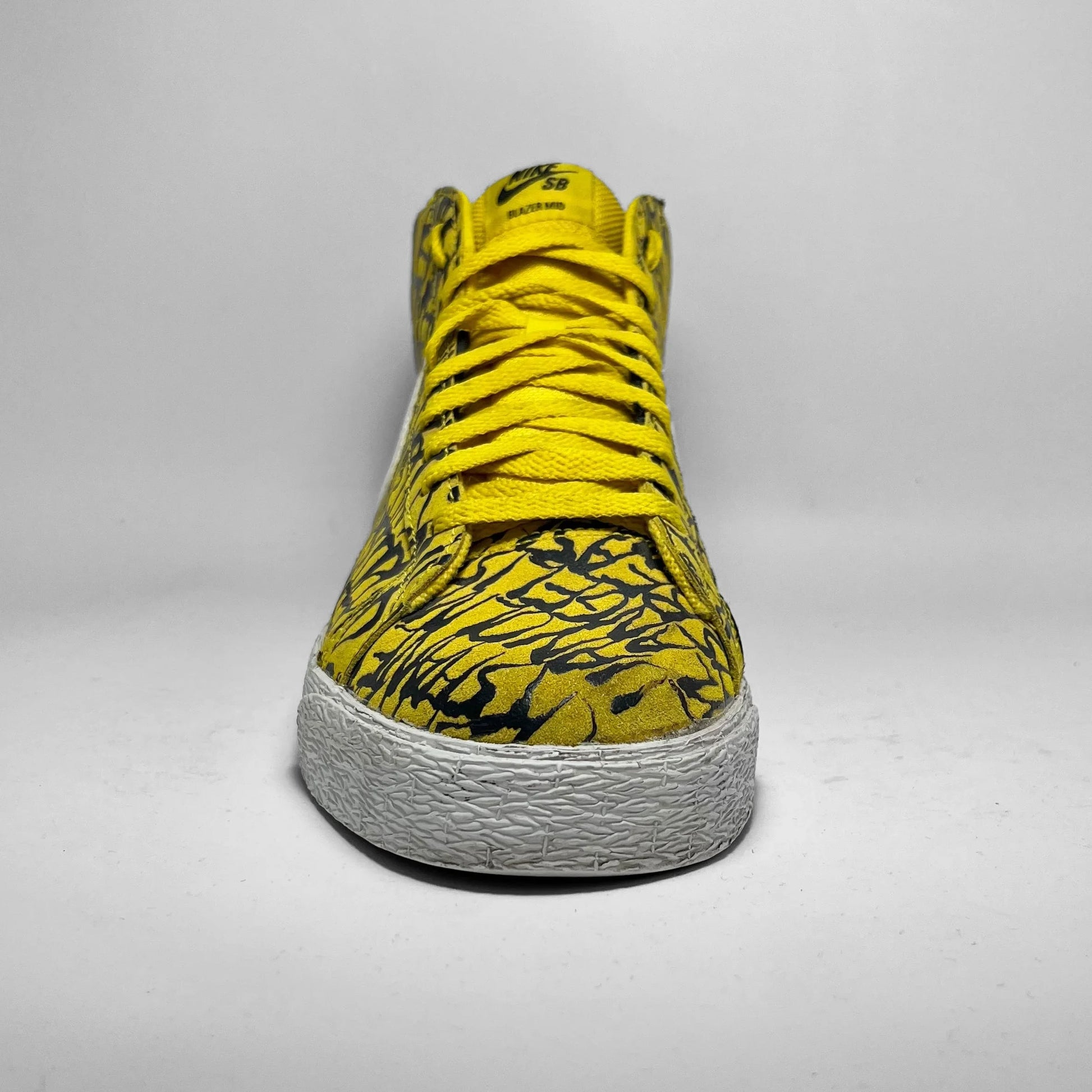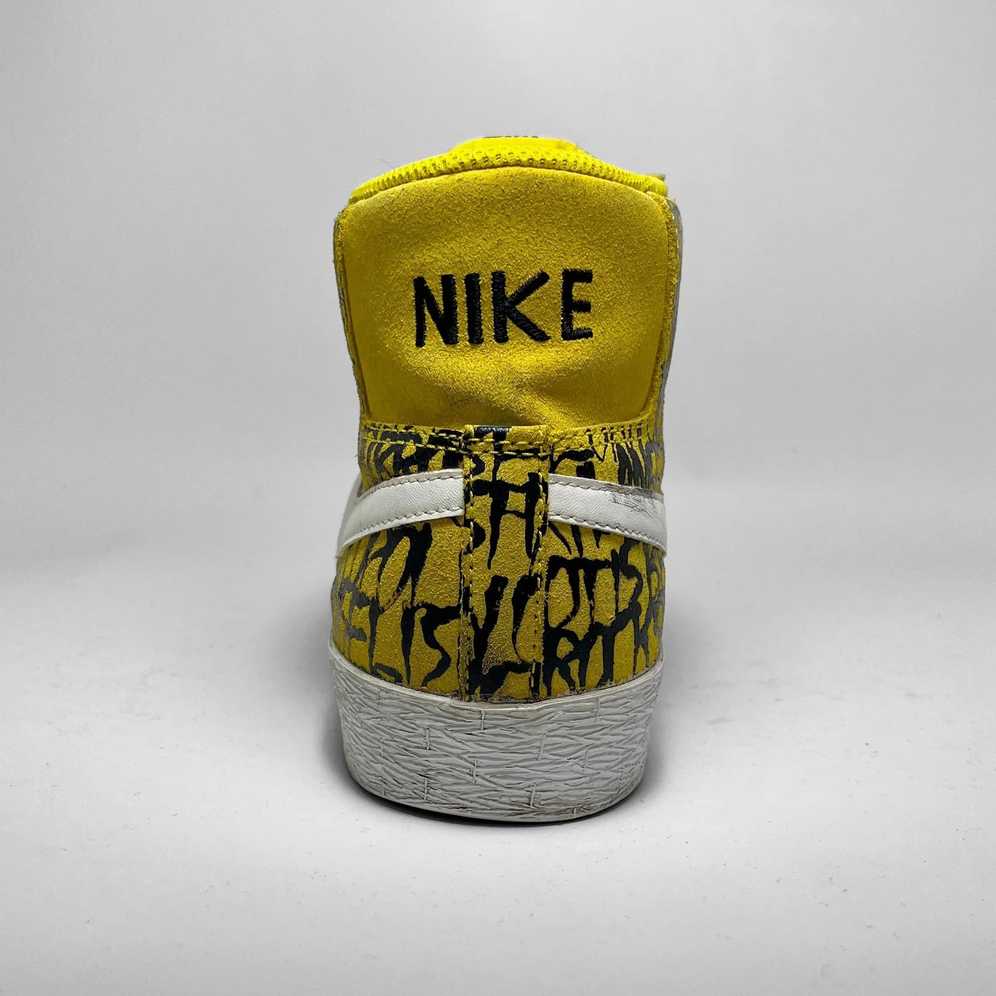 The Nike SB Blazer Mid “Neckface” (2013), also known as “The Chronicle,” is a bold skate shoe collaboration between Nike SB and the graffiti artist Neckface. It features a vibrant yellow suede upper covered in Neckface’s signature black handwritten-style graphics, with all the Nike SB’s team riders names. The white leather Swoosh and heel tab contrast sharply with the chaotic artwork, while the gum sole provides classic grip. Released alongside Nike SB’s Chronicles Vol. 1/2 skate video.
