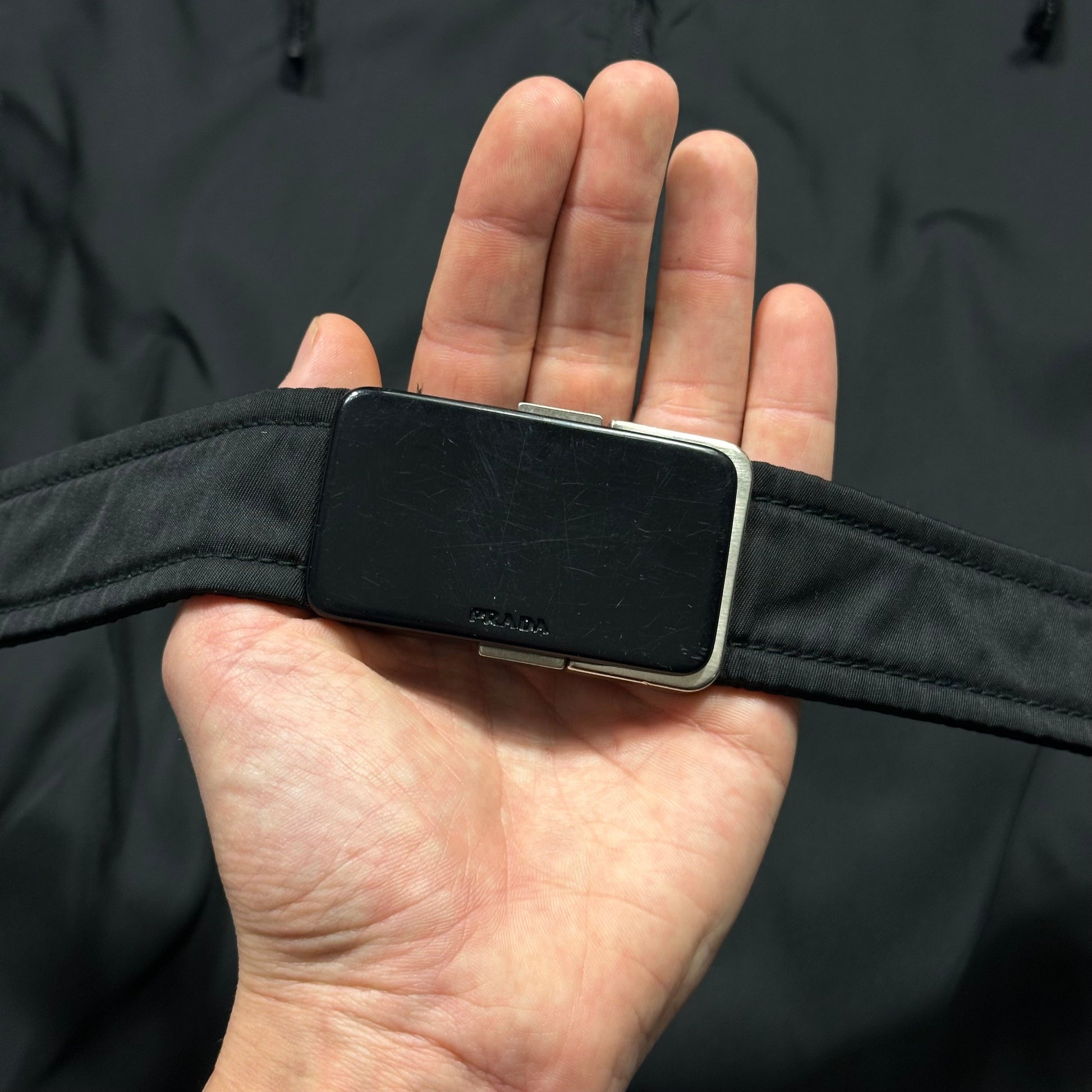 Prada 1990’s black nylon quilted parka jacket with removable metal clasp logo belt and removable hood, collared neck that can be folded up, lovely warm yet light rayon quilting inside, Prada drawstrings to hood, zip hand pockets to front.