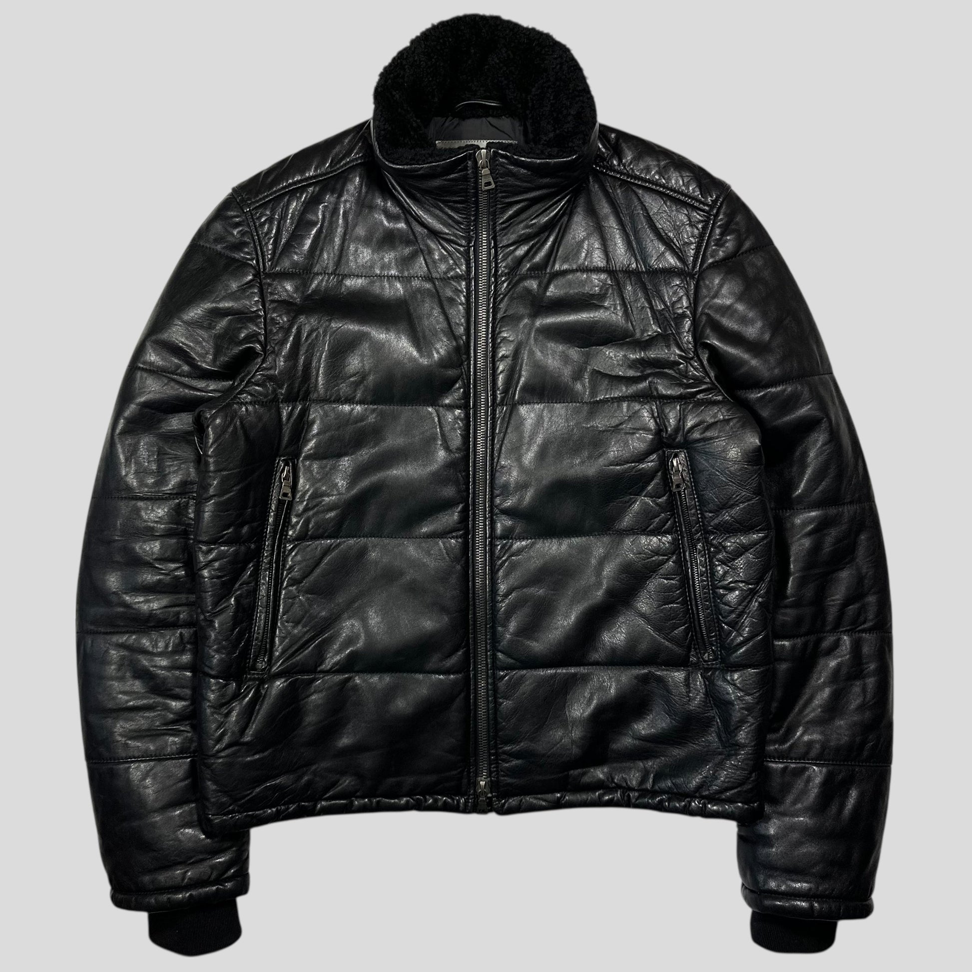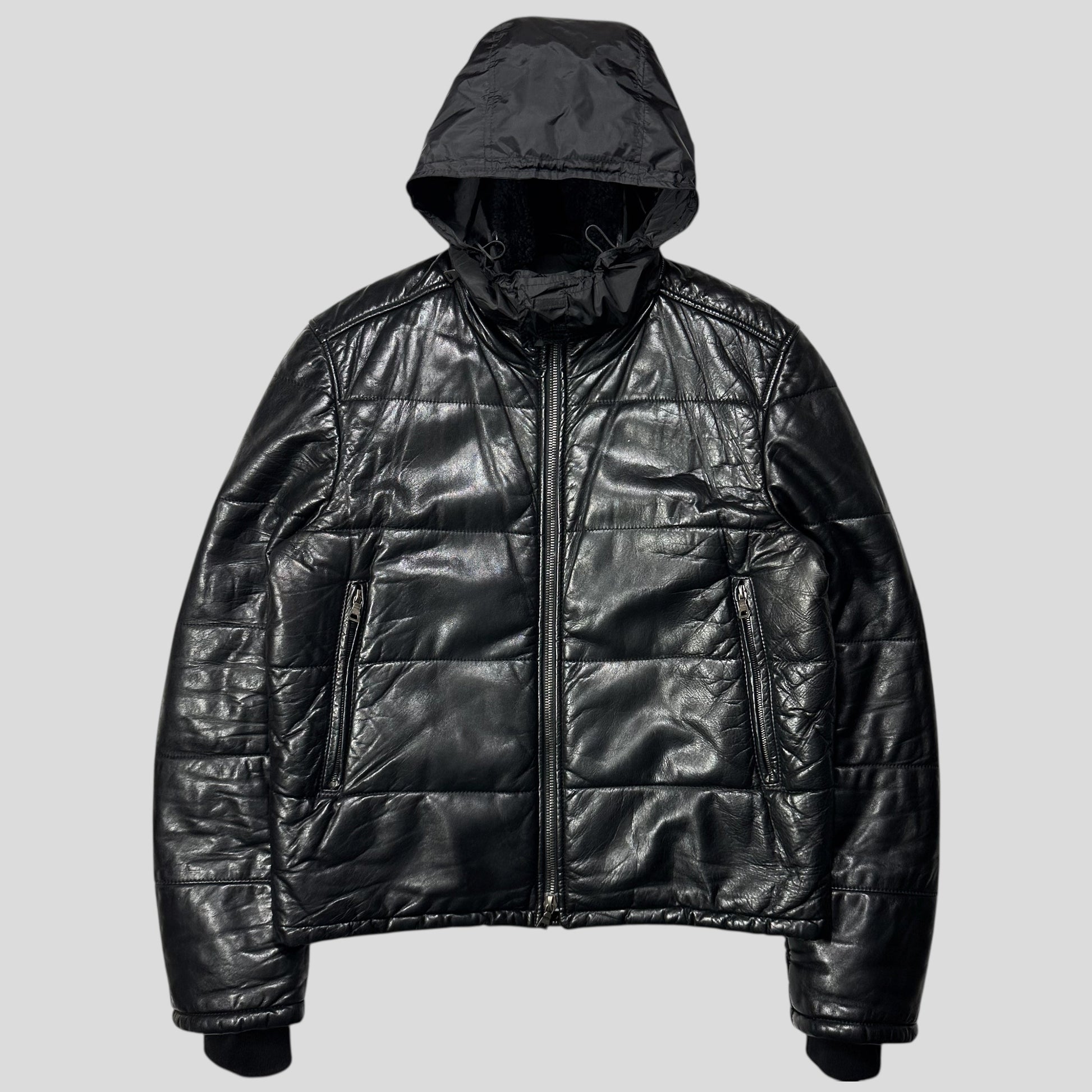 Incredible Prada Sport early 2000’s full real black leather puffer jacket with shearling sherpa sheep fur collar, packable zip away black nylon hood, obscenely high quality premium piece, retailed for £4500+ and would likely retail at over £12000 now, this is the most luxury Prada leather I’ve ever seen, the detailing and quality is endless.