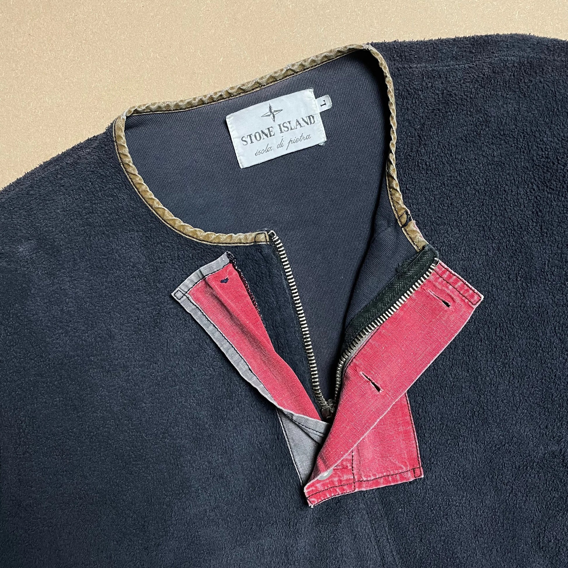 Designed by Massimo Osti from Stone Island’s first season. Highly rare and iconic early 80s piece filled with details. Comprised of teddy cotton fabric complete with Tela Stella appliqués like pocket details, zip cover, neck line reinforcement and waistline contrast.