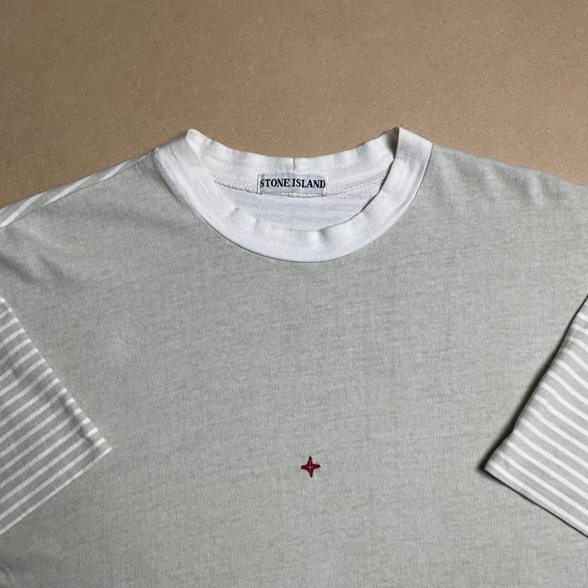Designed by Massimo Osti. Iconic 80s design. Contrasting block colour front with an embroidered centre mini compass, white Breton collar. Striped back complete with Marina spell out “box logo”.